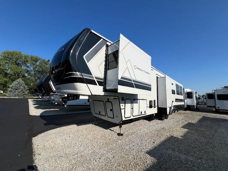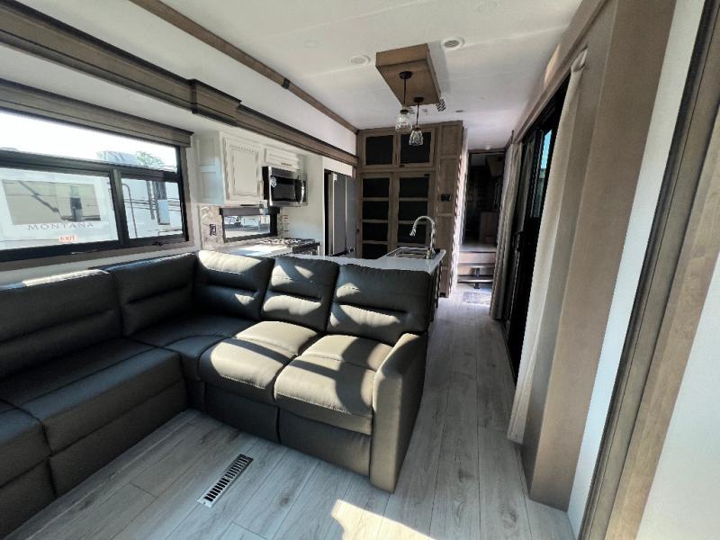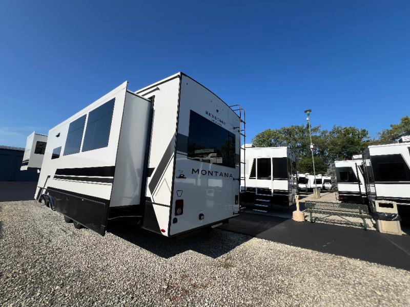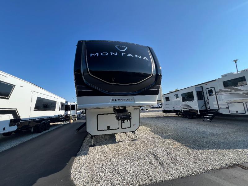 Enjoy luxury, innovation, and the outdoors in any one of Montana's finest fifth wheels. Each set the standard with exceptional features, and exciting factory installed options to provide you a great home on the road. Keystone's 12" I-beam chassis with z-frame technology provides a strong and durable foundation to your fifth wheel, and the four season living package will help extend your camping season. A few other construction features you will appreciate include a MORryde CRE3000 suspension, a fully walkable roof with an alpha seamless TPO membrane system, and 4k square frameless tinted safety glass windows. Each feature stylish interiors with two decor choices paired with beautiful hardwood cabinetry, Beauflor vinyl flooring throughout, central vacuum, plus a La-Z-Boy furniture package for all-around comfort!