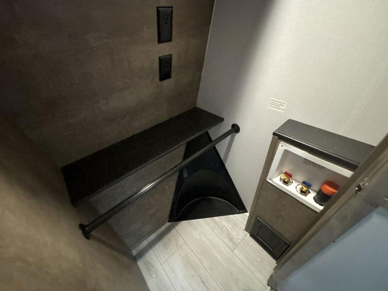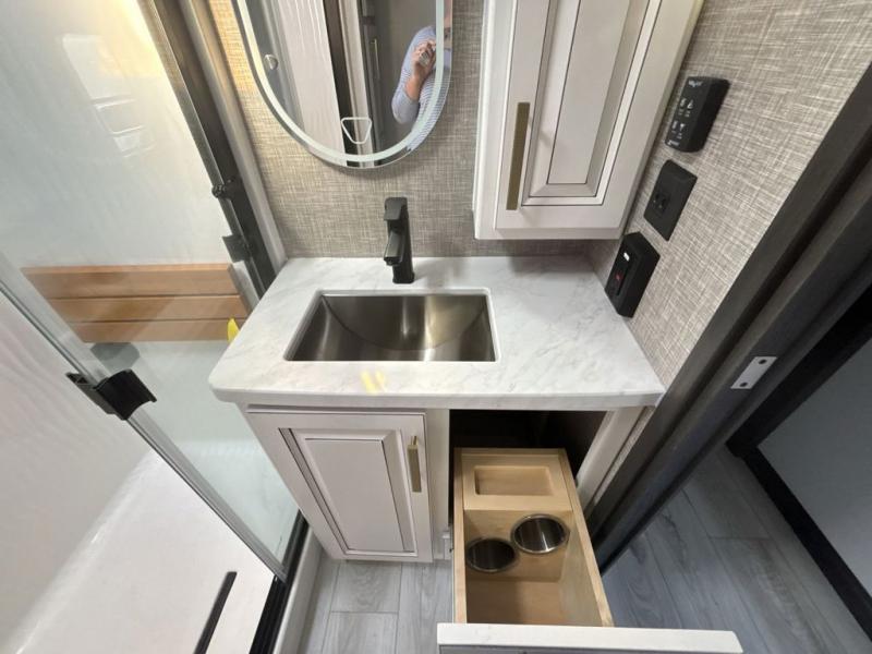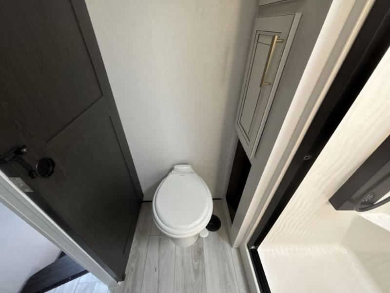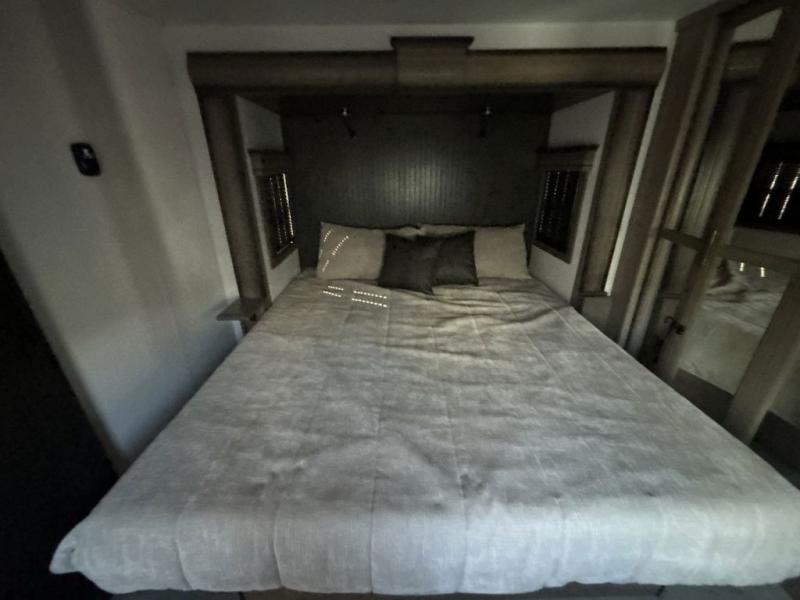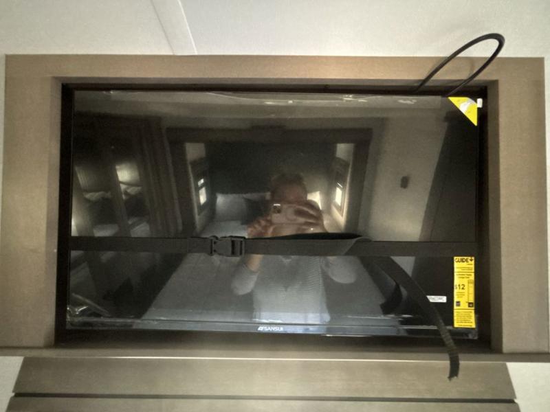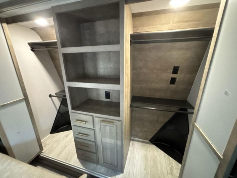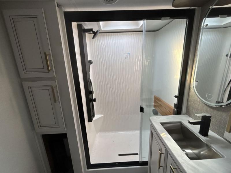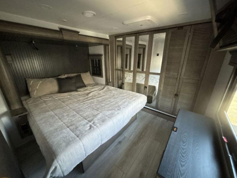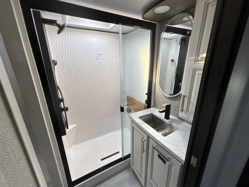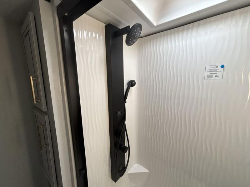 Luxury abounds throughout this fifth wheel starting in the centrally located kitchen featuring an L-shaped counter, a pull down storage pantry, a 24" range with an overhead convection microwave, and an 18 cu. ft. residential refrigerator with ice an maker. Just up the steps to the right of the entry, you will find a spacious bathroom featuring a 48" x 30" fiberglass shower with a seat, decorative glass enclosure, linen cabinet, and skylight above it for more natural lighting. Sleep like a baby in the front private bedroom on the king bed slide with storage underneath, and keep your clothes looking their best with the front closets. The rear entertainment living area offers true relaxation with L-shaped seating including a hide-a-bed sofa along the roadside, and powered theater seating facing the entertainment center with a 5,000 BTU decorative fireplace heater and Smart TV to watch your favorite movies! And don't overlook the best part, the powered side patio to entertain guests!