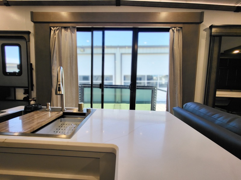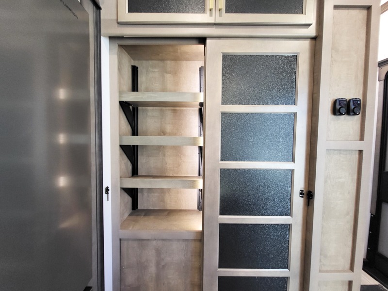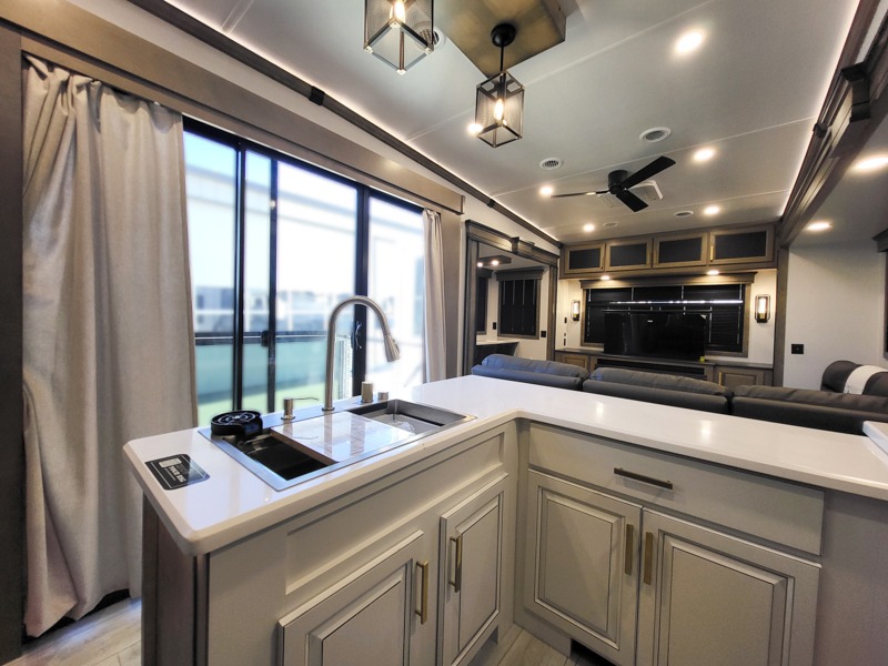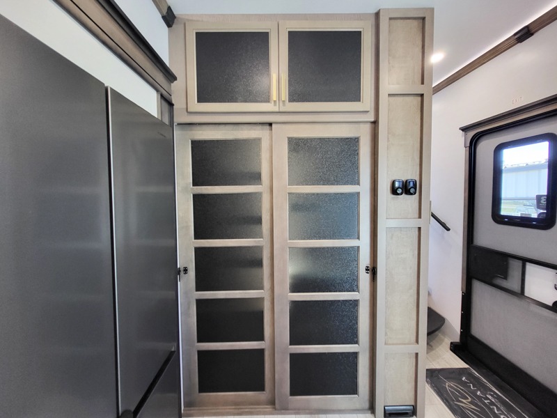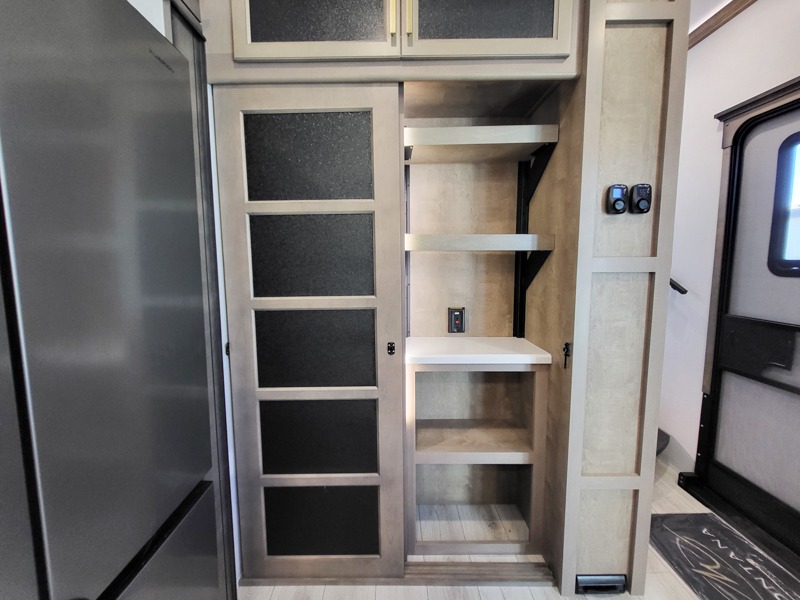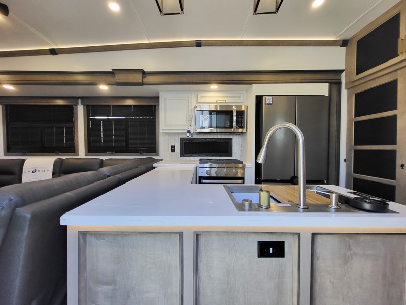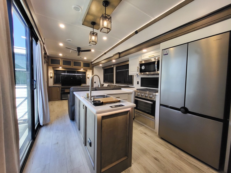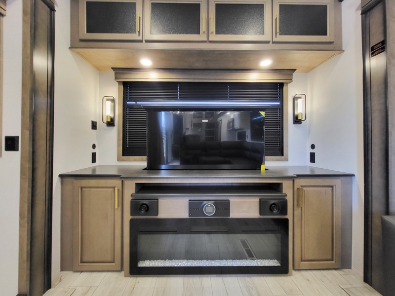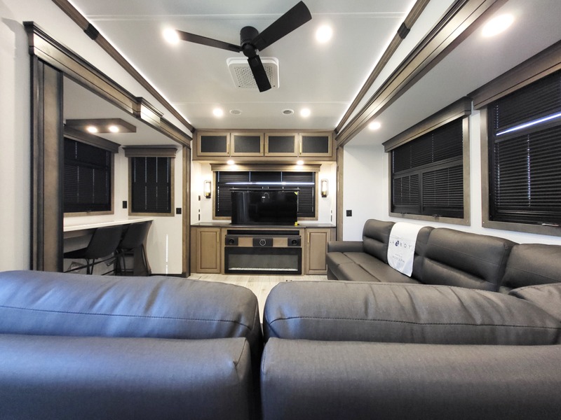 Luxury abounds throughout this fifth wheel starting in the centrally located kitchen featuring an L-shaped counter, a pull down storage pantry, a 24" range with an overhead convection microwave, and an 18 cu. ft. residential refrigerator with ice an maker. Just up the steps to the right of the entry, you will find a spacious bathroom featuring a 48" x 30" fiberglass shower with a seat, decorative glass enclosure, linen cabinet, and skylight above it for more natural lighting. Sleep like a baby in the front private bedroom on the king bed slide with storage underneath, and keep your clothes looking their best with the front closets. The rear entertainment living area offers true relaxation with L-shaped seating including a hide-a-bed sofa along the roadside, and powered theater seating facing the entertainment center with a 5,000 BTU decorative fireplace heater and Smart TV to watch your favorite movies! And don't overlook the best part, the powered side patio to entertain guests!