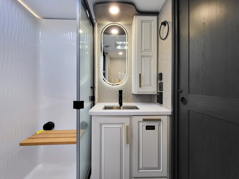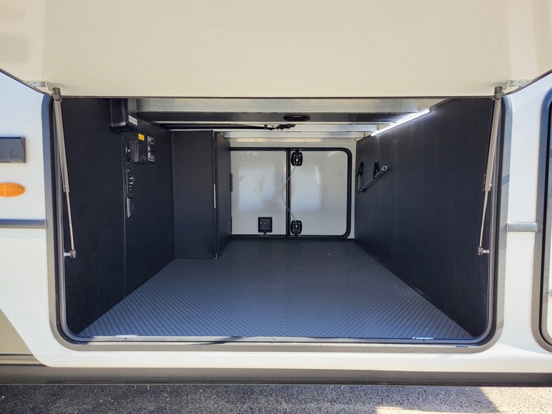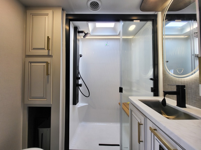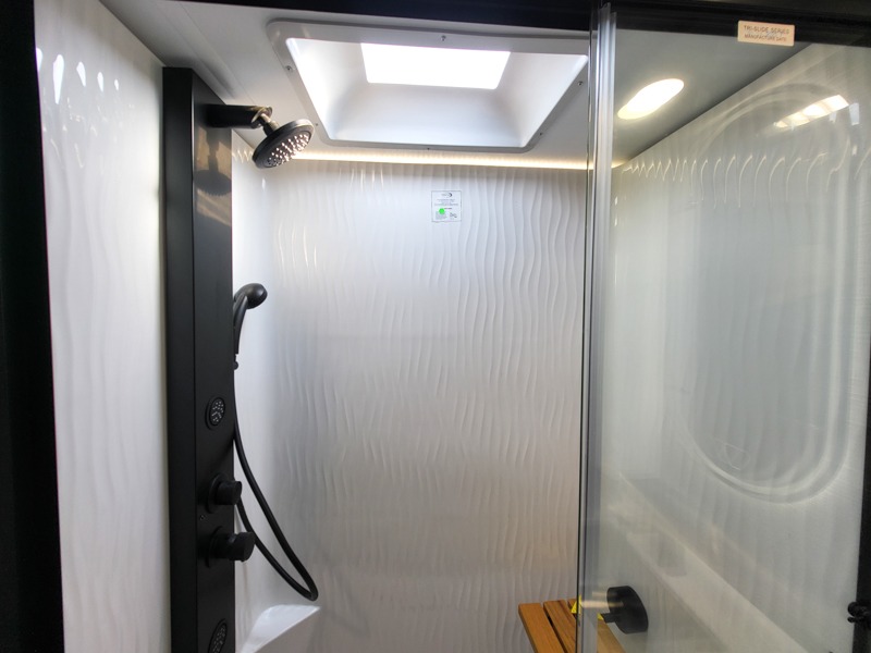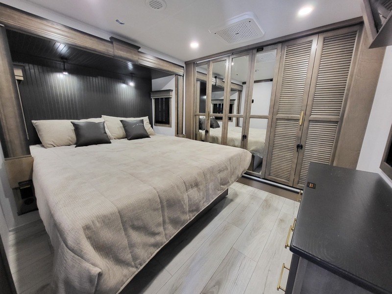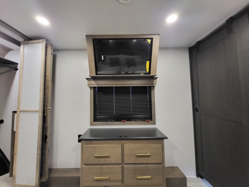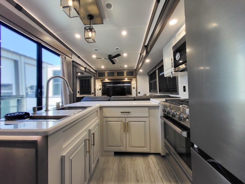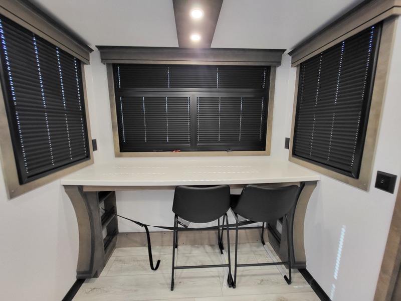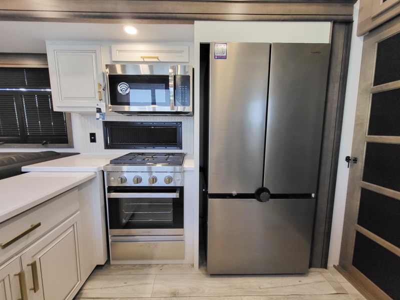 Luxury abounds throughout this fifth wheel starting in the centrally located kitchen featuring an L-shaped counter, a pull down storage pantry, a 24" range with an overhead convection microwave, and an 18 cu. ft. residential refrigerator with ice an maker. Just up the steps to the right of the entry, you will find a spacious bathroom featuring a 48" x 30" fiberglass shower with a seat, decorative glass enclosure, linen cabinet, and skylight above it for more natural lighting. Sleep like a baby in the front private bedroom on the king bed slide with storage underneath, and keep your clothes looking their best with the front closets. The rear entertainment living area offers true relaxation with L-shaped seating including a hide-a-bed sofa along the roadside, and powered theater seating facing the entertainment center with a 5,000 BTU decorative fireplace heater and Smart TV to watch your favorite movies! And don't overlook the best part, the powered side patio to entertain guests!