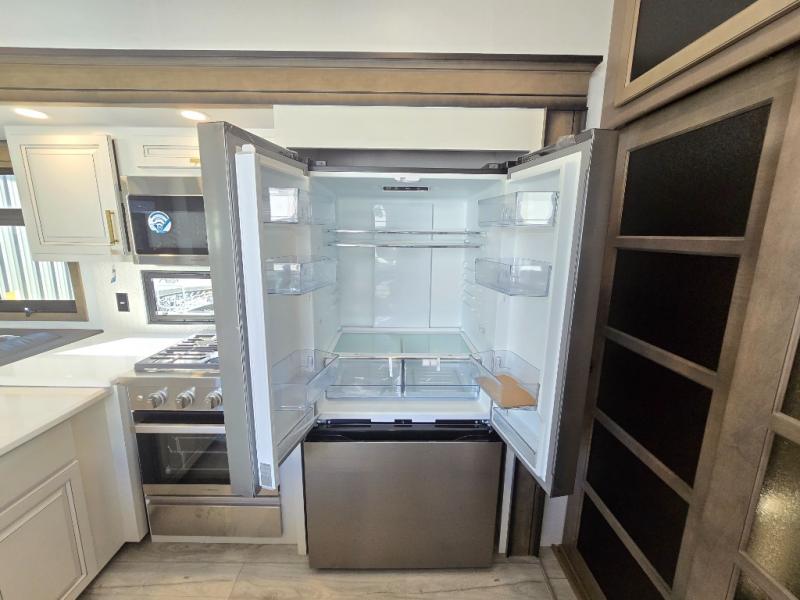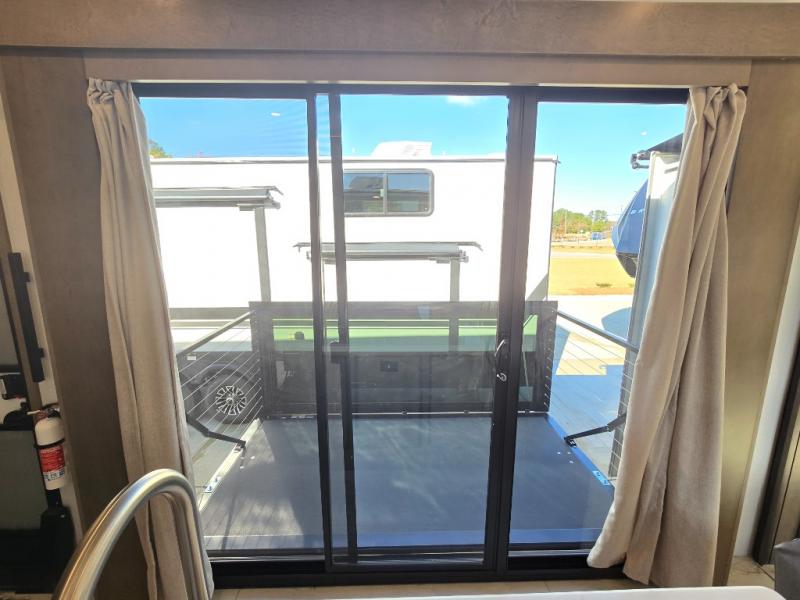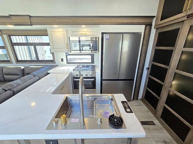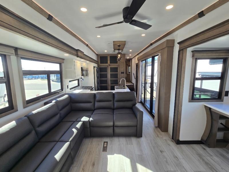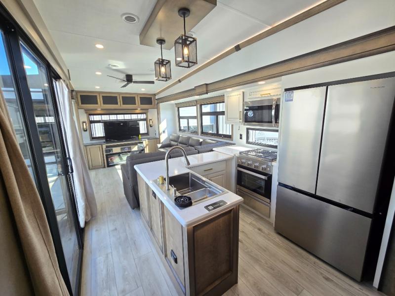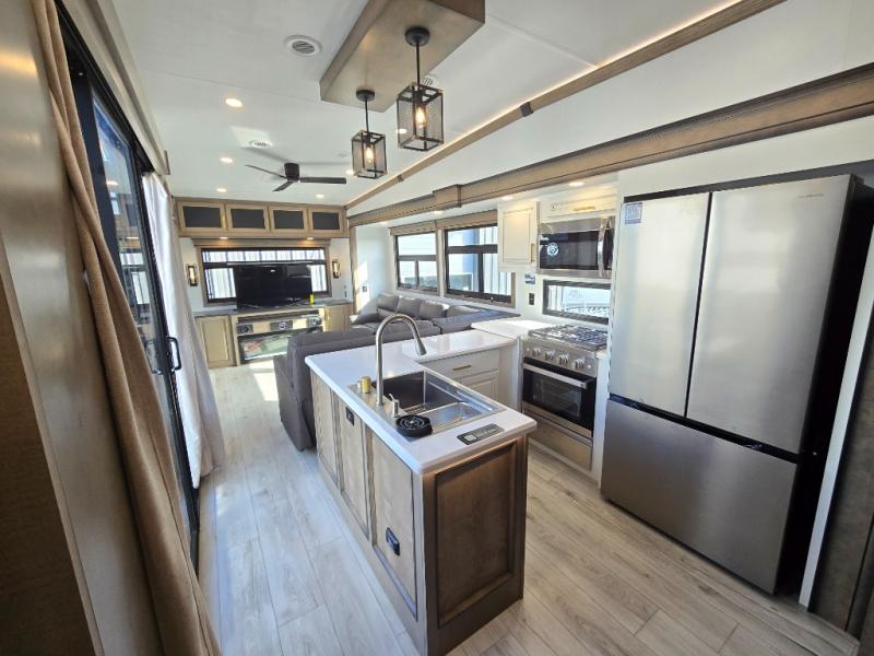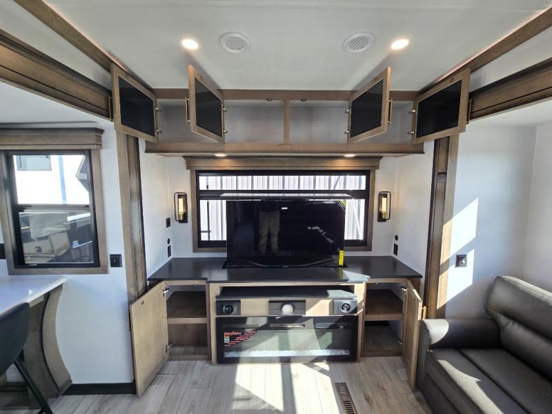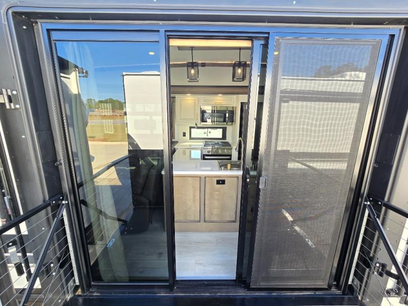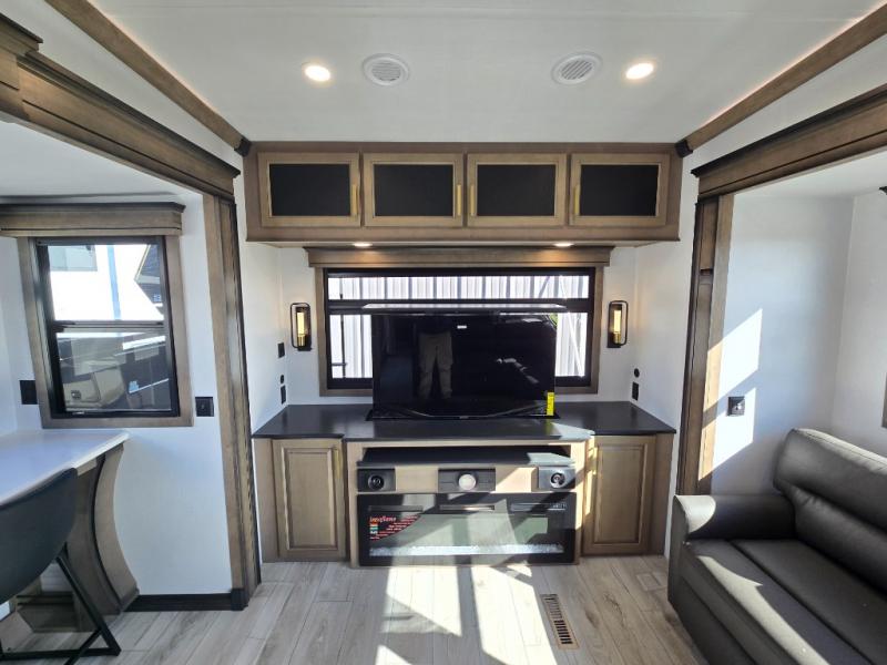 Luxury abounds throughout this fifth wheel starting in the centrally located kitchen featuring an L-shaped counter, a pull down storage pantry, a 24" range with an overhead convection microwave, and an 18 cu. ft. residential refrigerator with ice an maker. Just up the steps to the right of the entry, you will find a spacious bathroom featuring a 48" x 30" fiberglass shower with a seat, decorative glass enclosure, linen cabinet, and skylight above it for more natural lighting. Sleep like a baby in the front private bedroom on the king bed slide with storage underneath, and keep your clothes looking their best with the front closets. The rear entertainment living area offers true relaxation with L-shaped seating including a hide-a-bed sofa along the roadside, and powered theater seating facing the entertainment center with a 5,000 BTU decorative fireplace heater and Smart TV to watch your favorite movies! And don't overlook the best part, the powered side patio to entertain guests!