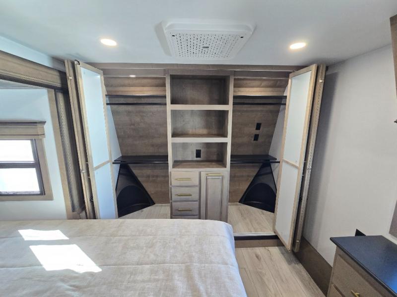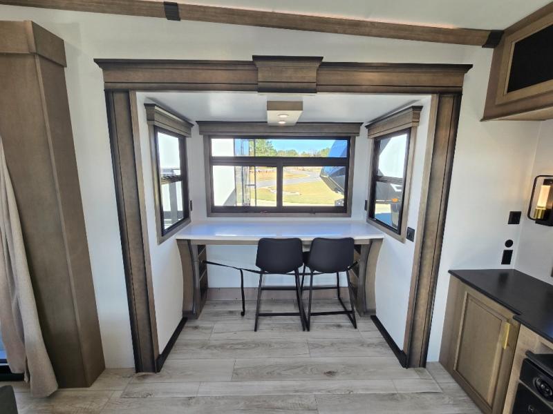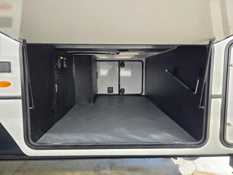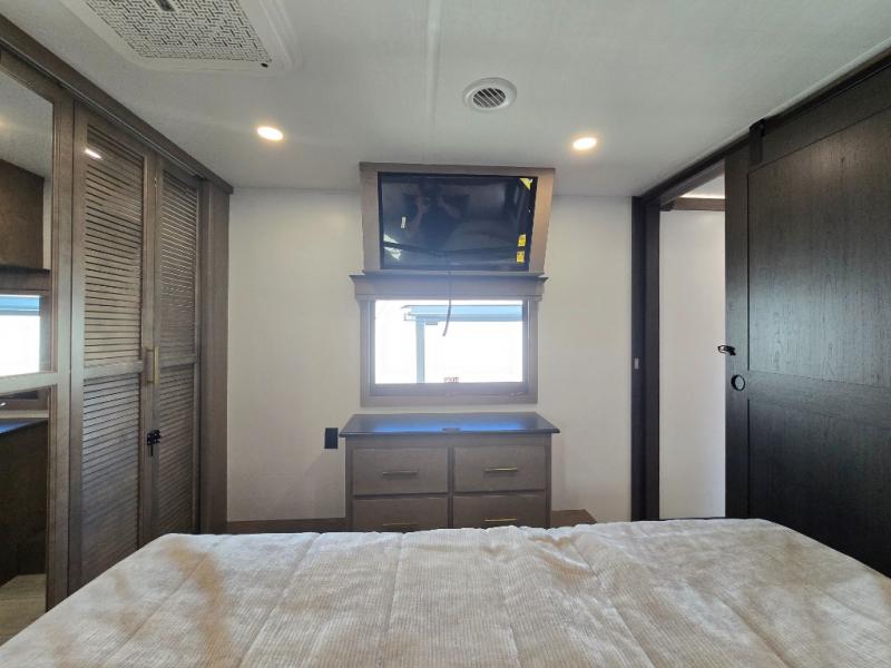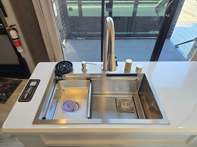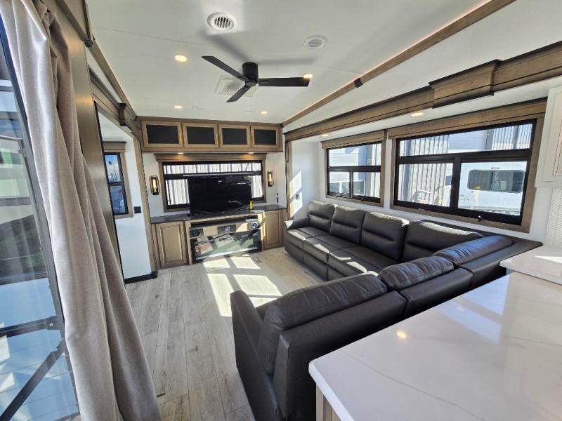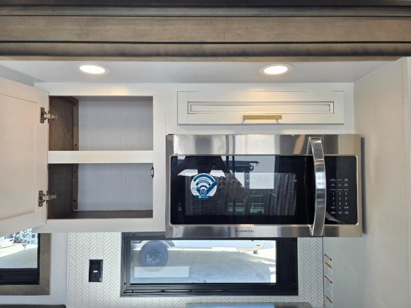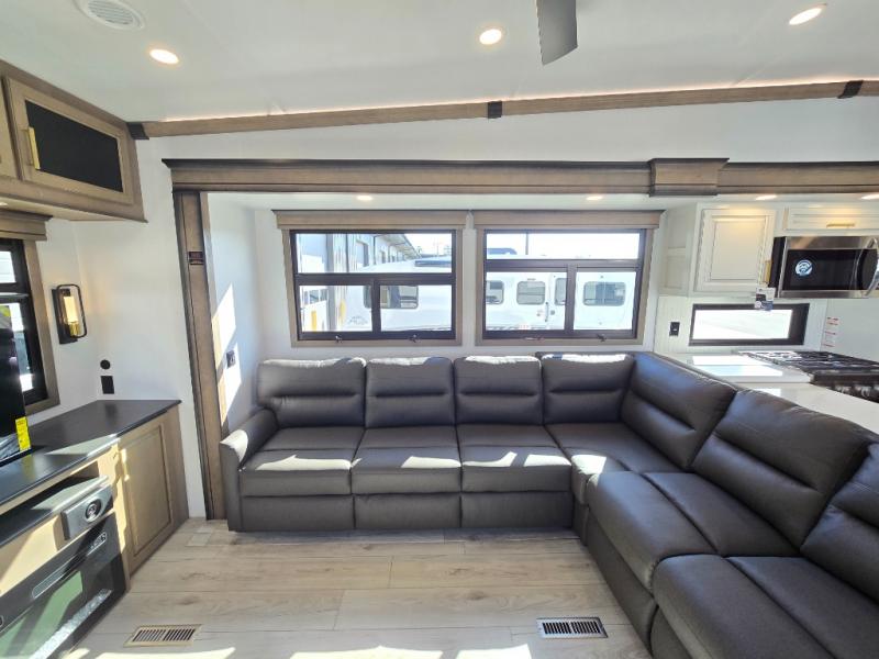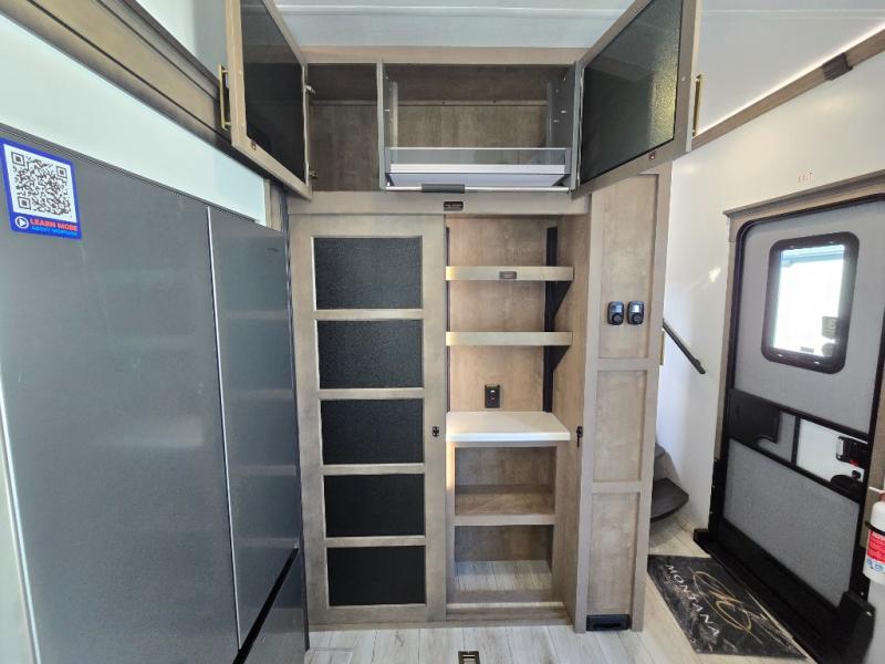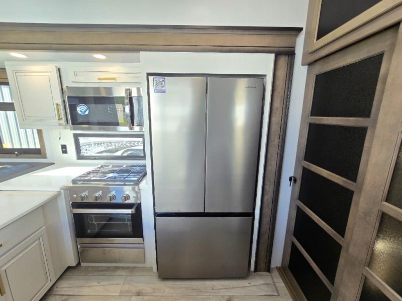 Luxury abounds throughout this fifth wheel starting in the centrally located kitchen featuring an L-shaped counter, a pull down storage pantry, a 24" range with an overhead convection microwave, and an 18 cu. ft. residential refrigerator with ice an maker. Just up the steps to the right of the entry, you will find a spacious bathroom featuring a 48" x 30" fiberglass shower with a seat, decorative glass enclosure, linen cabinet, and skylight above it for more natural lighting. Sleep like a baby in the front private bedroom on the king bed slide with storage underneath, and keep your clothes looking their best with the front closets. The rear entertainment living area offers true relaxation with L-shaped seating including a hide-a-bed sofa along the roadside, and powered theater seating facing the entertainment center with a 5,000 BTU decorative fireplace heater and Smart TV to watch your favorite movies! And don't overlook the best part, the powered side patio to entertain guests!