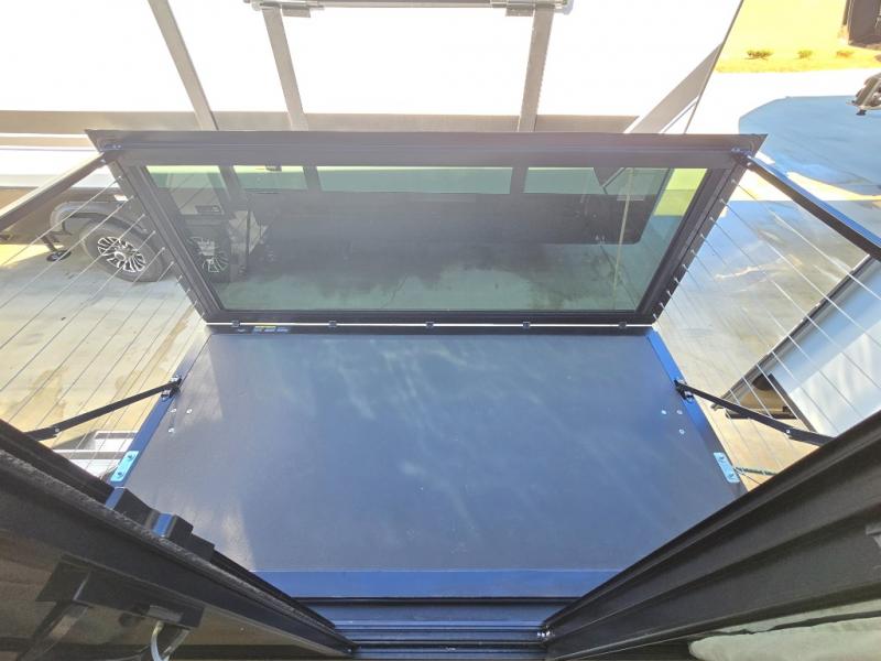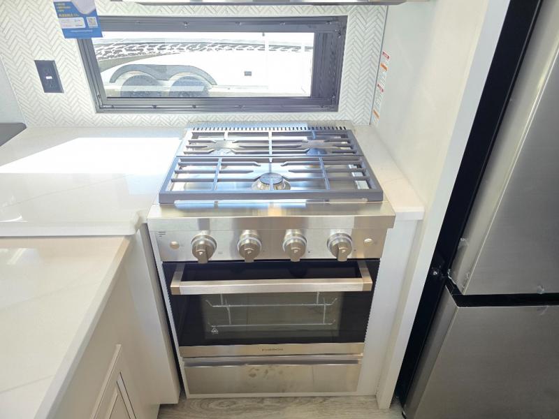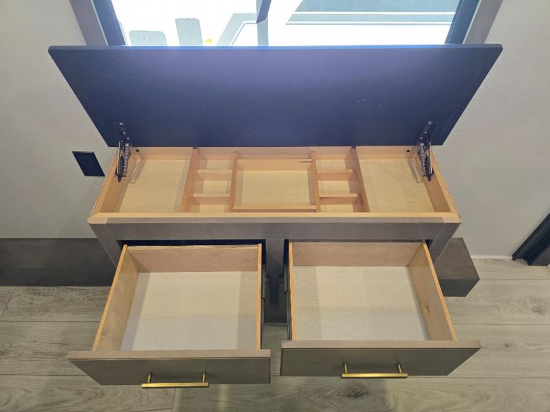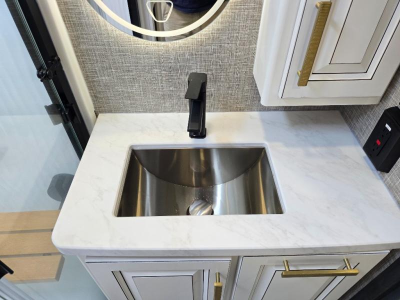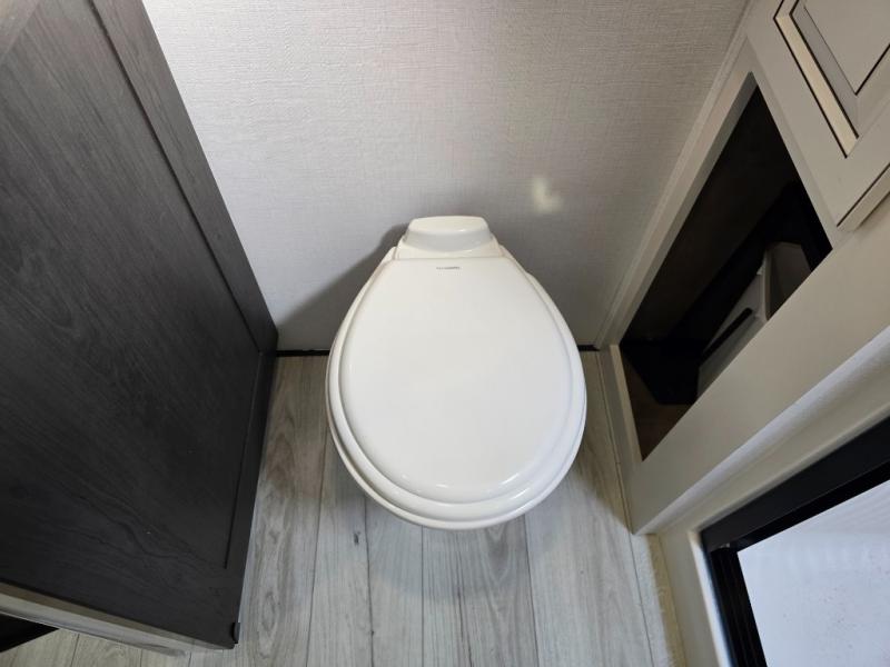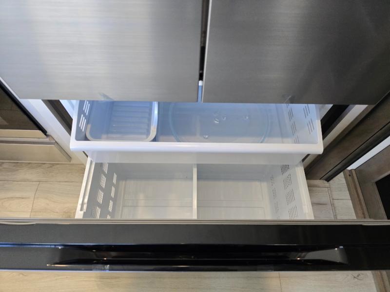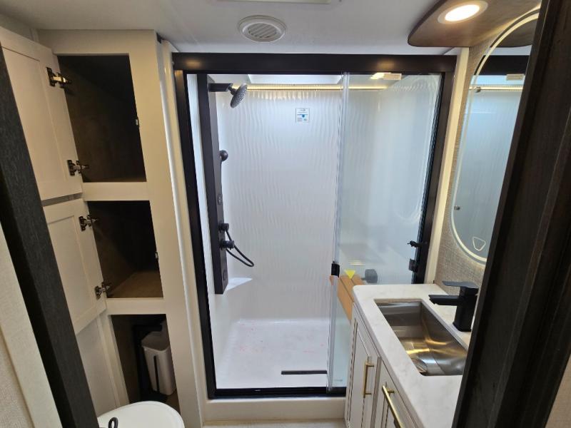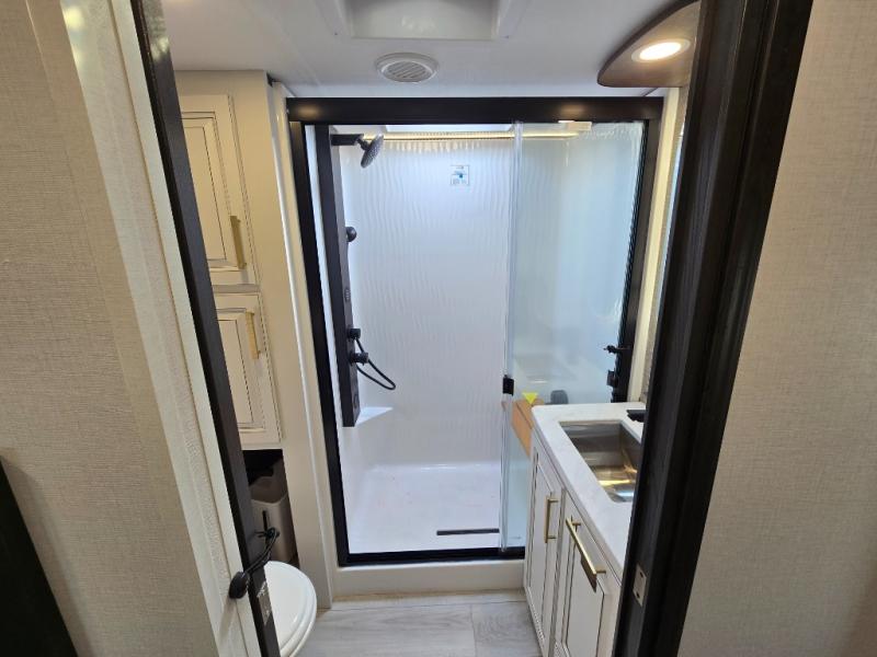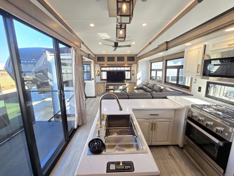 Luxury abounds throughout this fifth wheel starting in the centrally located kitchen featuring an L-shaped counter, a pull down storage pantry, a 24" range with an overhead convection microwave, and an 18 cu. ft. residential refrigerator with ice an maker. Just up the steps to the right of the entry, you will find a spacious bathroom featuring a 48" x 30" fiberglass shower with a seat, decorative glass enclosure, linen cabinet, and skylight above it for more natural lighting. Sleep like a baby in the front private bedroom on the king bed slide with storage underneath, and keep your clothes looking their best with the front closets. The rear entertainment living area offers true relaxation with L-shaped seating including a hide-a-bed sofa along the roadside, and powered theater seating facing the entertainment center with a 5,000 BTU decorative fireplace heater and Smart TV to watch your favorite movies! And don't overlook the best part, the powered side patio to entertain guests!