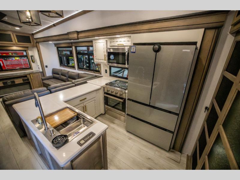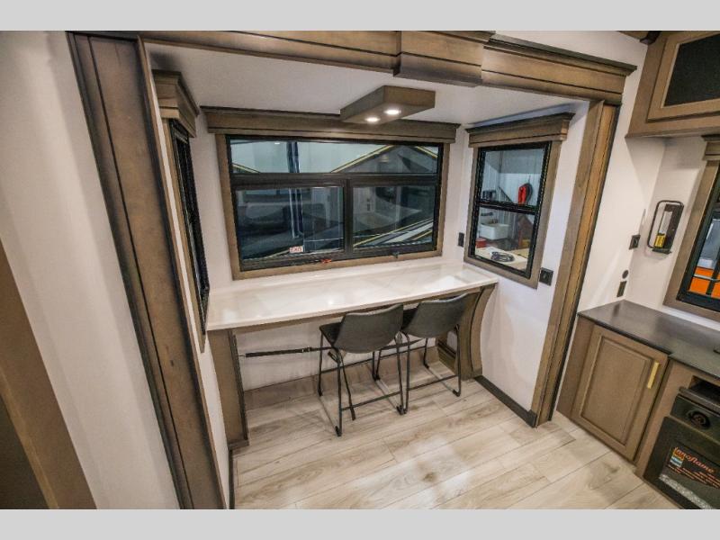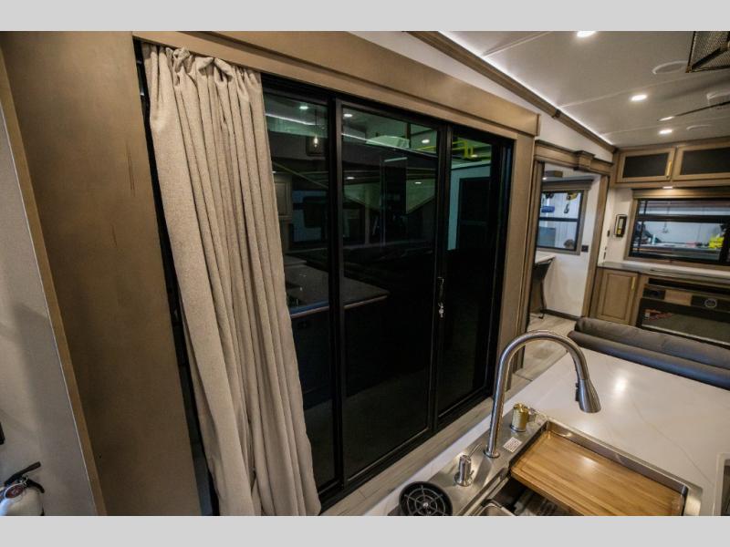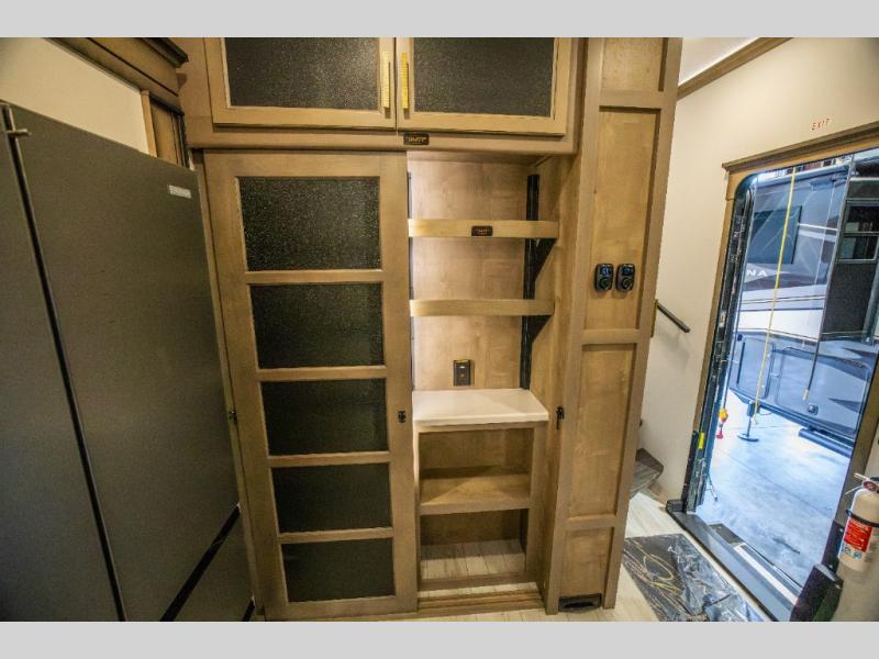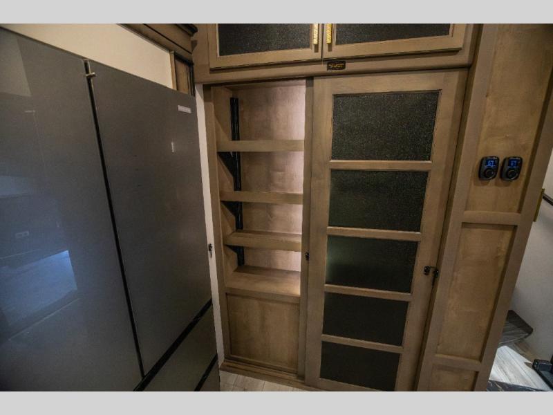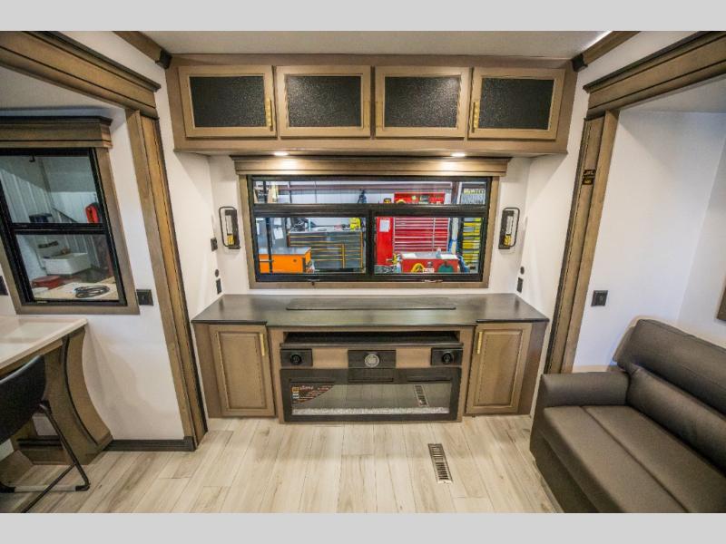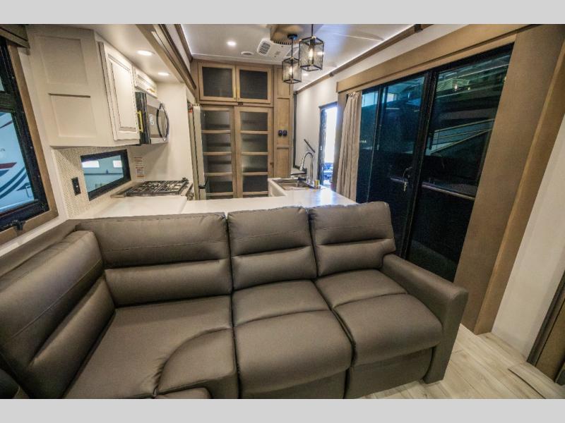 Luxury abounds throughout this fifth wheel starting in the centrally located kitchen featuring an L-shaped counter, a pull down storage pantry, a 24" range with an overhead convection microwave, and an 18 cu. ft. residential refrigerator with ice an maker. Just up the steps to the right of the entry, you will find a spacious bathroom featuring a 48" x 30" fiberglass shower with a seat, decorative glass enclosure, linen cabinet, and skylight above it for more natural lighting. Sleep like a baby in the front private bedroom on the king bed slide with storage underneath, and keep your clothes looking their best with the front closets. The rear entertainment living area offers true relaxation with L-shaped seating including a hide-a-bed sofa along the roadside, and powered theater seating facing the entertainment center with a 5,000 BTU decorative fireplace heater and Smart TV to watch your favorite movies! And don't overlook the best part, the powered side patio to entertain guests!