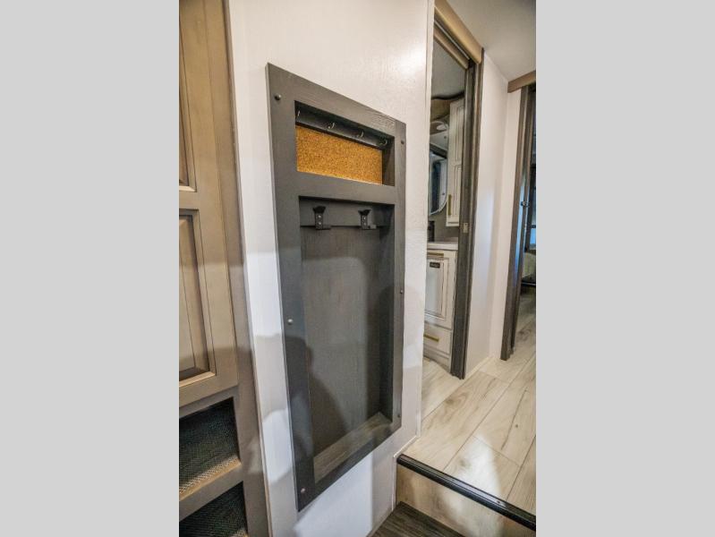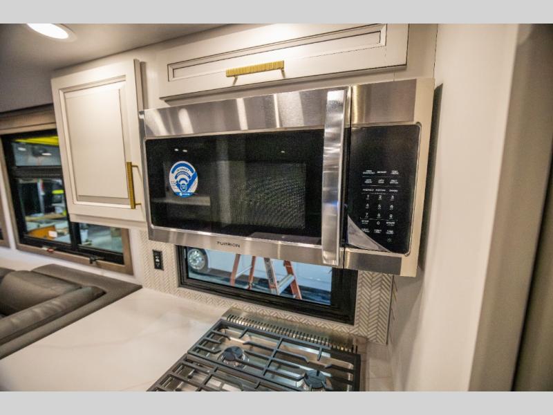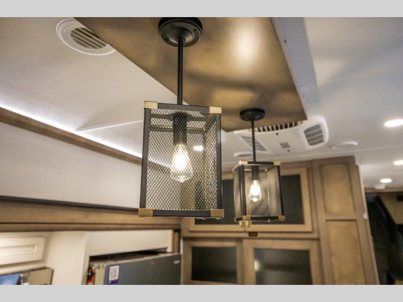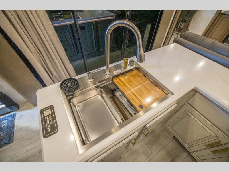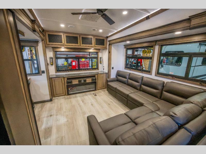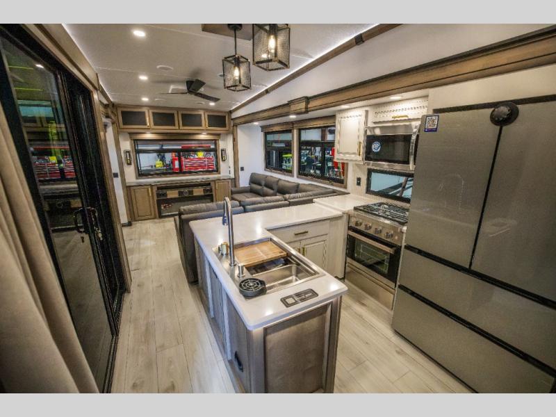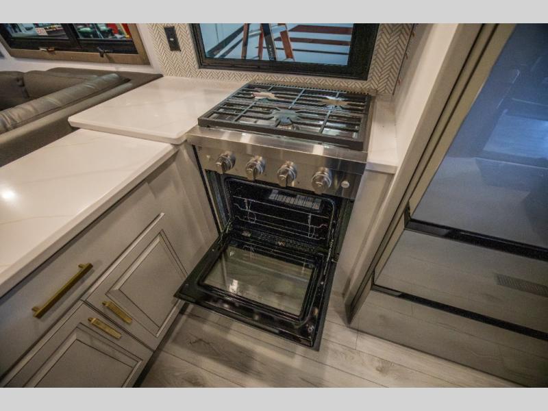 Luxury abounds throughout this fifth wheel starting in the centrally located kitchen featuring an L-shaped counter, a pull down storage pantry, a 24" range with an overhead convection microwave, and an 18 cu. ft. residential refrigerator with ice an maker. Just up the steps to the right of the entry, you will find a spacious bathroom featuring a 48" x 30" fiberglass shower with a seat, decorative glass enclosure, linen cabinet, and skylight above it for more natural lighting. Sleep like a baby in the front private bedroom on the king bed slide with storage underneath, and keep your clothes looking their best with the front closets. The rear entertainment living area offers true relaxation with L-shaped seating including a hide-a-bed sofa along the roadside, and powered theater seating facing the entertainment center with a 5,000 BTU decorative fireplace heater and Smart TV to watch your favorite movies! And don't overlook the best part, the powered side patio to entertain guests!