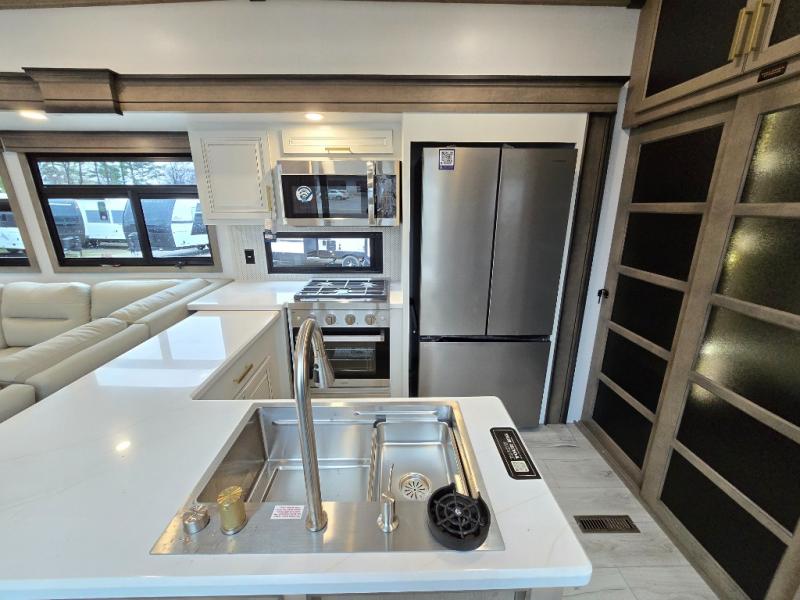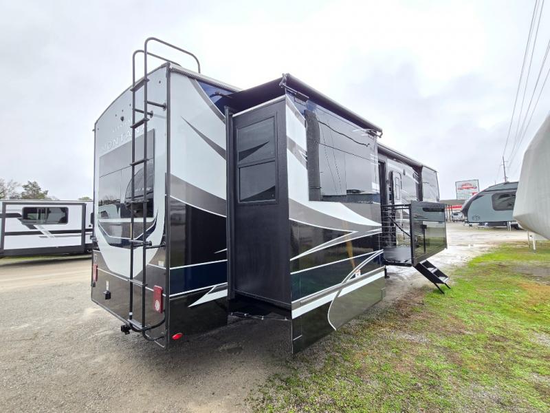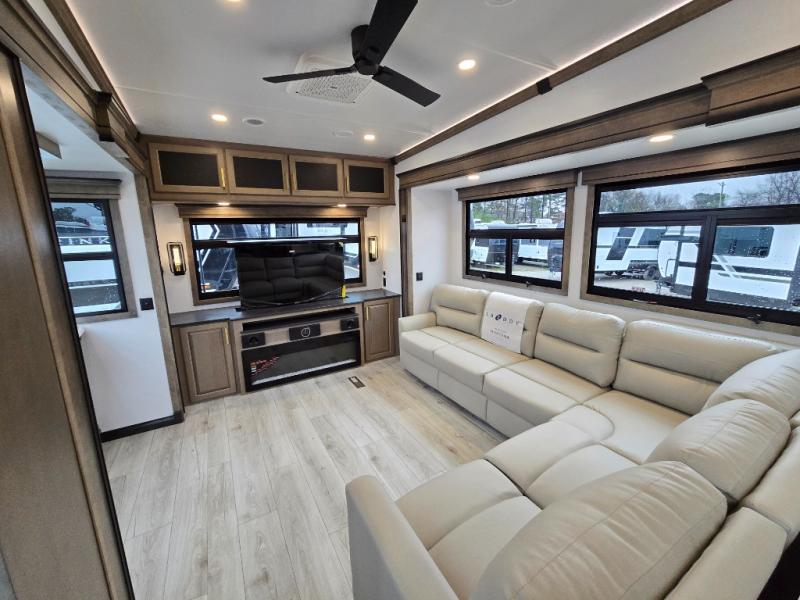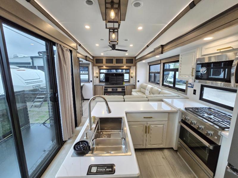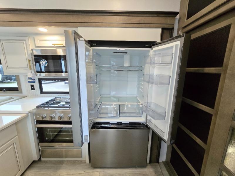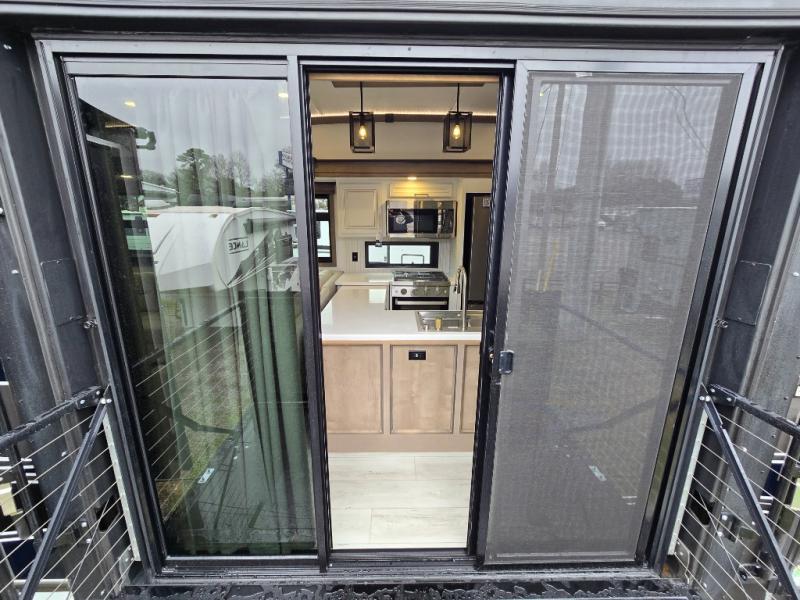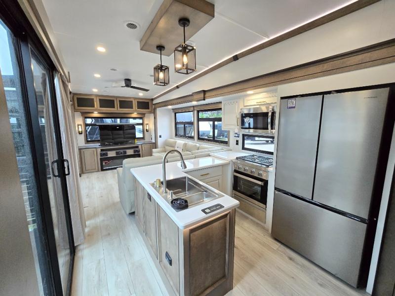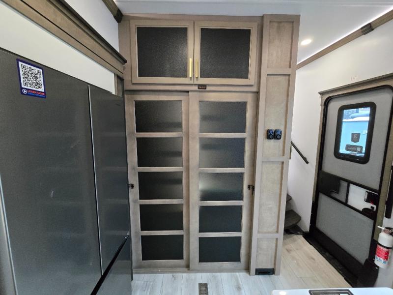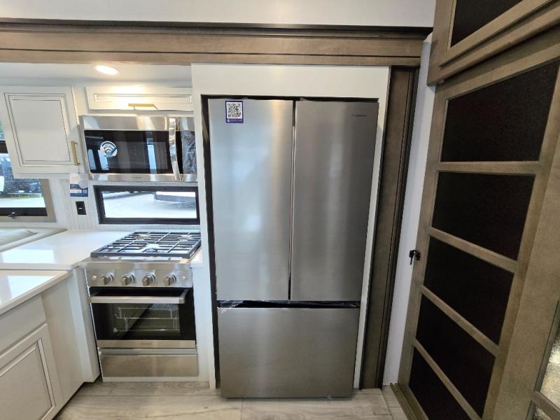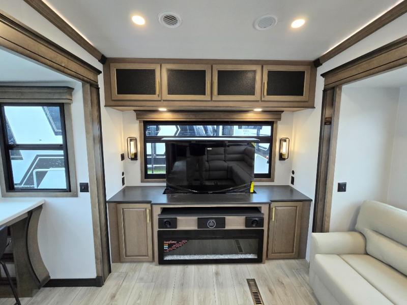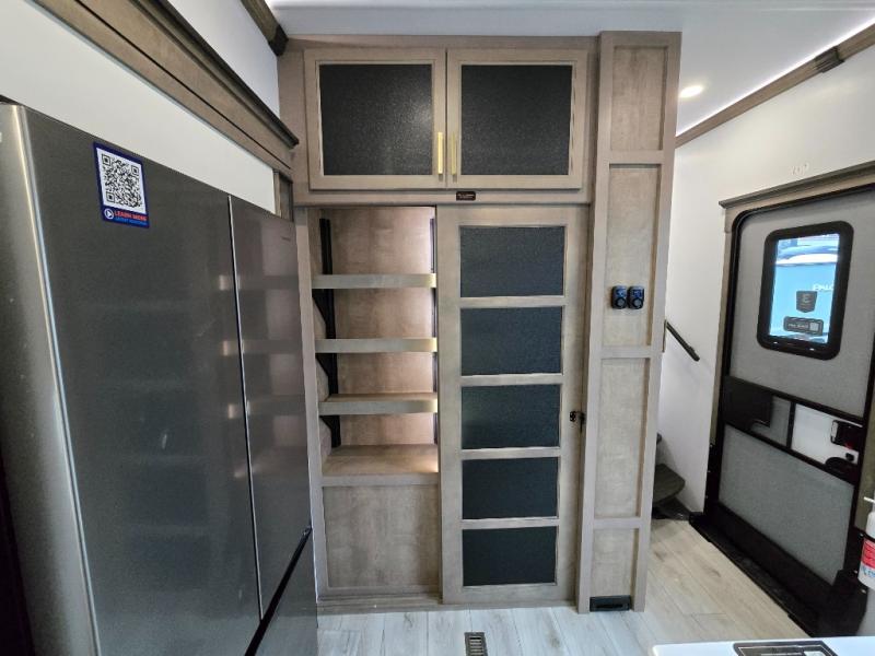 Luxury abounds throughout this fifth wheel starting in the centrally located kitchen featuring an L-shaped counter, a pull down storage pantry, a 24" range with an overhead convection microwave, and an 18 cu. ft. residential refrigerator with ice an maker. Just up the steps to the right of the entry, you will find a spacious bathroom featuring a 48" x 30" fiberglass shower with a seat, decorative glass enclosure, linen cabinet, and skylight above it for more natural lighting. Sleep like a baby in the front private bedroom on the king bed slide with storage underneath, and keep your clothes looking their best with the front closets. The rear entertainment living area offers true relaxation with L-shaped seating including a hide-a-bed sofa along the roadside, and powered theater seating facing the entertainment center with a 5,000 BTU decorative fireplace heater and Smart TV to watch your favorite movies! And don't overlook the best part, the powered side patio to entertain guests!