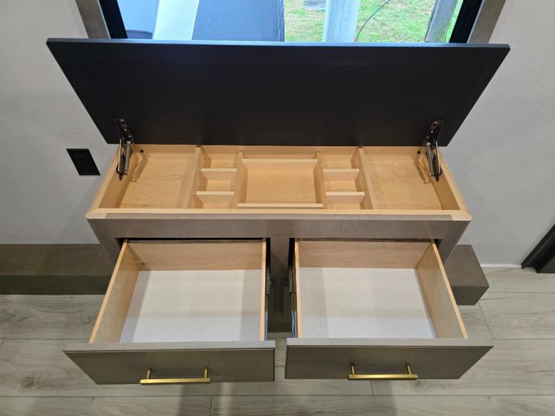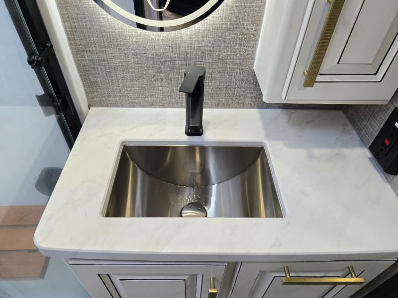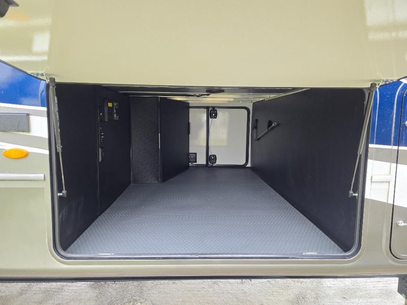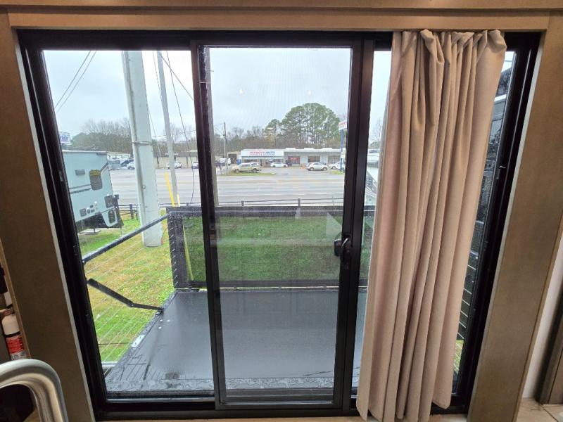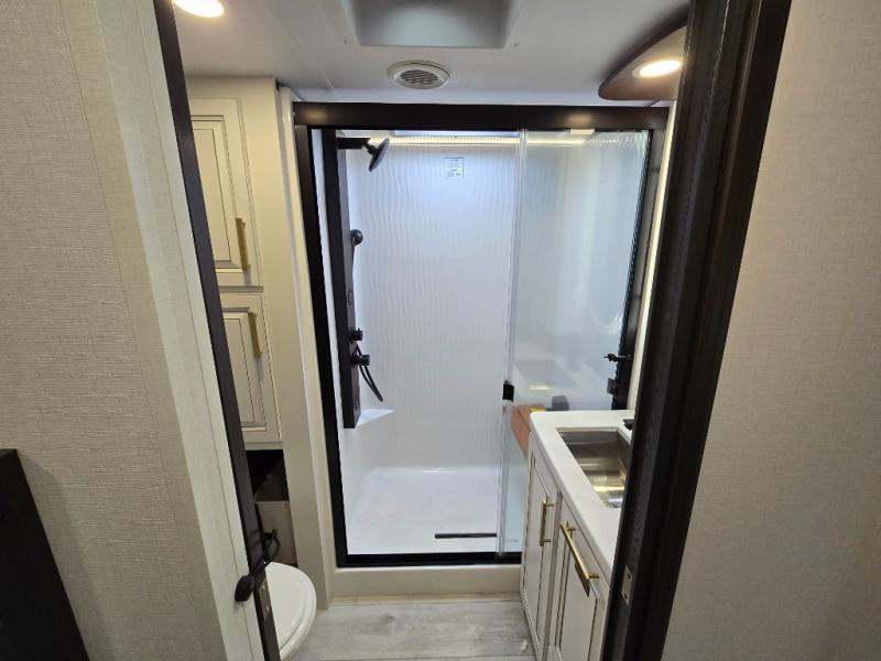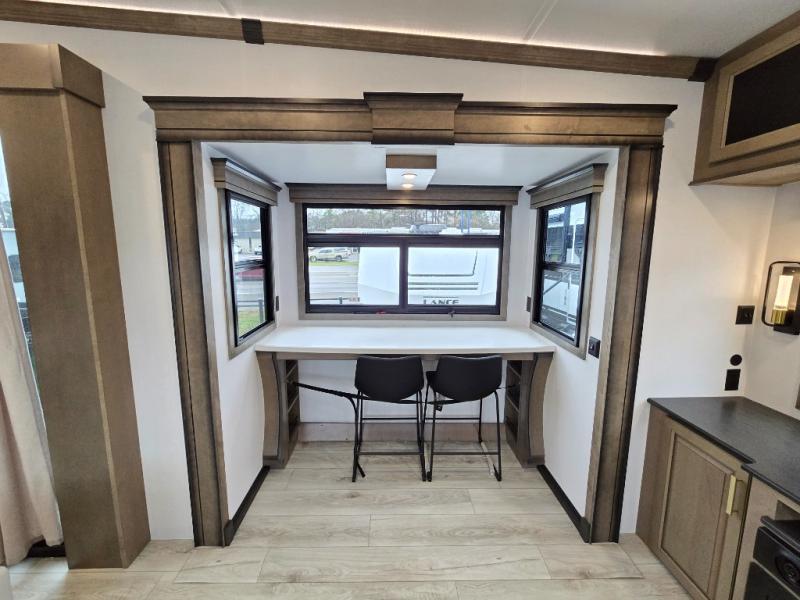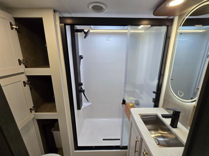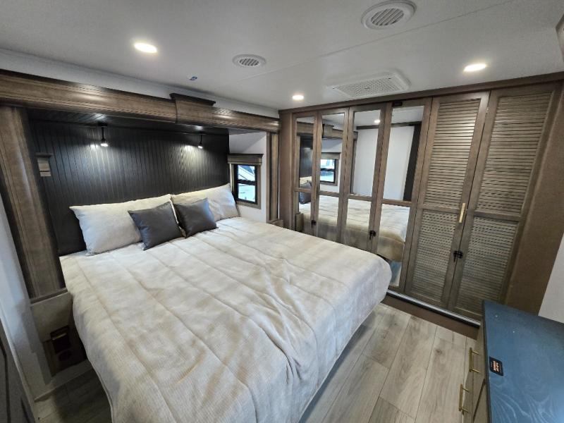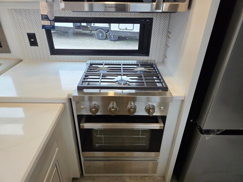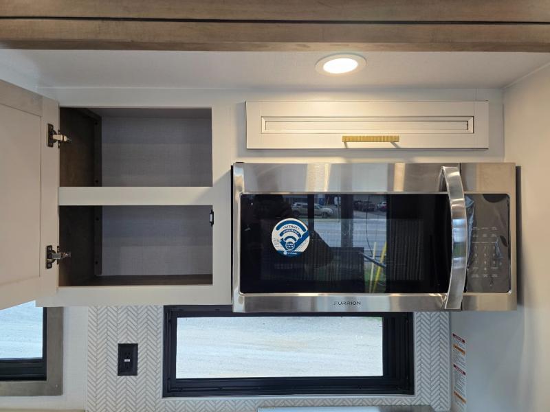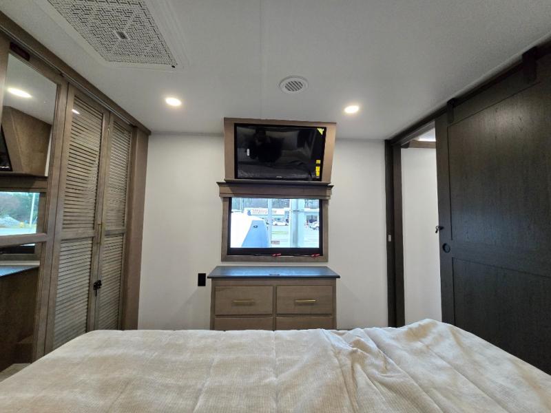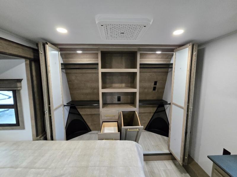 Luxury abounds throughout this fifth wheel starting in the centrally located kitchen featuring an L-shaped counter, a pull down storage pantry, a 24" range with an overhead convection microwave, and an 18 cu. ft. residential refrigerator with ice an maker. Just up the steps to the right of the entry, you will find a spacious bathroom featuring a 48" x 30" fiberglass shower with a seat, decorative glass enclosure, linen cabinet, and skylight above it for more natural lighting. Sleep like a baby in the front private bedroom on the king bed slide with storage underneath, and keep your clothes looking their best with the front closets. The rear entertainment living area offers true relaxation with L-shaped seating including a hide-a-bed sofa along the roadside, and powered theater seating facing the entertainment center with a 5,000 BTU decorative fireplace heater and Smart TV to watch your favorite movies! And don't overlook the best part, the powered side patio to entertain guests!