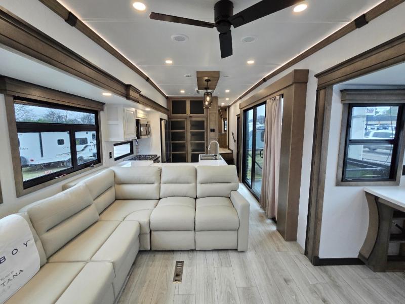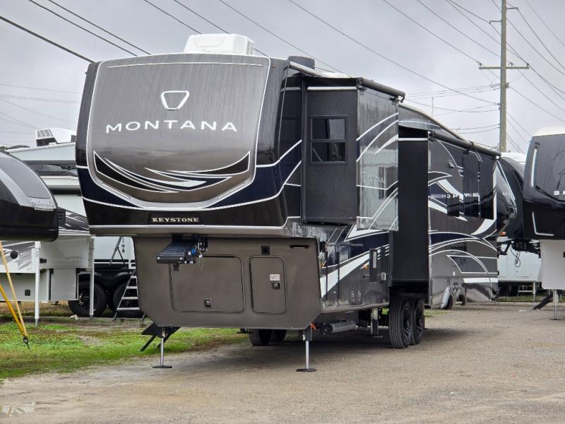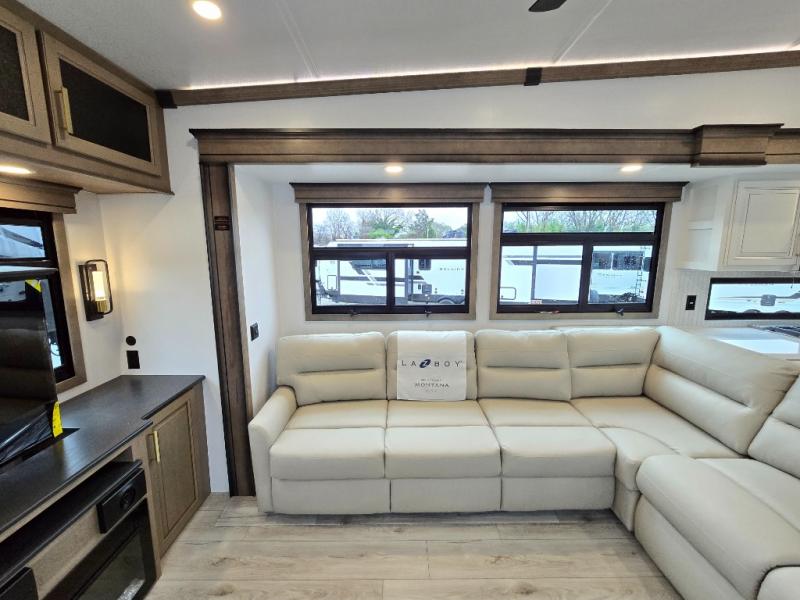 Enjoy luxury, innovation, and the outdoors in any one of Montana's finest fifth wheels. Each set the standard with exceptional features, and exciting factory installed options to provide you a great home on the road. Keystone's 12" I-beam chassis with z-frame technology provides a strong and durable foundation to your fifth wheel, and the four season living package will help extend your camping season. A few other construction features you will appreciate include a MORryde CRE3000 suspension, a fully walkable roof with an alpha seamless TPO membrane system, and 4k square frameless tinted safety glass windows. Each feature stylish interiors with two decor choices paired with beautiful hardwood cabinetry, Beauflor vinyl flooring throughout, central vacuum, plus a La-Z-Boy furniture package for all-around comfort!