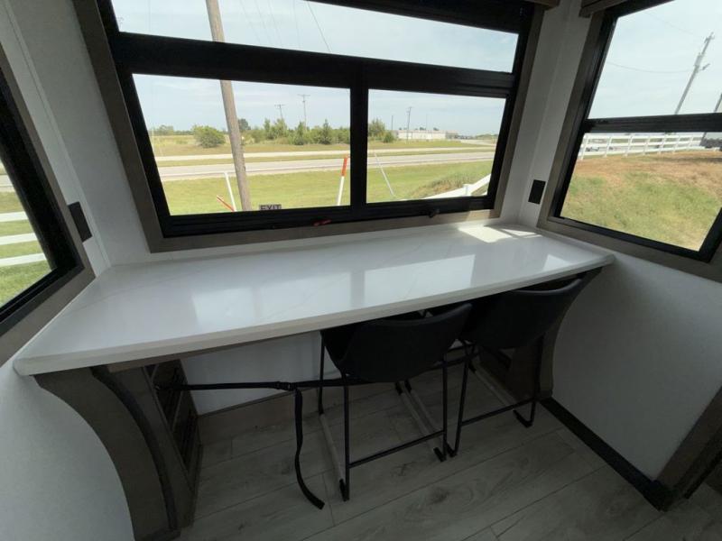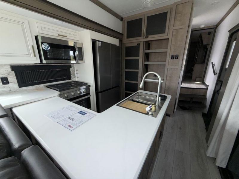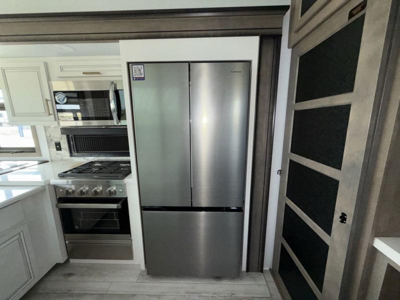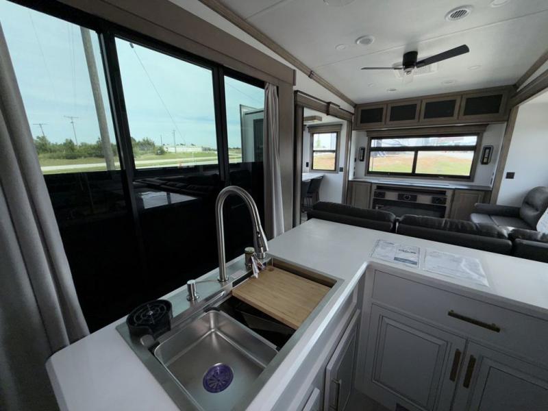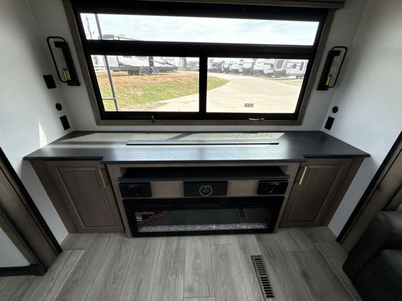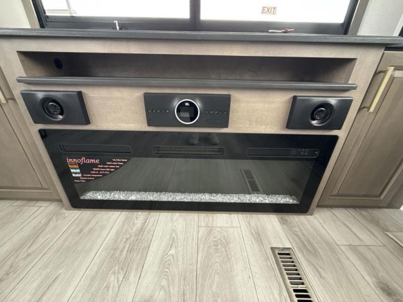 Luxury abounds throughout this fifth wheel starting in the centrally located kitchen featuring an L-shaped counter, a pull down storage pantry, a 24" range with an overhead convection microwave, and an 18 cu. ft. residential refrigerator with ice an maker. Just up the steps to the right of the entry, you will find a spacious bathroom featuring a 48" x 30" fiberglass shower with a seat, decorative glass enclosure, linen cabinet, and skylight above it for more natural lighting. Sleep like a baby in the front private bedroom on the king bed slide with storage underneath, and keep your clothes looking their best with the front closets. The rear entertainment living area offers true relaxation with L-shaped seating including a hide-a-bed sofa along the roadside, and powered theater seating facing the entertainment center with a 5,000 BTU decorative fireplace heater and Smart TV to watch your favorite movies! And don't overlook the best part, the powered side patio to entertain guests!