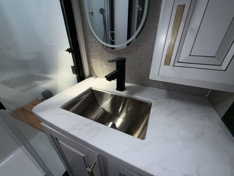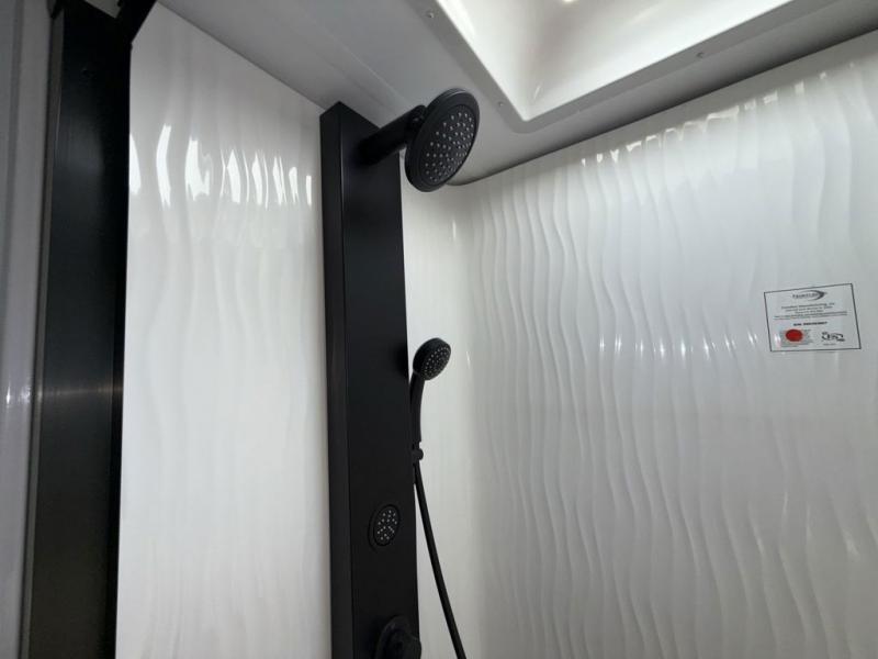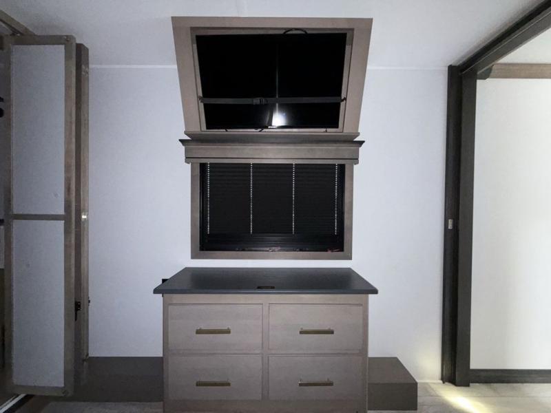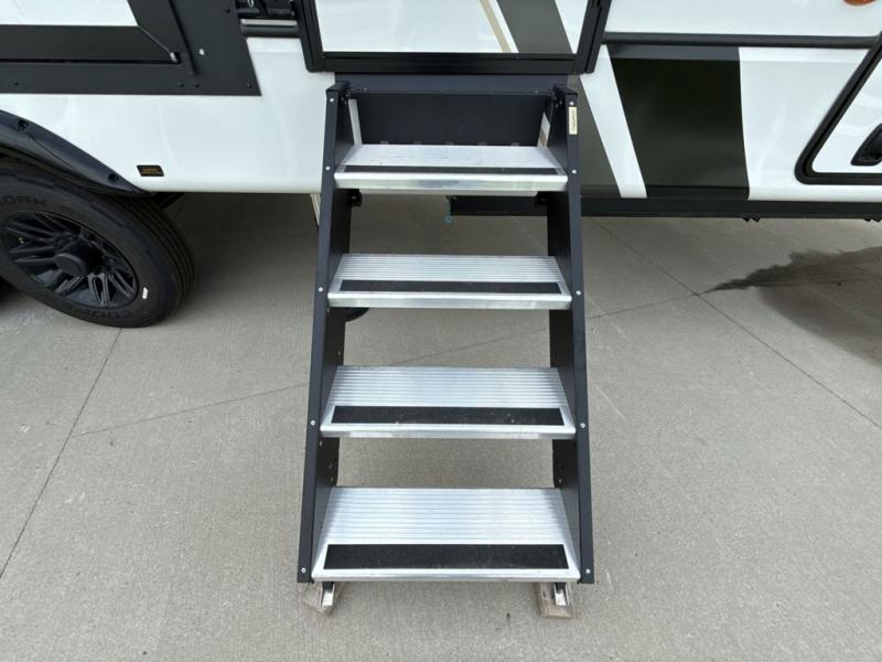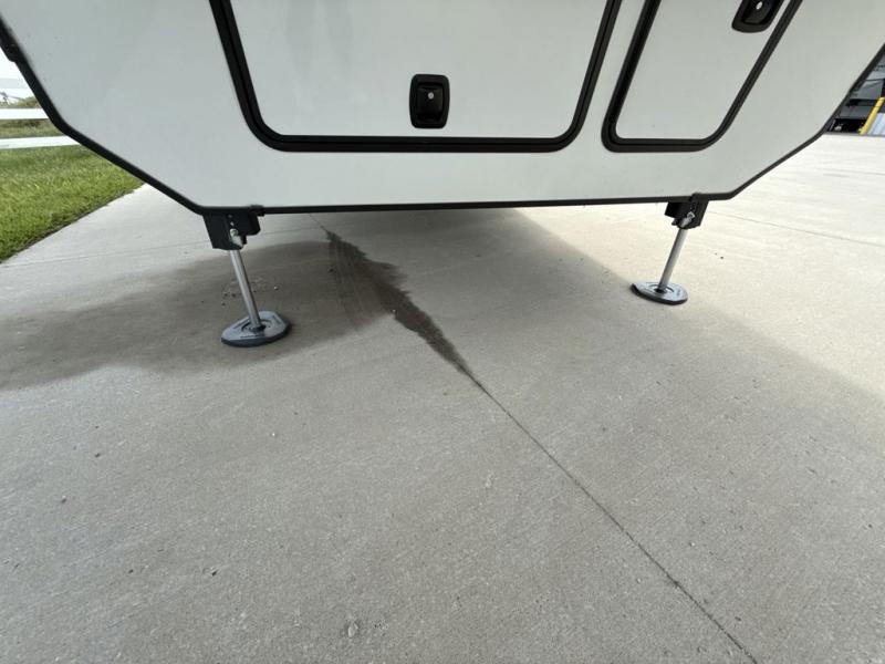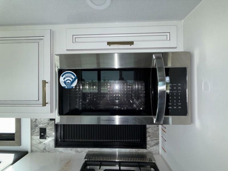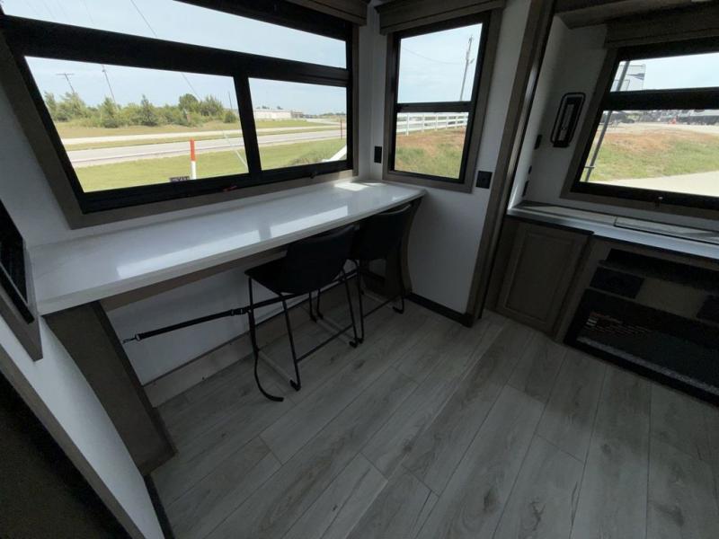 Luxury abounds throughout this fifth wheel starting in the centrally located kitchen featuring an L-shaped counter, a pull down storage pantry, a 24" range with an overhead convection microwave, and an 18 cu. ft. residential refrigerator with ice an maker. Just up the steps to the right of the entry, you will find a spacious bathroom featuring a 48" x 30" fiberglass shower with a seat, decorative glass enclosure, linen cabinet, and skylight above it for more natural lighting. Sleep like a baby in the front private bedroom on the king bed slide with storage underneath, and keep your clothes looking their best with the front closets. The rear entertainment living area offers true relaxation with L-shaped seating including a hide-a-bed sofa along the roadside, and powered theater seating facing the entertainment center with a 5,000 BTU decorative fireplace heater and Smart TV to watch your favorite movies! And don't overlook the best part, the powered side patio to entertain guests!