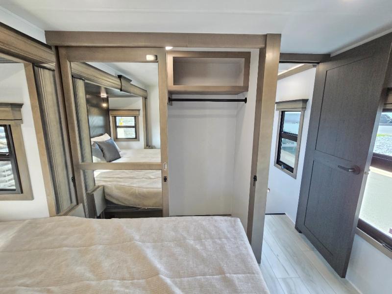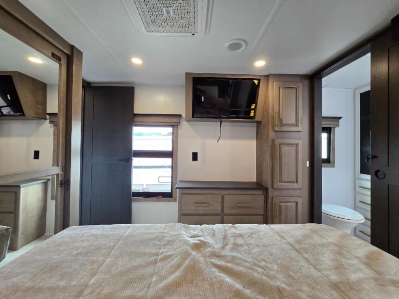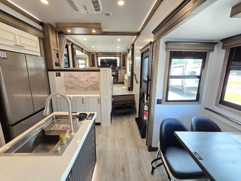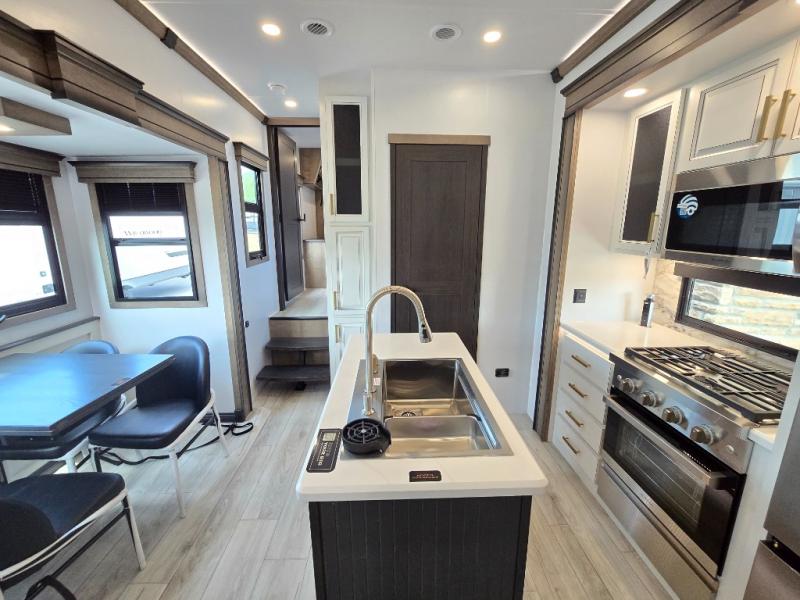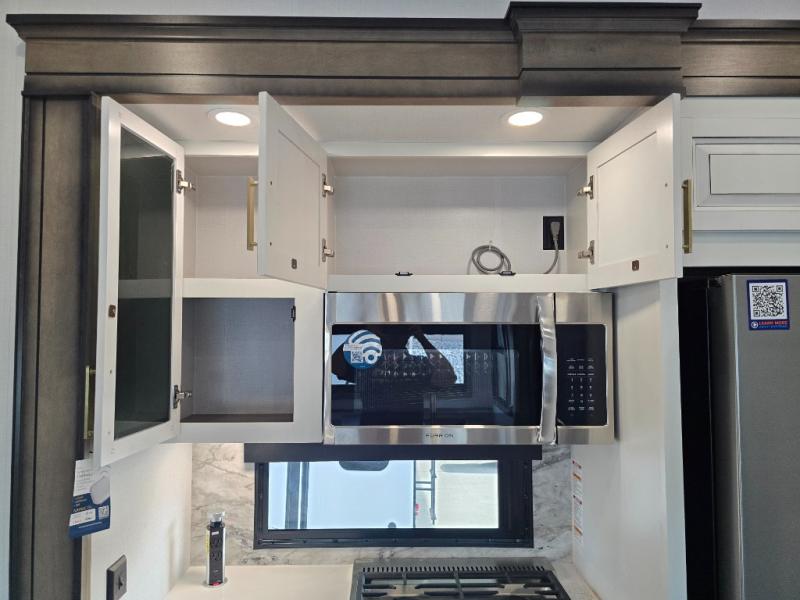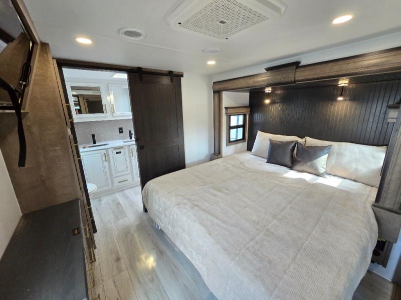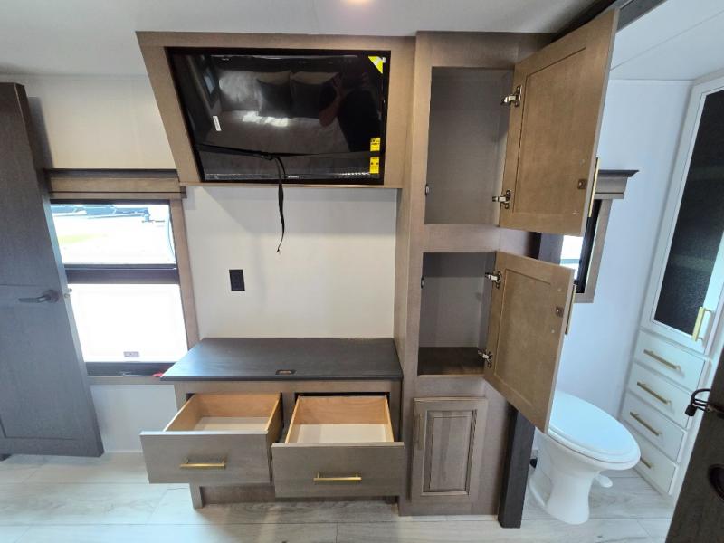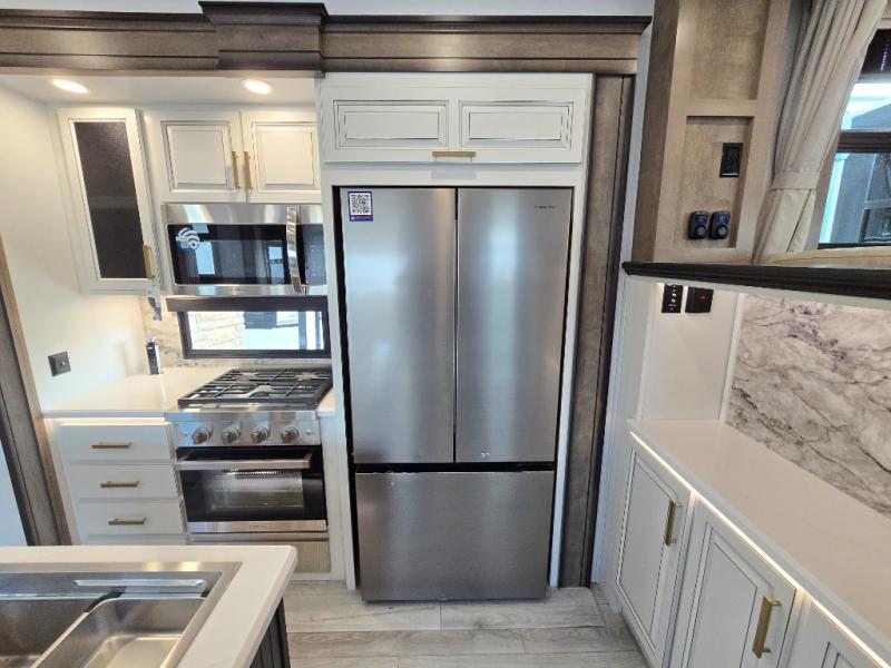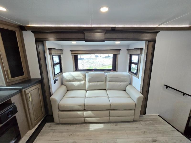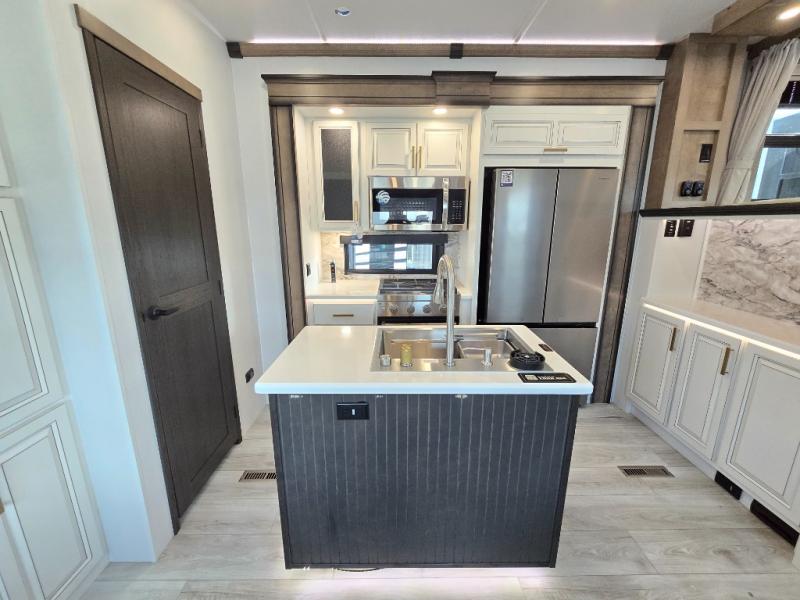 Life will be easier at the campground in this fifth wheel with a bath and a half! The full rear bathroom has a 48" x 30" fiberglass shower with a seat and skylight above, a linen closet to keep your towels close, a dual sink vanity for two to get ready at once, and a barn door to close off the master suite. The bedroom also has a king bed slide with storage underneath across from a dresser with a 32" Smart TV and wardrobe, as well as a large closet with stackable washer and dryer prep. The chef can prepare their best meals with the kitchen island, convection microwave and 24" range, plus there is a pantry/buffet and a pivot dinette to enjoy your meals at. The front living area will have you feeling right at home with the front entertainment center that has a telescoping 50" Smart TV, a 5,000 BTU decorative fireplace heater, and storage on either side. There is also opposing hide-a-bed sofa slides for extra sleeping spaces and power theater seating for even more comfort!