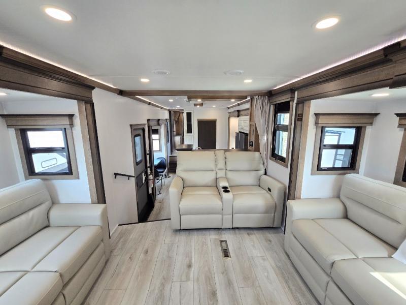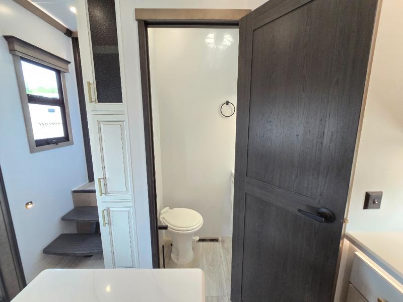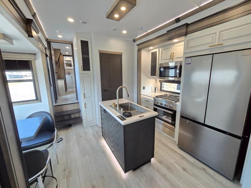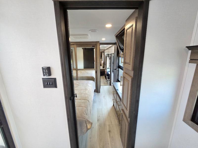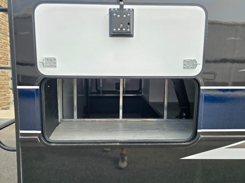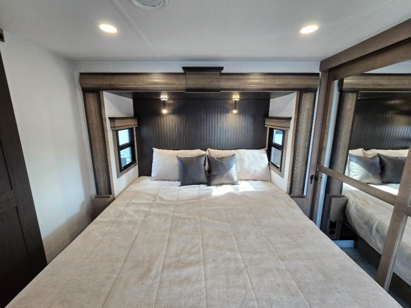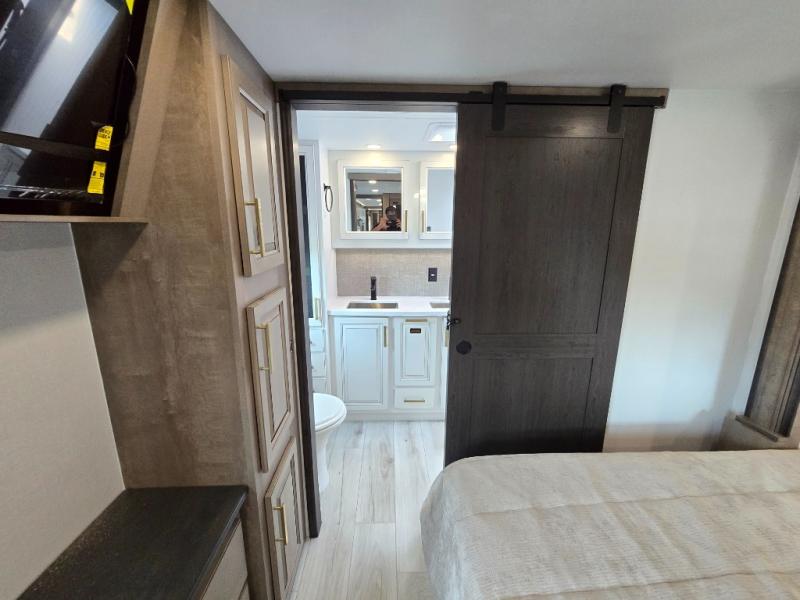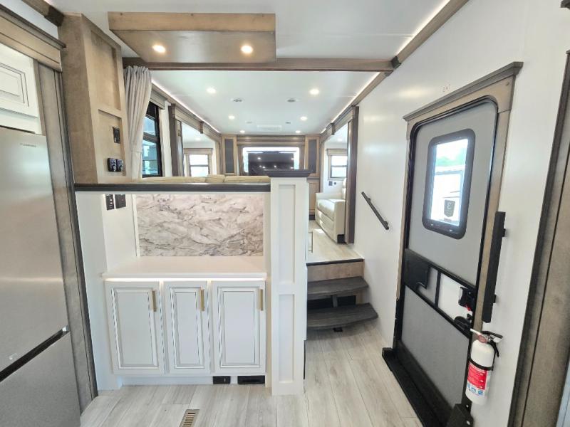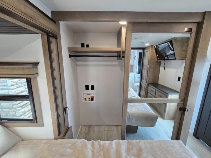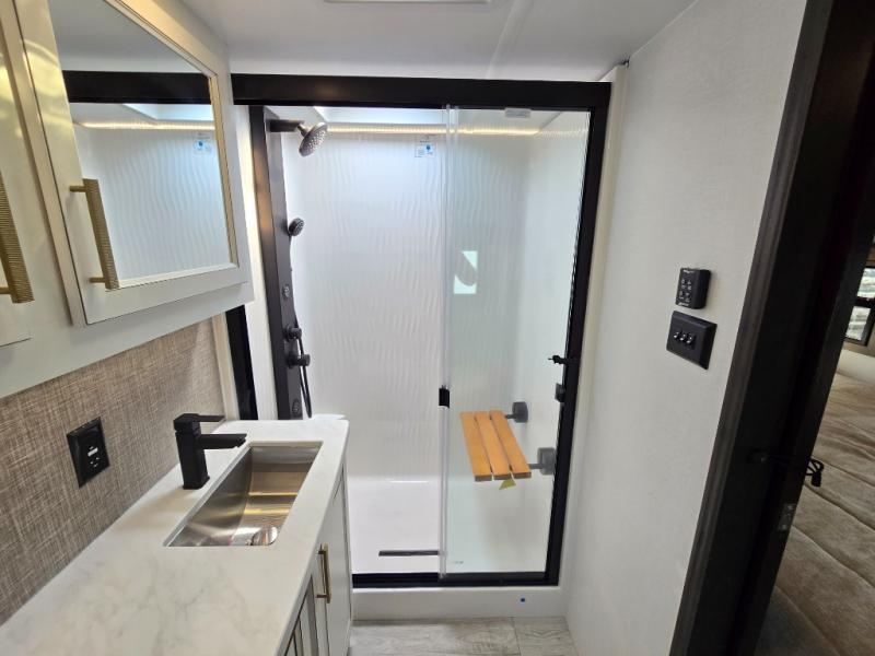 Life will be easier at the campground in this fifth wheel with a bath and a half! The full rear bathroom has a 48" x 30" fiberglass shower with a seat and skylight above, a linen closet to keep your towels close, a dual sink vanity for two to get ready at once, and a barn door to close off the master suite. The bedroom also has a king bed slide with storage underneath across from a dresser with a 32" Smart TV and wardrobe, as well as a large closet with stackable washer and dryer prep. The chef can prepare their best meals with the kitchen island, convection microwave and 24" range, plus there is a pantry/buffet and a pivot dinette to enjoy your meals at. The front living area will have you feeling right at home with the front entertainment center that has a telescoping 50" Smart TV, a 5,000 BTU decorative fireplace heater, and storage on either side. There is also opposing hide-a-bed sofa slides for extra sleeping spaces and power theater seating for even more comfort!