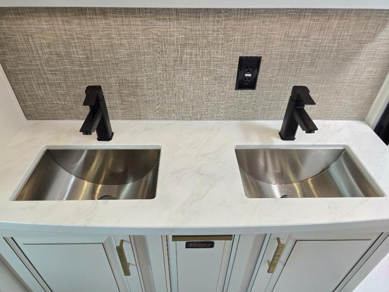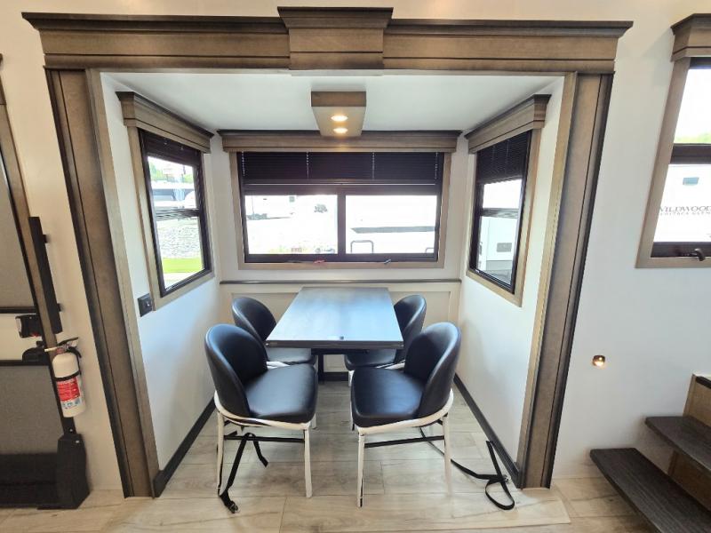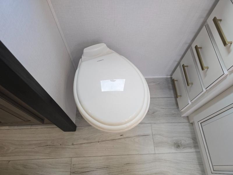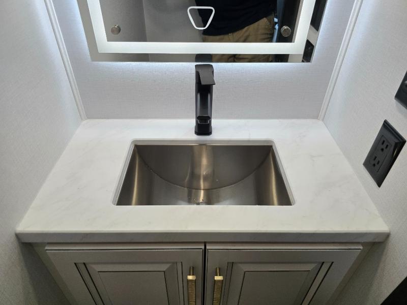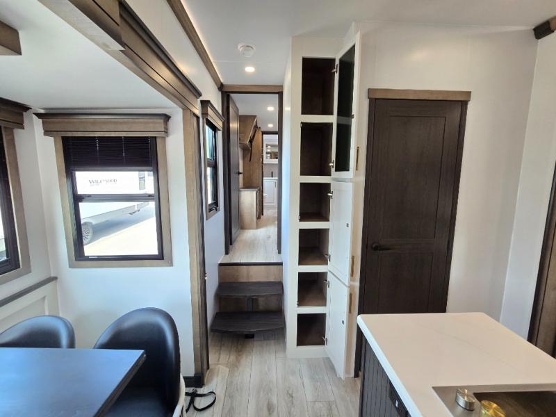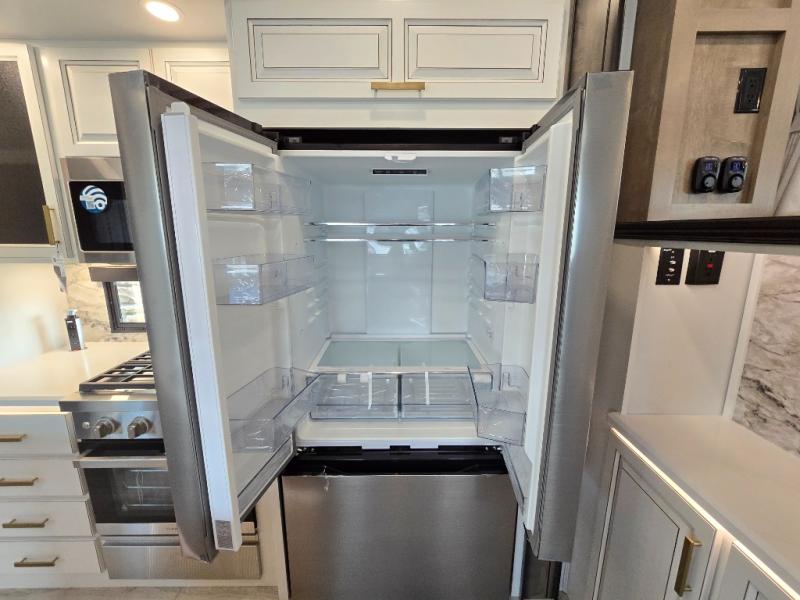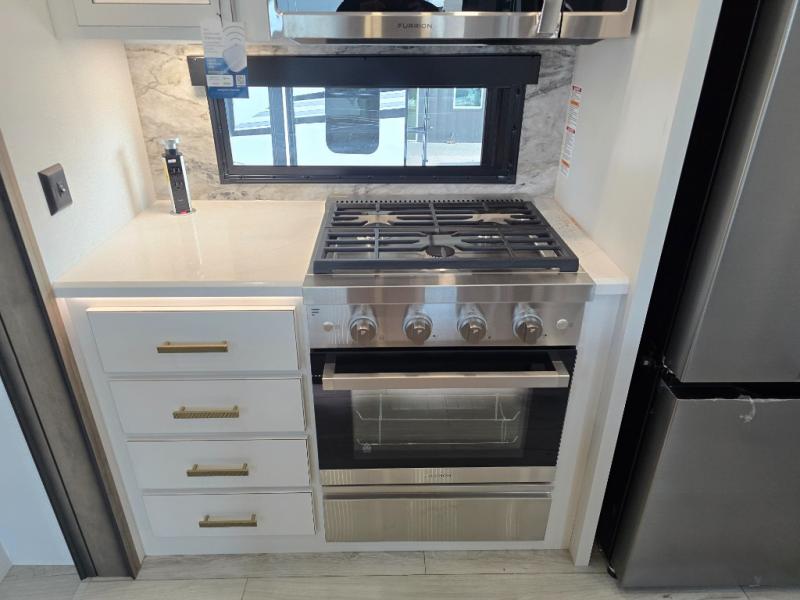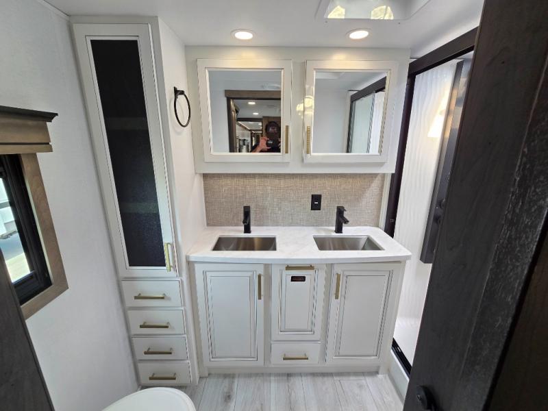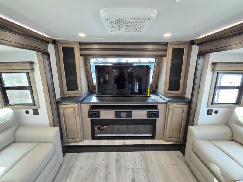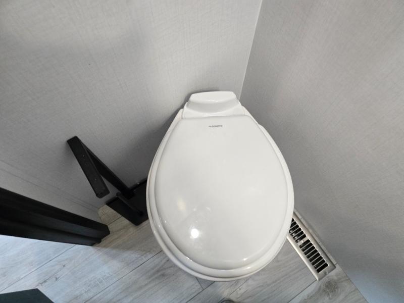 Life will be easier at the campground in this fifth wheel with a bath and a half! The full rear bathroom has a 48" x 30" fiberglass shower with a seat and skylight above, a linen closet to keep your towels close, a dual sink vanity for two to get ready at once, and a barn door to close off the master suite. The bedroom also has a king bed slide with storage underneath across from a dresser with a 32" Smart TV and wardrobe, as well as a large closet with stackable washer and dryer prep. The chef can prepare their best meals with the kitchen island, convection microwave and 24" range, plus there is a pantry/buffet and a pivot dinette to enjoy your meals at. The front living area will have you feeling right at home with the front entertainment center that has a telescoping 50" Smart TV, a 5,000 BTU decorative fireplace heater, and storage on either side. There is also opposing hide-a-bed sofa slides for extra sleeping spaces and power theater seating for even more comfort!