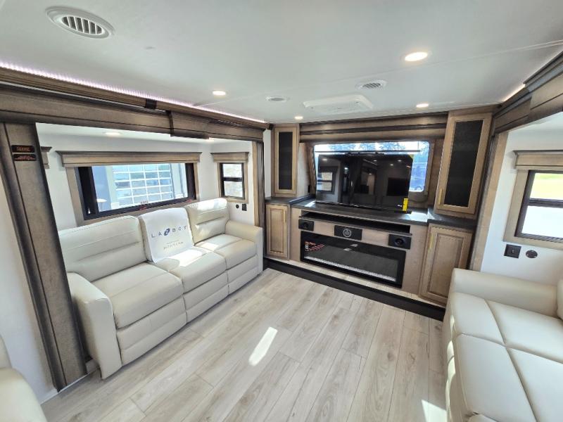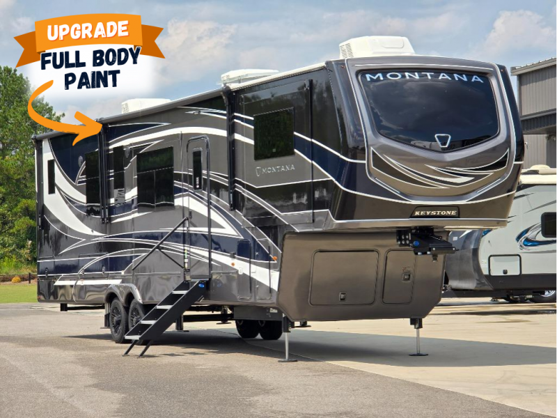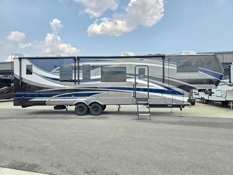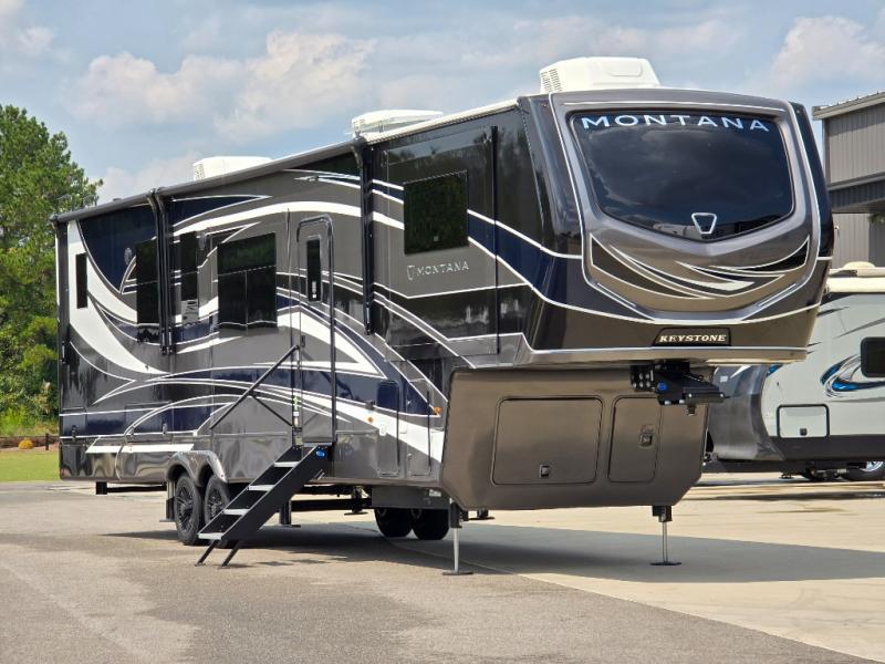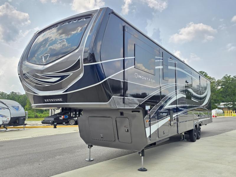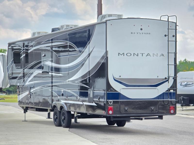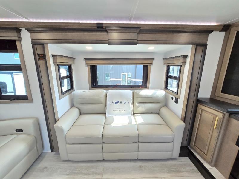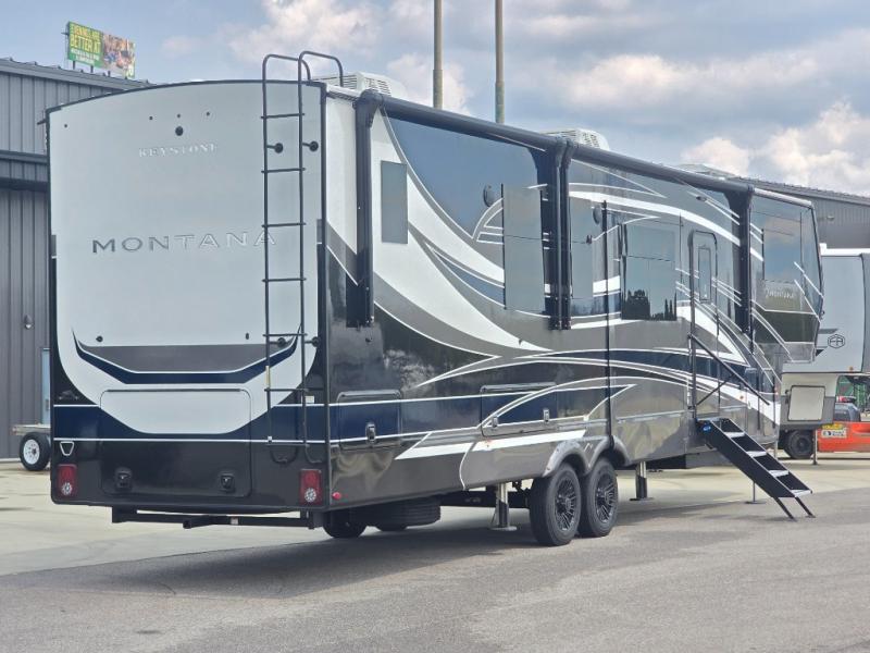 Enjoy luxury, innovation, and the outdoors in any one of Montana's finest fifth wheels. Each set the standard with exceptional features, and exciting factory installed options to provide you a great home on the road. Keystone's 12" I-beam chassis with z-frame technology provides a strong and durable foundation to your fifth wheel, and the four season living package will help extend your camping season. A few other construction features you will appreciate include a MORryde CRE3000 suspension, a fully walkable roof with an alpha seamless TPO membrane system, and 4k square frameless tinted safety glass windows. Each feature stylish interiors with two decor choices paired with beautiful hardwood cabinetry, Beauflor vinyl flooring throughout, central vacuum, plus a La-Z-Boy furniture package for all-around comfort!