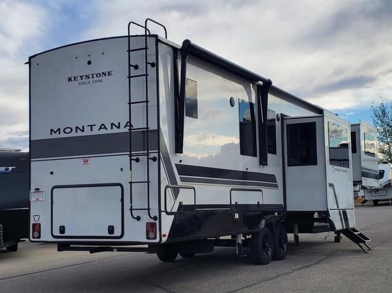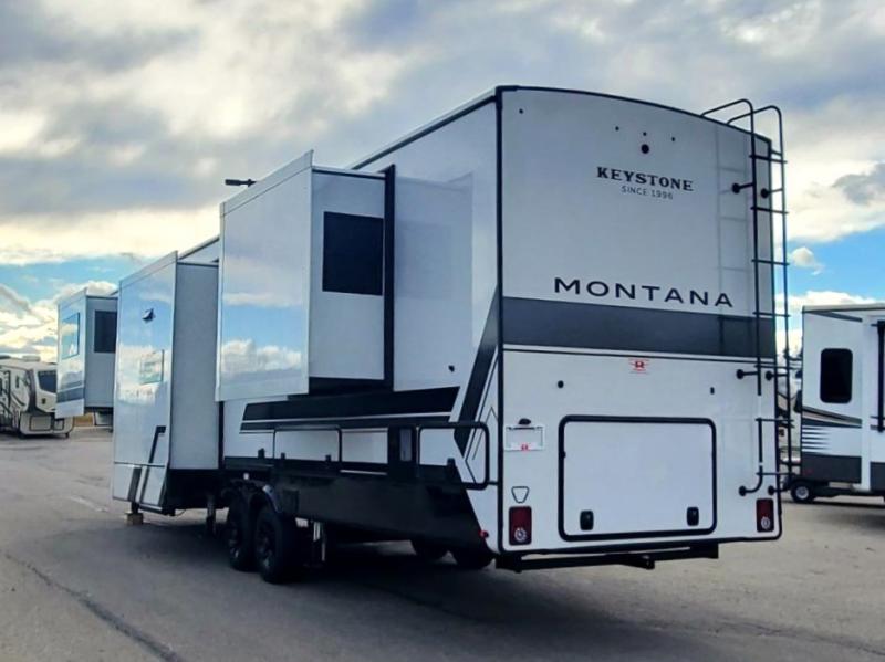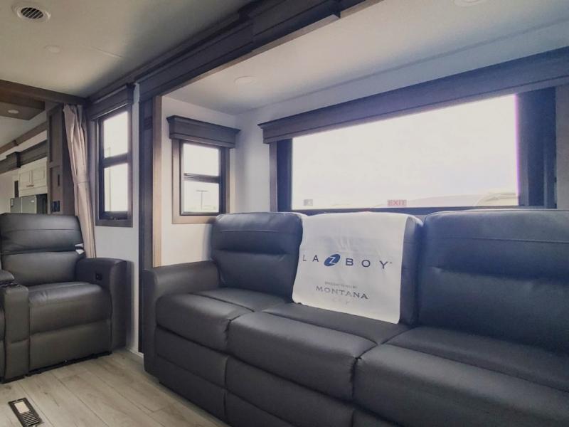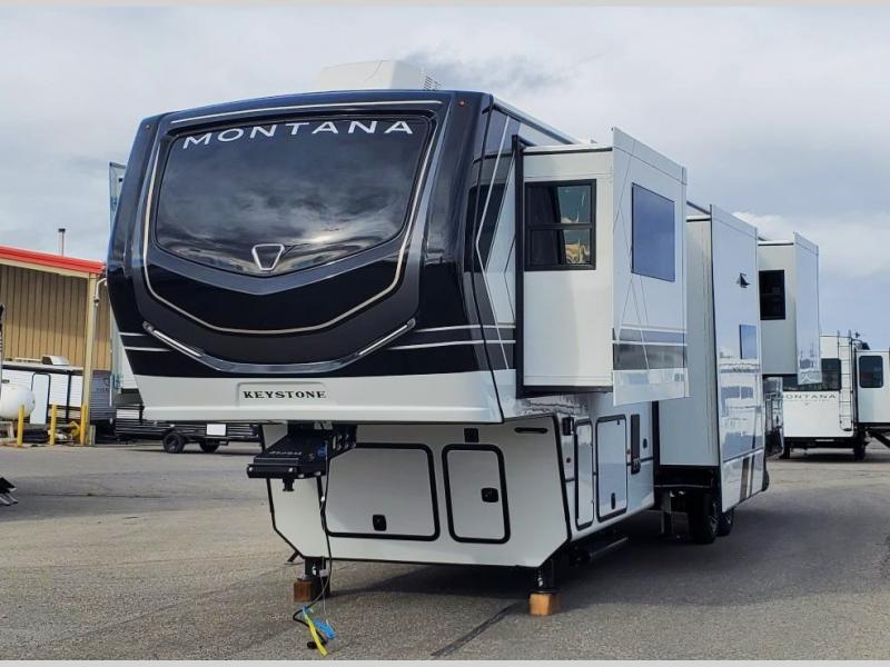 Enjoy luxury, innovation, and the outdoors in any one of Montana's finest fifth wheels. Each set the standard with exceptional features, and exciting factory installed options to provide you a great home on the road. Keystone's 12" I-beam chassis with z-frame technology provides a strong and durable foundation to your fifth wheel, and the four season living package will help extend your camping season. A few other construction features you will appreciate include a MORryde CRE3000 suspension, a fully walkable roof with an alpha seamless TPO membrane system, and 4k square frameless tinted safety glass windows. Each feature stylish interiors with two decor choices paired with beautiful hardwood cabinetry, Beauflor vinyl flooring throughout, central vacuum, plus a La-Z-Boy furniture package for all-around comfort!