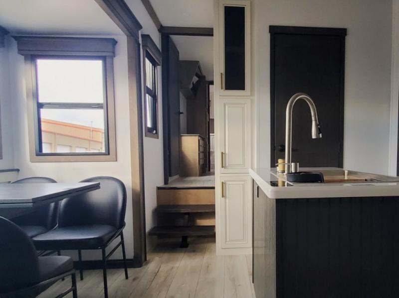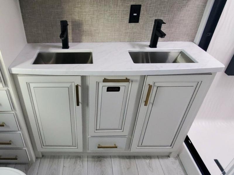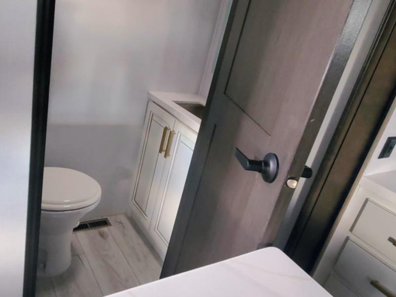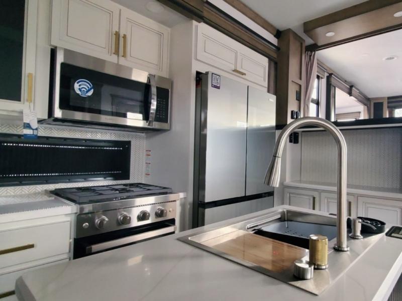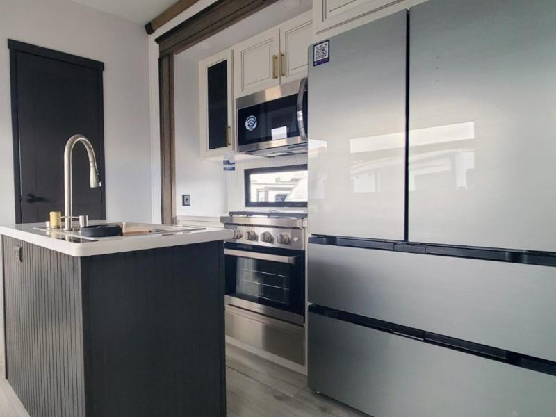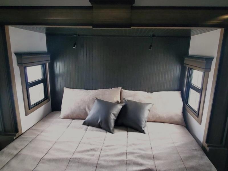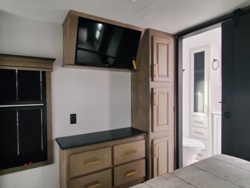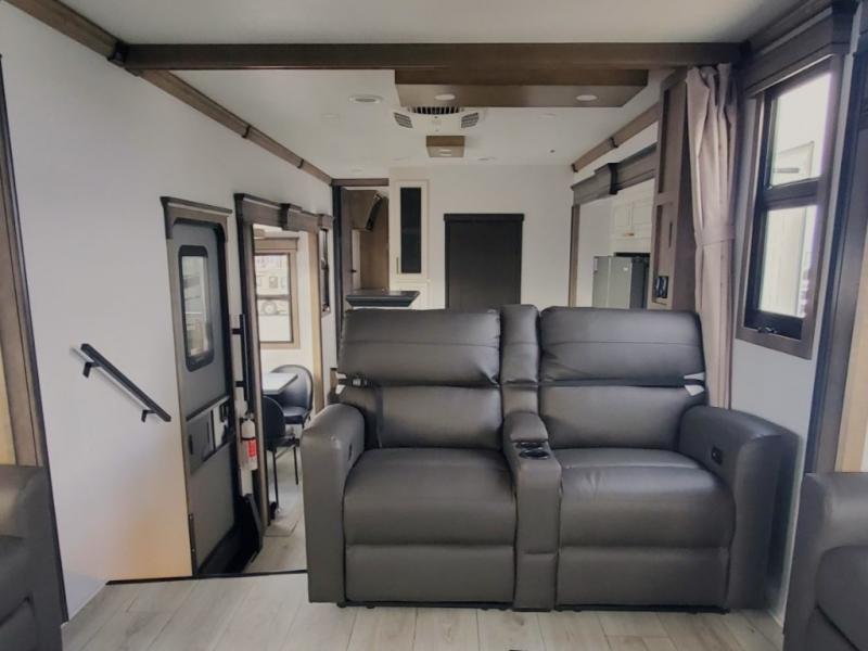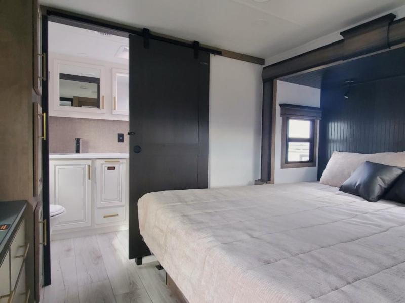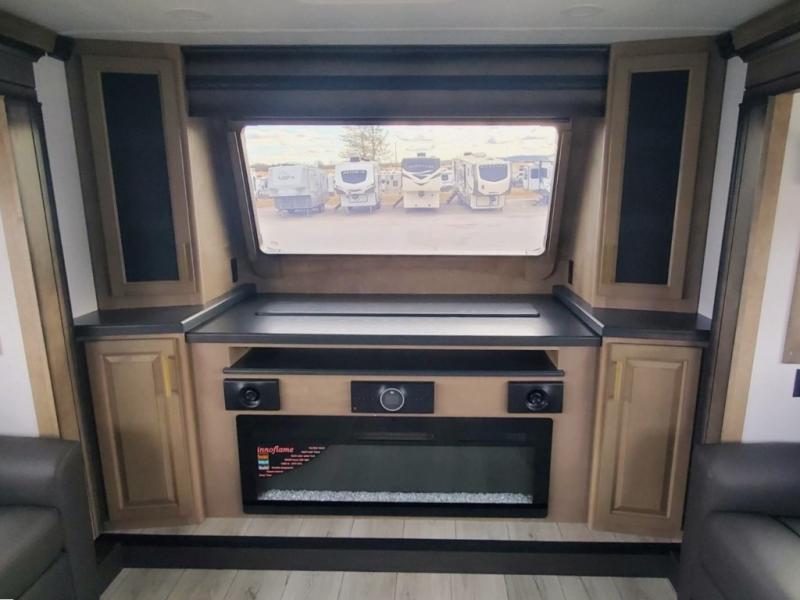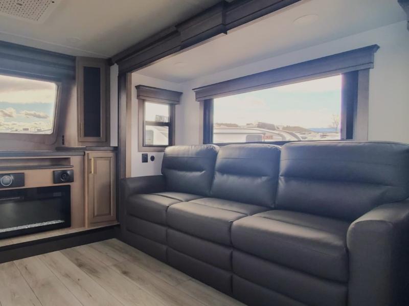 Life will be easier at the campground in this fifth wheel with a bath and a half! The full rear bathroom has a 48" x 30" fiberglass shower with a seat and skylight above, a linen closet to keep your towels close, a dual sink vanity for two to get ready at once, and a barn door to close off the master suite. The bedroom also has a king bed slide with storage underneath across from a dresser with a 32" Smart TV and wardrobe, as well as a large closet with stackable washer and dryer prep. The chef can prepare their best meals with the kitchen island, convection microwave and 24" range, plus there is a pantry/buffet and a pivot dinette to enjoy your meals at. The front living area will have you feeling right at home with the front entertainment center that has a telescoping 50" Smart TV, a 5,000 BTU decorative fireplace heater, and storage on either side. There is also opposing hide-a-bed sofa slides for extra sleeping spaces and power theater seating for even more comfort!