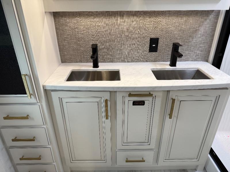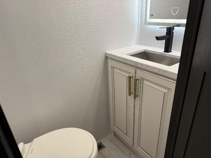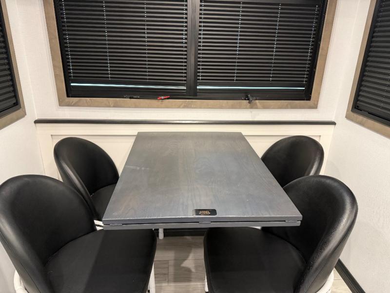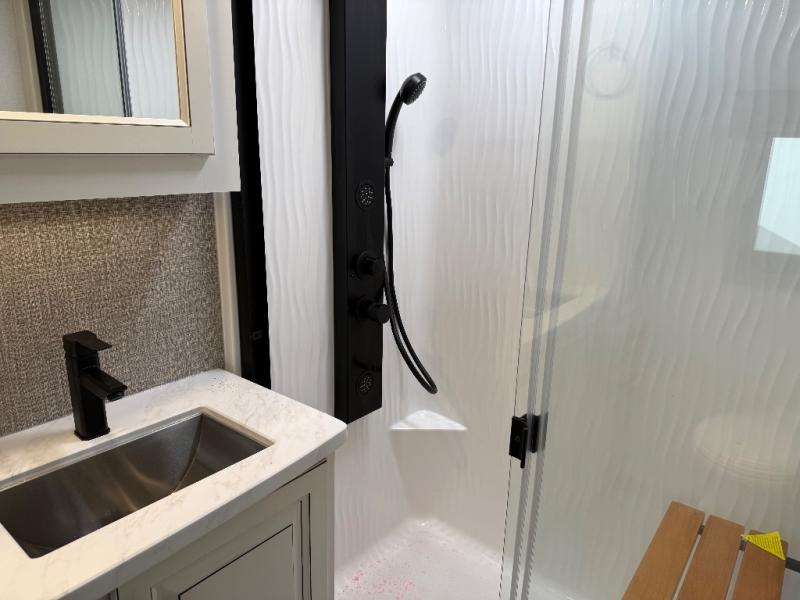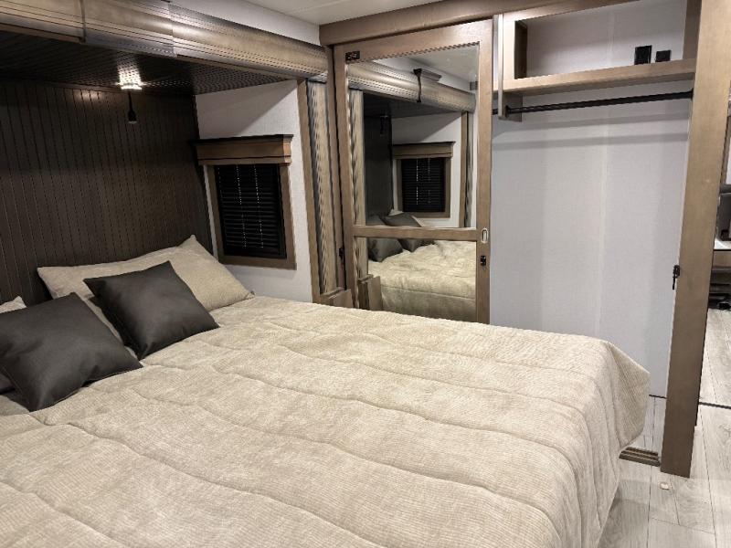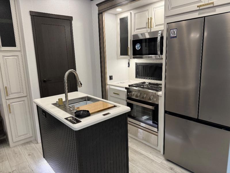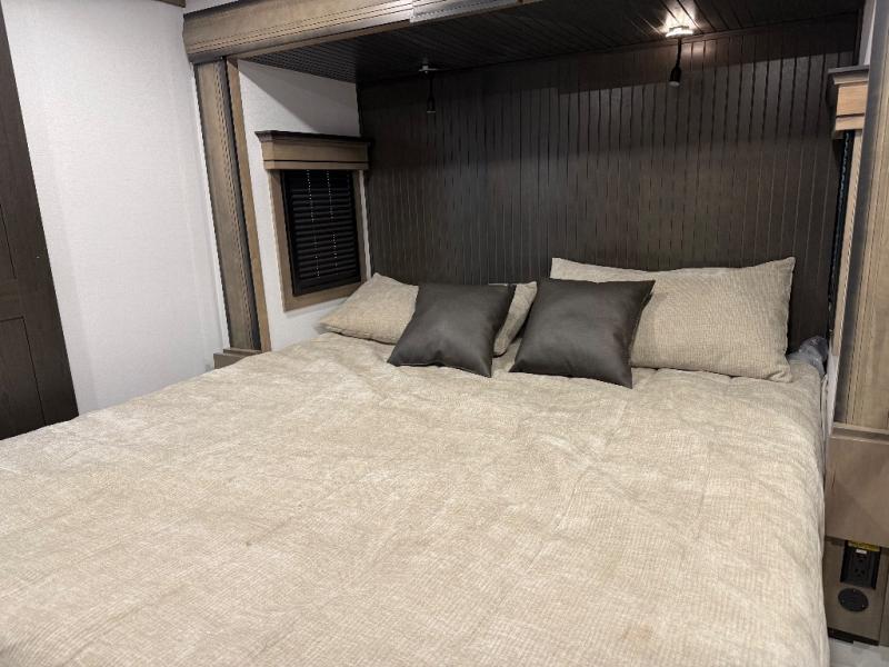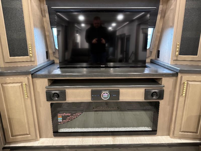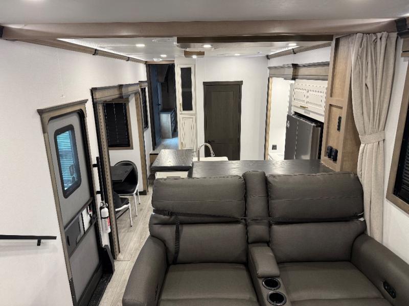Life will be easier at the campground in this fifth wheel with a bath and a half! The full rear bathroom has a 48" x 30" fiberglass shower with a seat and skylight above, a linen closet to keep your towels close, a dual sink vanity for two to get ready at once, and a barn door to close off the master suite. The bedroom also has a king bed slide with storage underneath across from a dresser with a 32" Smart TV and wardrobe, as well as a large closet with stackable washer and dryer prep. The chef can prepare their best meals with the kitchen island, convection microwave and 24" range, plus there is a pantry/buffet and a pivot dinette to enjoy your meals at. The front living area will have you feeling right at home with the front entertainment center that has a telescoping 50" Smart TV, a 5,000 BTU decorative fireplace heater, and storage on either side. There is also opposing hide-a-bed sofa slides for extra sleeping spaces and power theater seating for even more comfort!