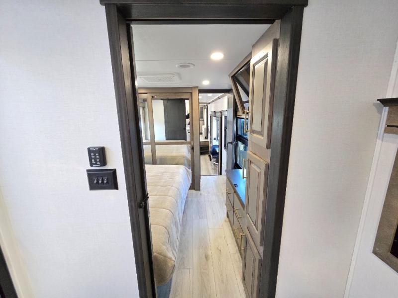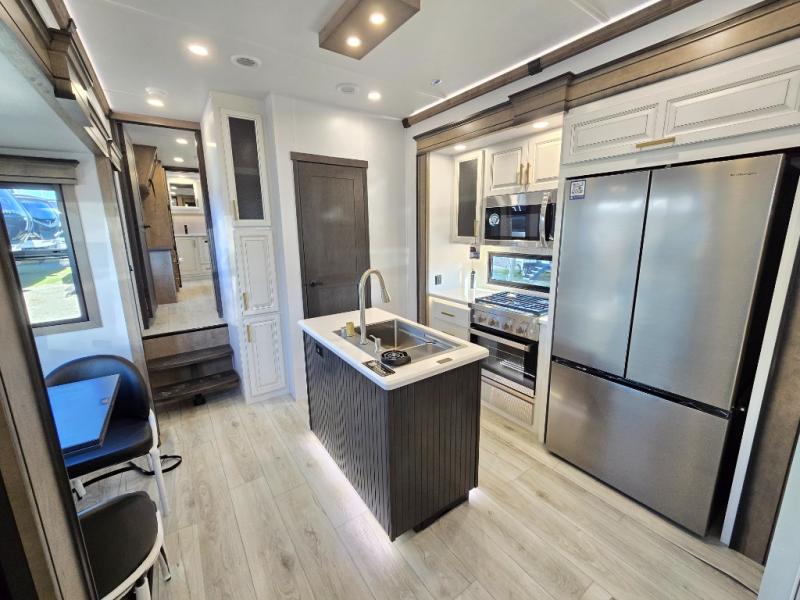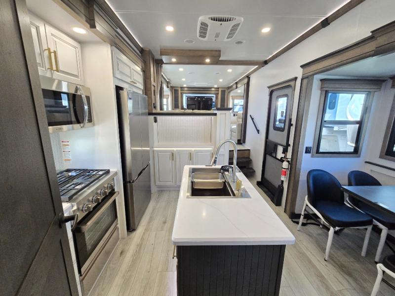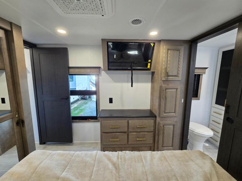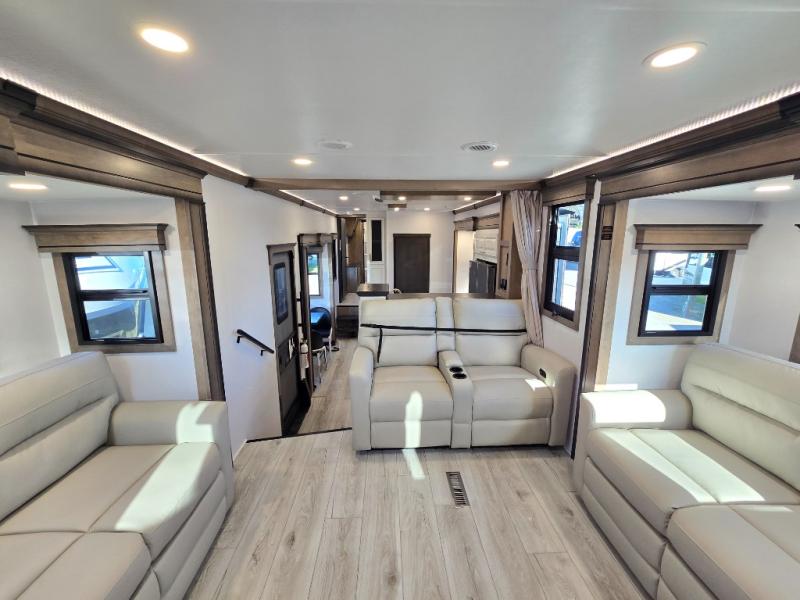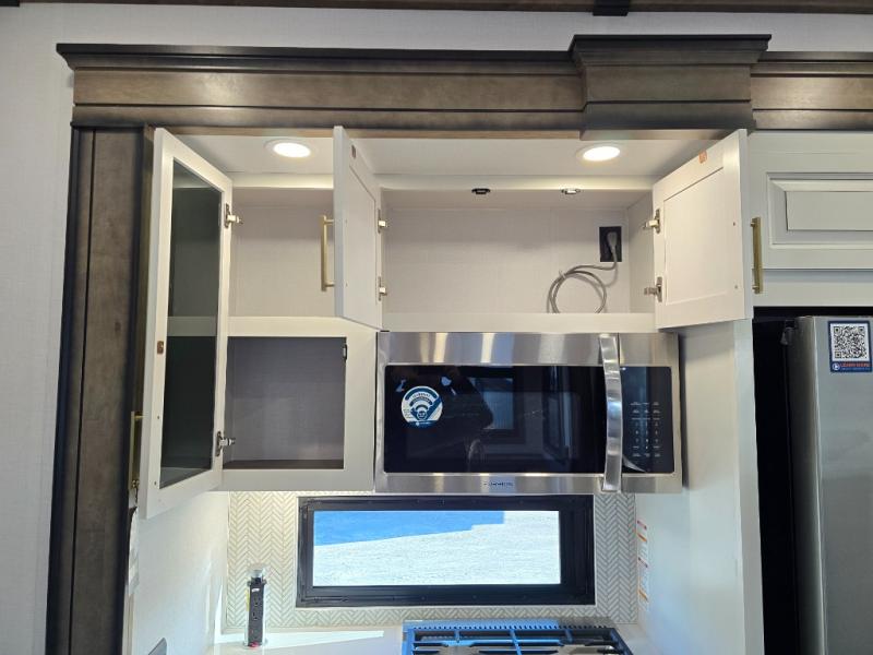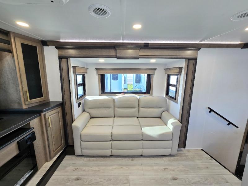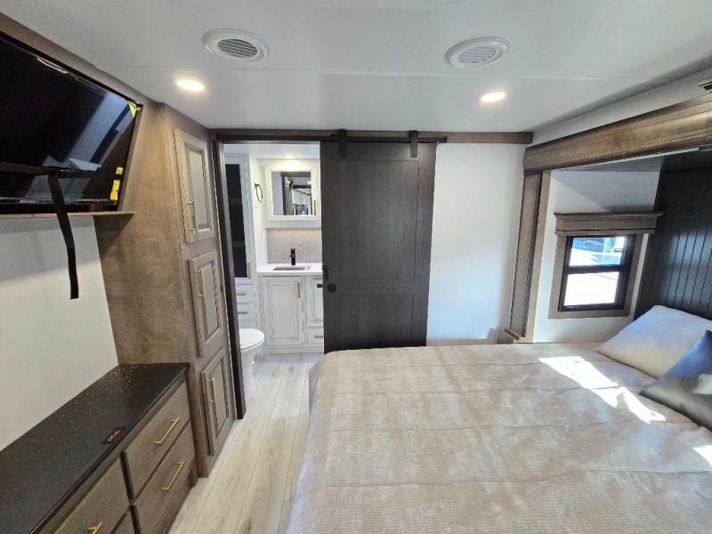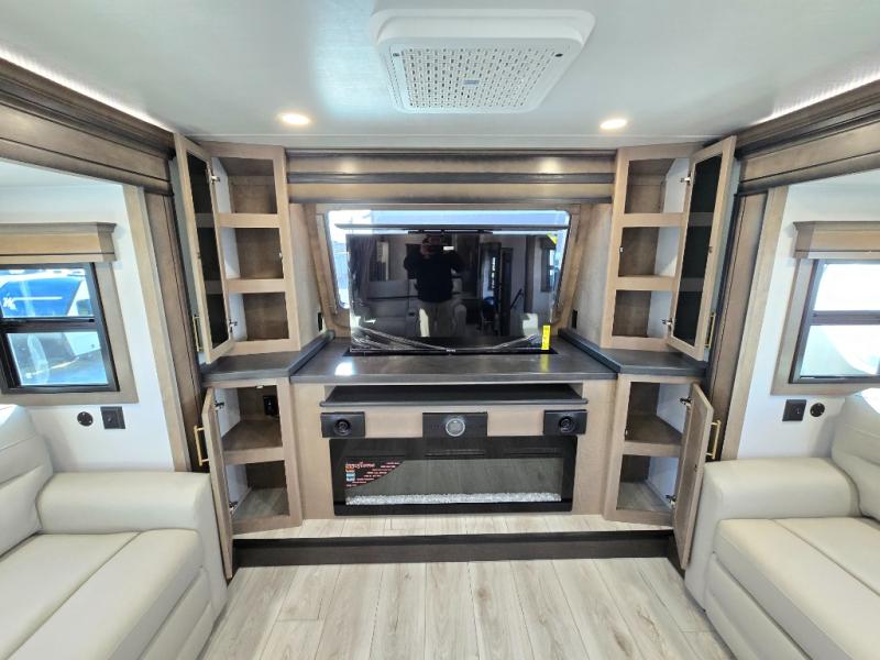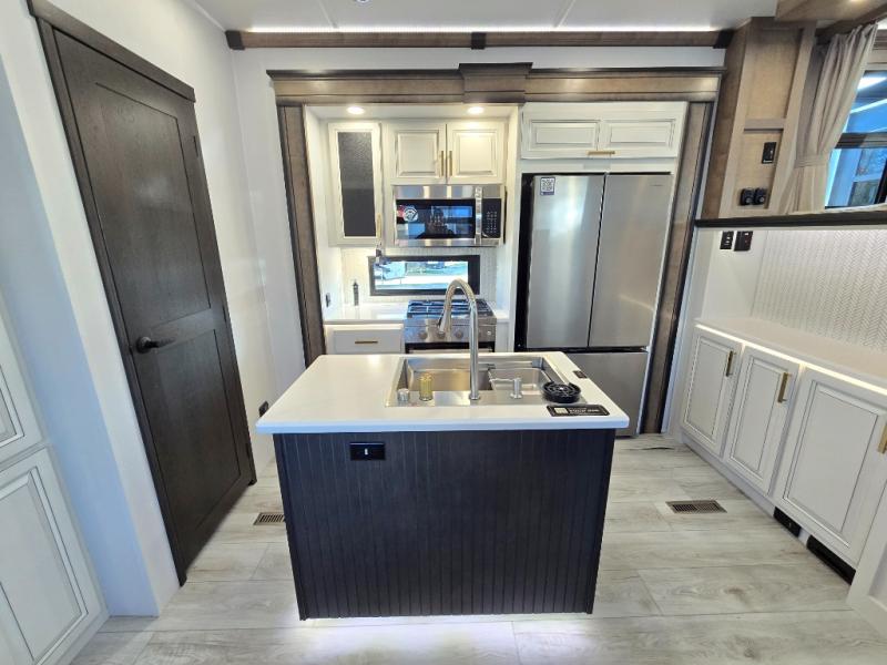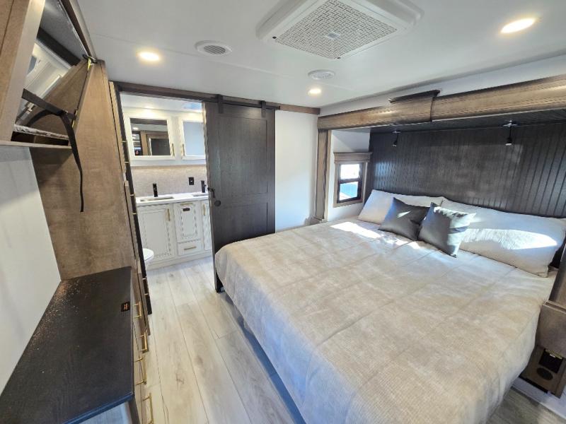 Life will be easier at the campground in this fifth wheel with a bath and a half! The full rear bathroom has a 48" x 30" fiberglass shower with a seat and skylight above, a linen closet to keep your towels close, a dual sink vanity for two to get ready at once, and a barn door to close off the master suite. The bedroom also has a king bed slide with storage underneath across from a dresser with a 32" Smart TV and wardrobe, as well as a large closet with stackable washer and dryer prep. The chef can prepare their best meals with the kitchen island, convection microwave and 24" range, plus there is a pantry/buffet and a pivot dinette to enjoy your meals at. The front living area will have you feeling right at home with the front entertainment center that has a telescoping 50" Smart TV, a 5,000 BTU decorative fireplace heater, and storage on either side. There is also opposing hide-a-bed sofa slides for extra sleeping spaces and power theater seating for even more comfort!
