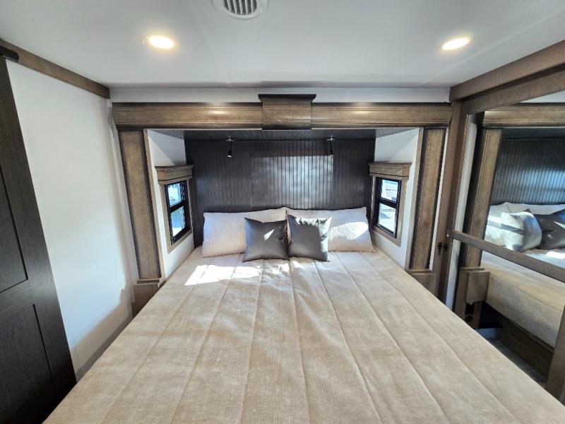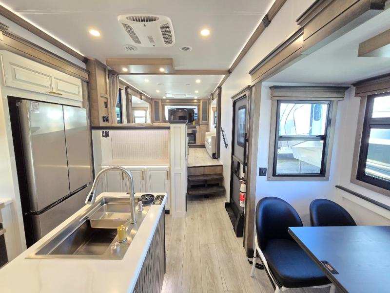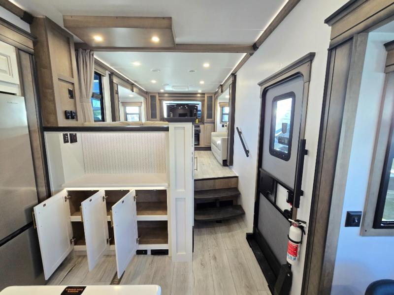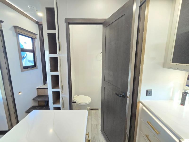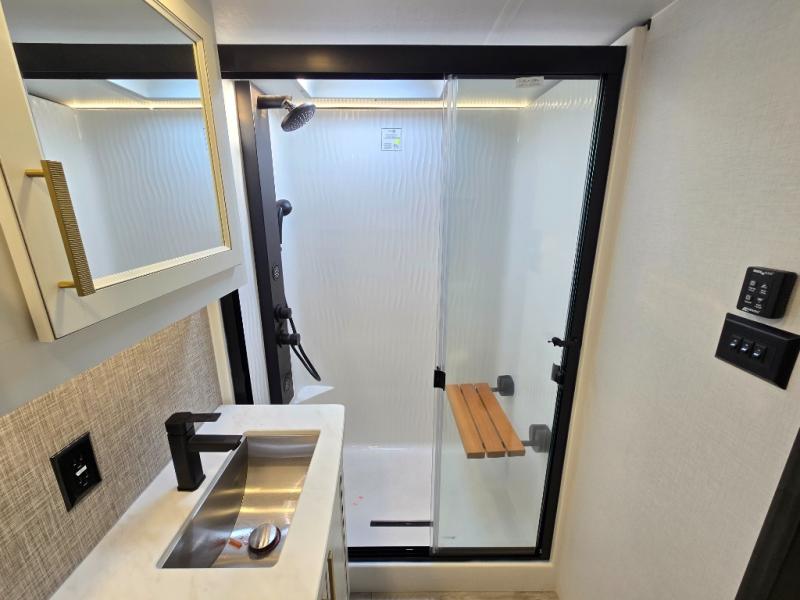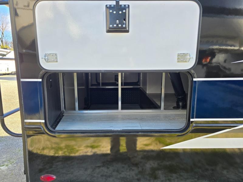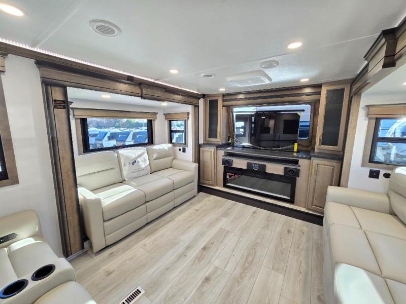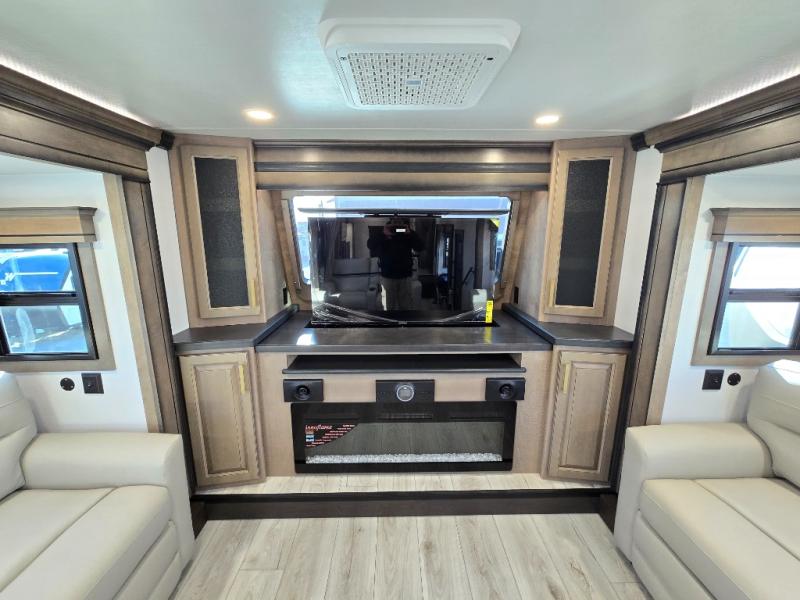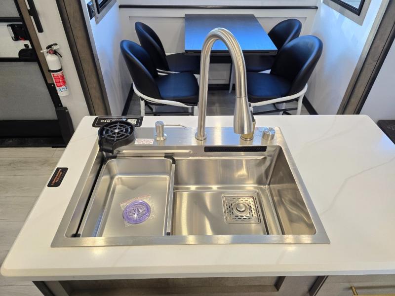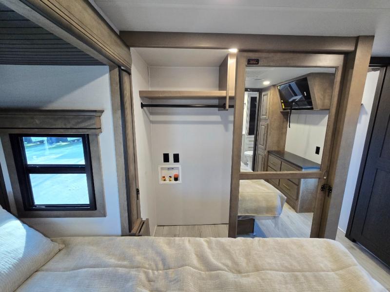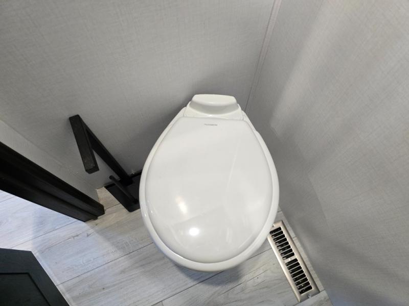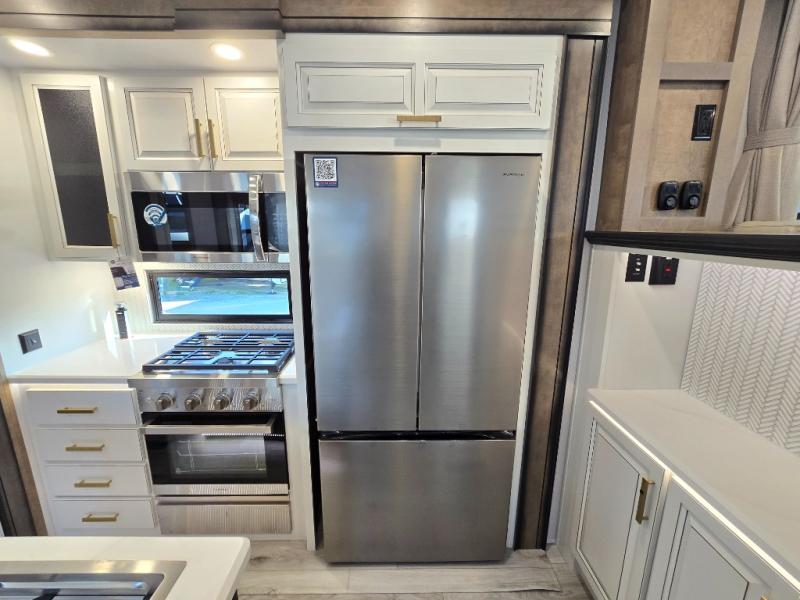 Life will be easier at the campground in this fifth wheel with a bath and a half! The full rear bathroom has a 48" x 30" fiberglass shower with a seat and skylight above, a linen closet to keep your towels close, a dual sink vanity for two to get ready at once, and a barn door to close off the master suite. The bedroom also has a king bed slide with storage underneath across from a dresser with a 32" Smart TV and wardrobe, as well as a large closet with stackable washer and dryer prep. The chef can prepare their best meals with the kitchen island, convection microwave and 24" range, plus there is a pantry/buffet and a pivot dinette to enjoy your meals at. The front living area will have you feeling right at home with the front entertainment center that has a telescoping 50" Smart TV, a 5,000 BTU decorative fireplace heater, and storage on either side. There is also opposing hide-a-bed sofa slides for extra sleeping spaces and power theater seating for even more comfort!