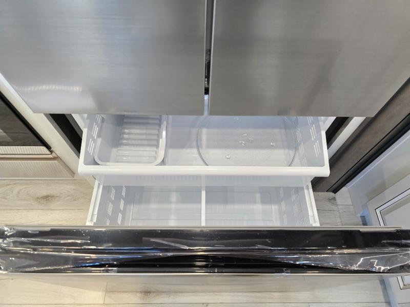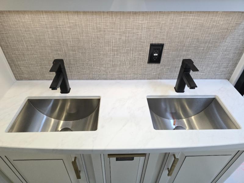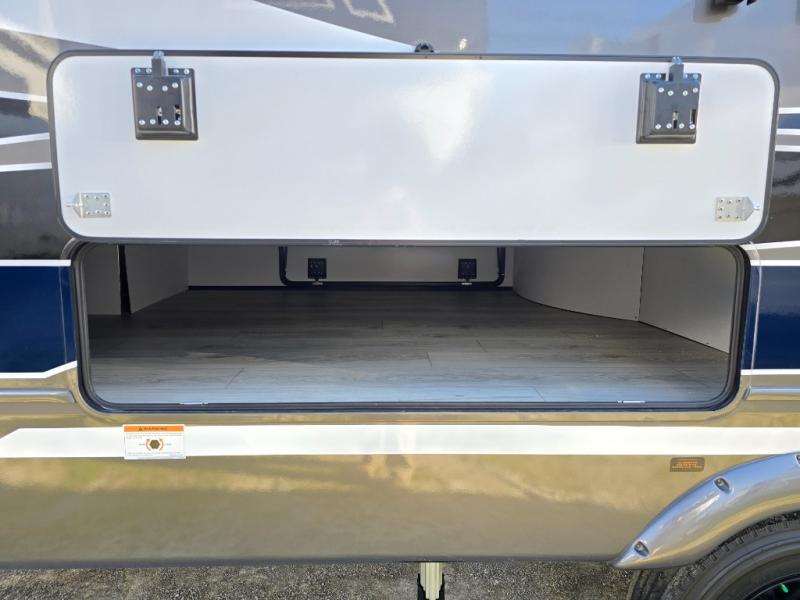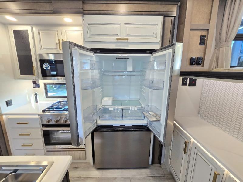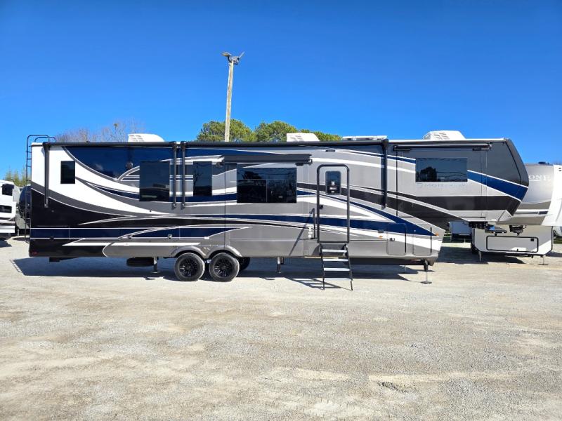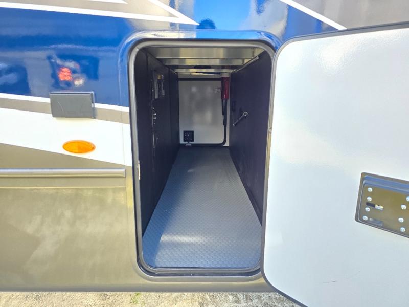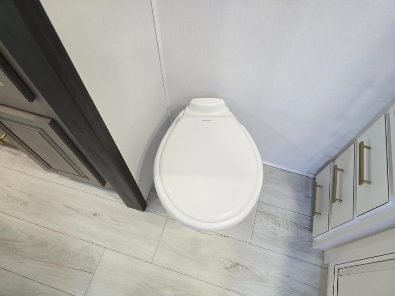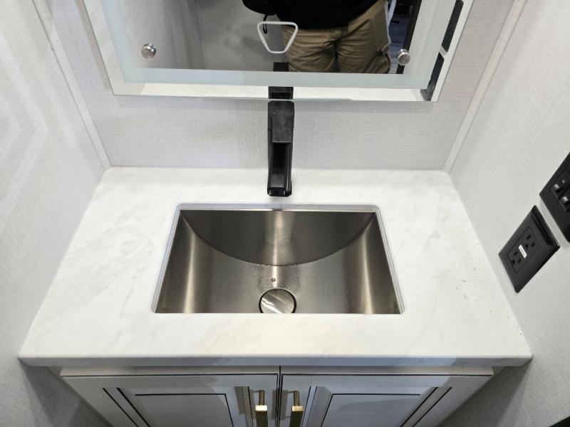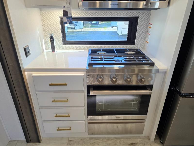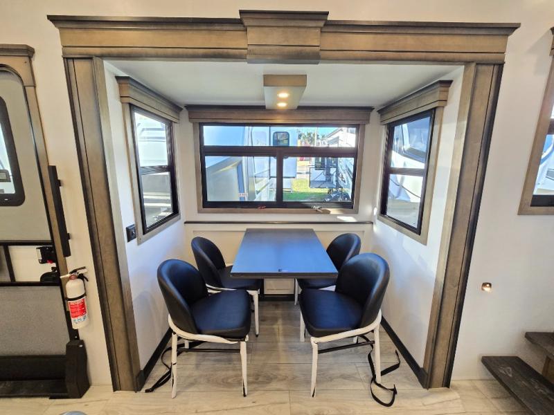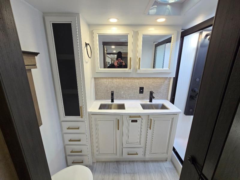 Life will be easier at the campground in this fifth wheel with a bath and a half! The full rear bathroom has a 48" x 30" fiberglass shower with a seat and skylight above, a linen closet to keep your towels close, a dual sink vanity for two to get ready at once, and a barn door to close off the master suite. The bedroom also has a king bed slide with storage underneath across from a dresser with a 32" Smart TV and wardrobe, as well as a large closet with stackable washer and dryer prep. The chef can prepare their best meals with the kitchen island, convection microwave and 24" range, plus there is a pantry/buffet and a pivot dinette to enjoy your meals at. The front living area will have you feeling right at home with the front entertainment center that has a telescoping 50" Smart TV, a 5,000 BTU decorative fireplace heater, and storage on either side. There is also opposing hide-a-bed sofa slides for extra sleeping spaces and power theater seating for even more comfort!