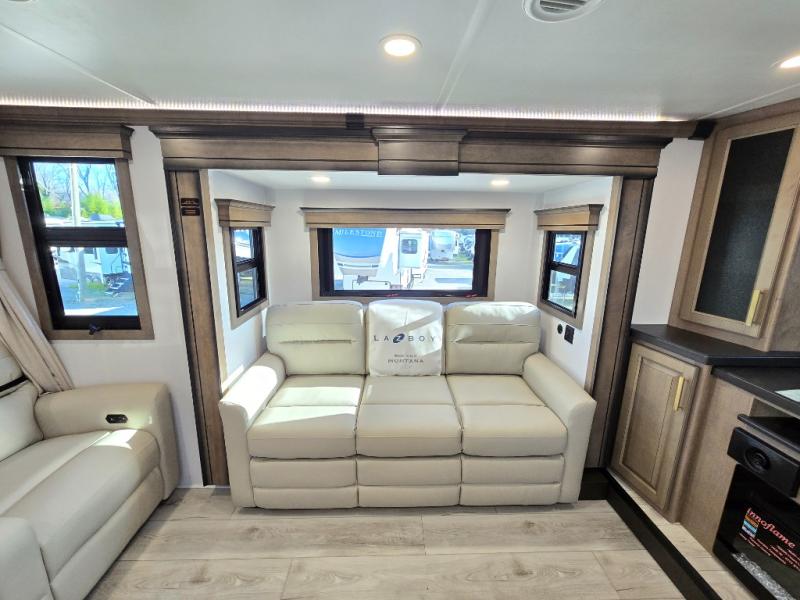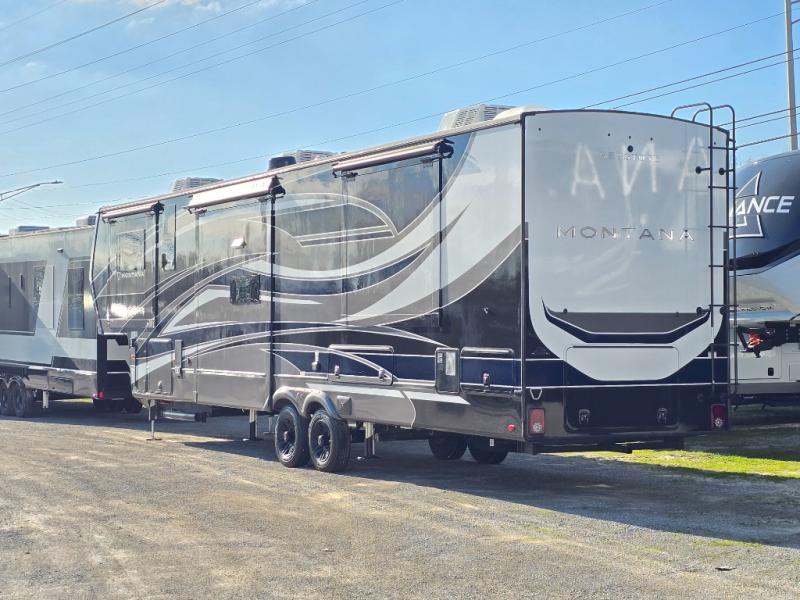 Enjoy luxury, innovation, and the outdoors in any one of Montana's finest fifth wheels. Each set the standard with exceptional features, and exciting factory installed options to provide you a great home on the road. Keystone's 12" I-beam chassis with z-frame technology provides a strong and durable foundation to your fifth wheel, and the four season living package will help extend your camping season. A few other construction features you will appreciate include a MORryde CRE3000 suspension, a fully walkable roof with an alpha seamless TPO membrane system, and 4k square frameless tinted safety glass windows. Each feature stylish interiors with two decor choices paired with beautiful hardwood cabinetry, Beauflor vinyl flooring throughout, central vacuum, plus a La-Z-Boy furniture package for all-around comfort!