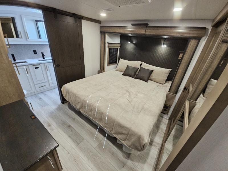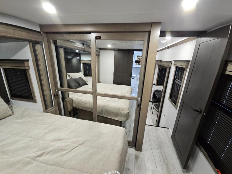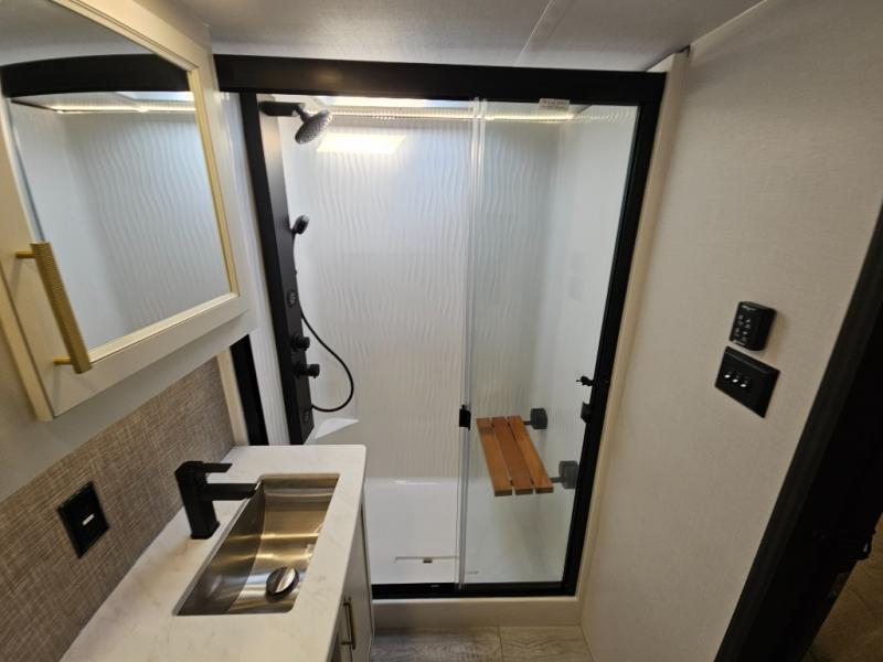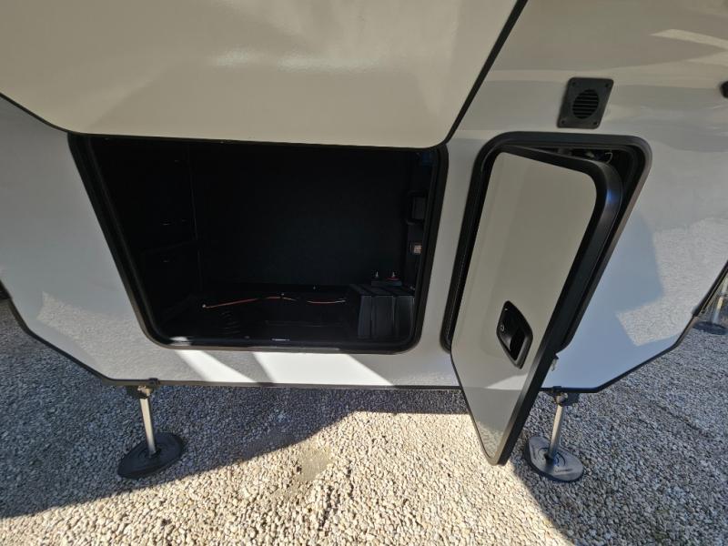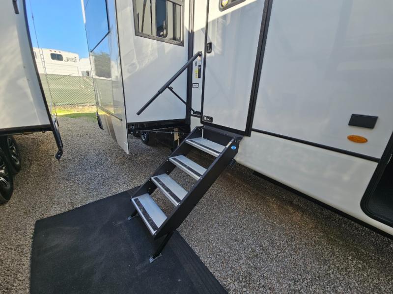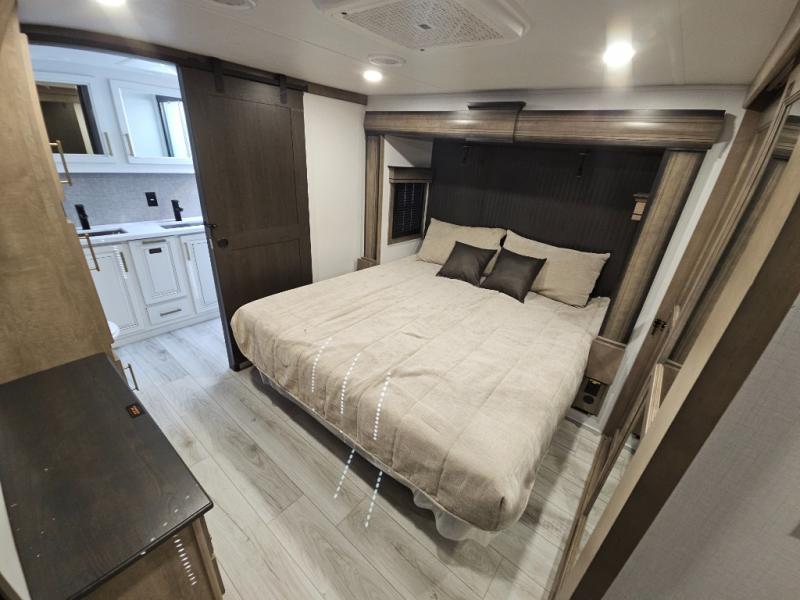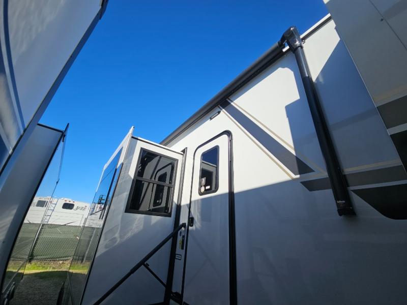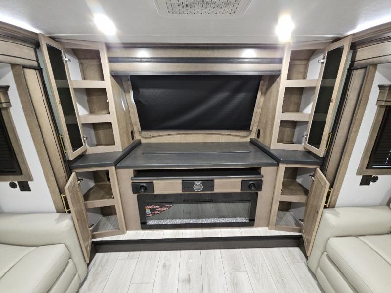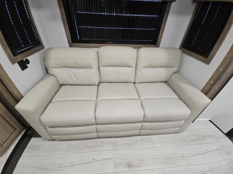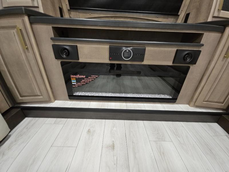 Life will be easier at the campground in this fifth wheel with a bath and a half! The full rear bathroom has a 48" x 30" fiberglass shower with a seat and skylight above, a linen closet to keep your towels close, a dual sink vanity for two to get ready at once, and a barn door to close off the master suite. The bedroom also has a king bed slide with storage underneath across from a dresser with a 32" Smart TV and wardrobe, as well as a large closet with stackable washer and dryer prep. The chef can prepare their best meals with the kitchen island, convection microwave and 24" range, plus there is a pantry/buffet and a pivot dinette to enjoy your meals at. The front living area will have you feeling right at home with the front entertainment center that has a telescoping 50" Smart TV, a 5,000 BTU decorative fireplace heater, and storage on either side. There is also opposing hide-a-bed sofa slides for extra sleeping spaces and power theater seating for even more comfort!