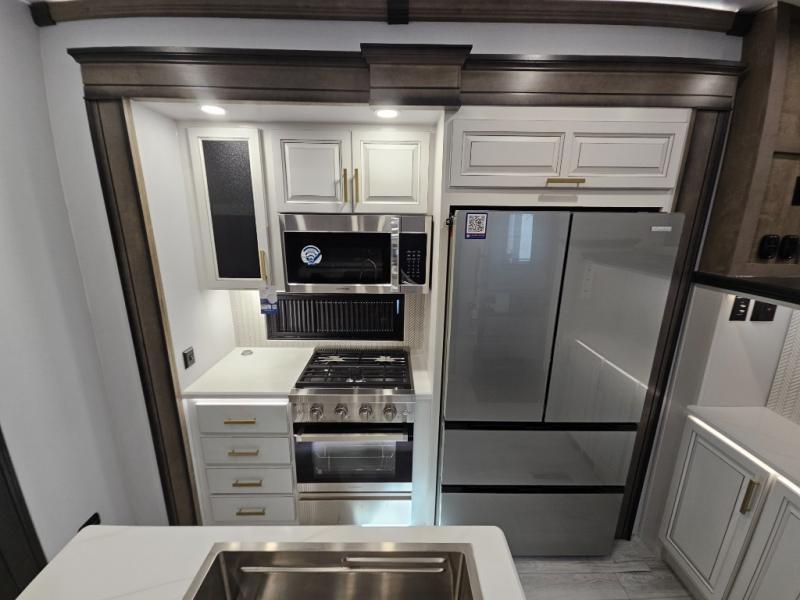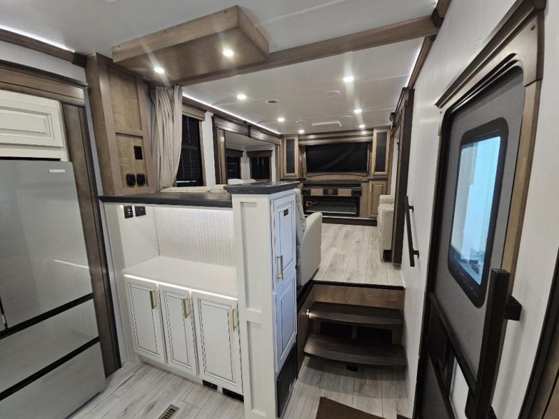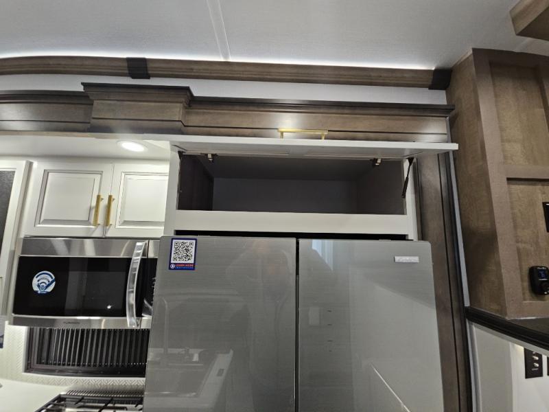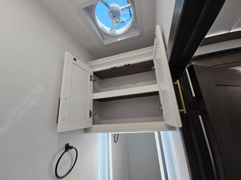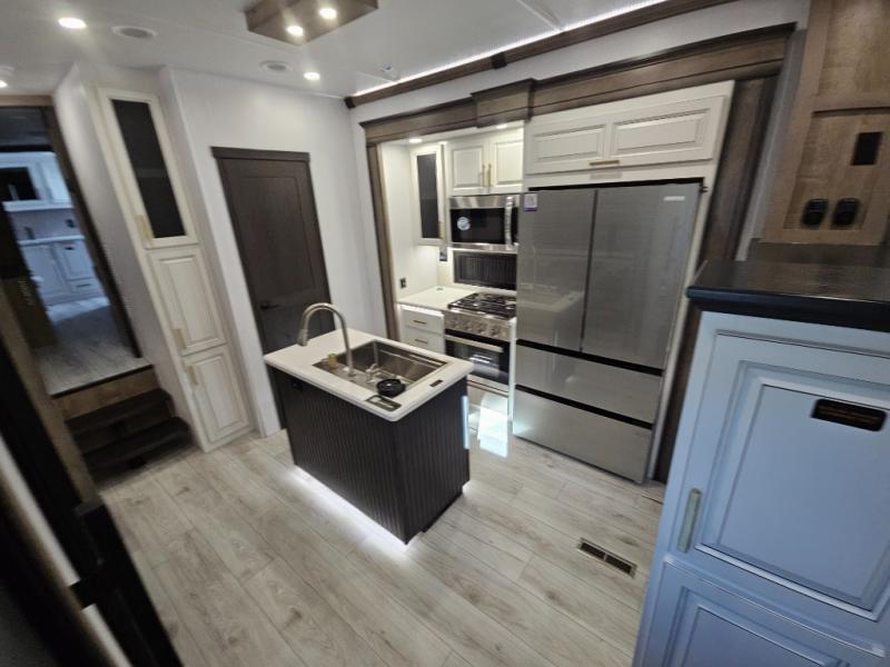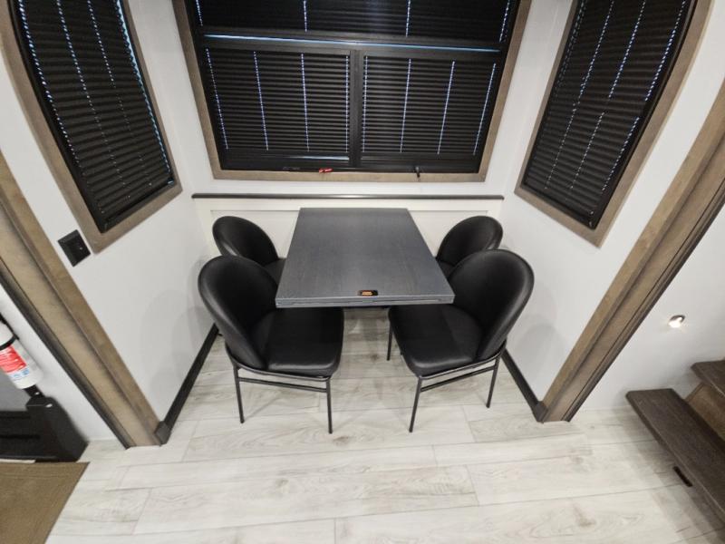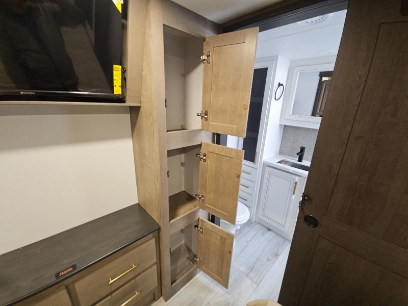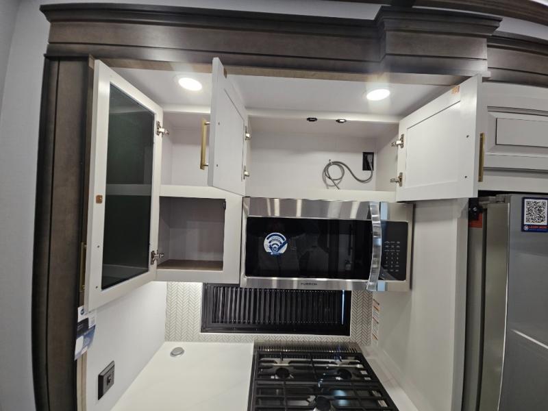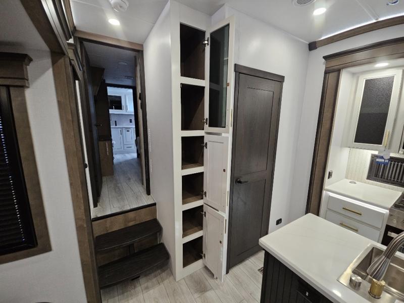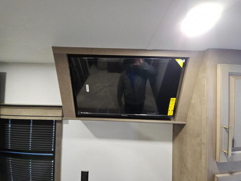 Life will be easier at the campground in this fifth wheel with a bath and a half! The full rear bathroom has a 48" x 30" fiberglass shower with a seat and skylight above, a linen closet to keep your towels close, a dual sink vanity for two to get ready at once, and a barn door to close off the master suite. The bedroom also has a king bed slide with storage underneath across from a dresser with a 32" Smart TV and wardrobe, as well as a large closet with stackable washer and dryer prep. The chef can prepare their best meals with the kitchen island, convection microwave and 24" range, plus there is a pantry/buffet and a pivot dinette to enjoy your meals at. The front living area will have you feeling right at home with the front entertainment center that has a telescoping 50" Smart TV, a 5,000 BTU decorative fireplace heater, and storage on either side. There is also opposing hide-a-bed sofa slides for extra sleeping spaces and power theater seating for even more comfort!