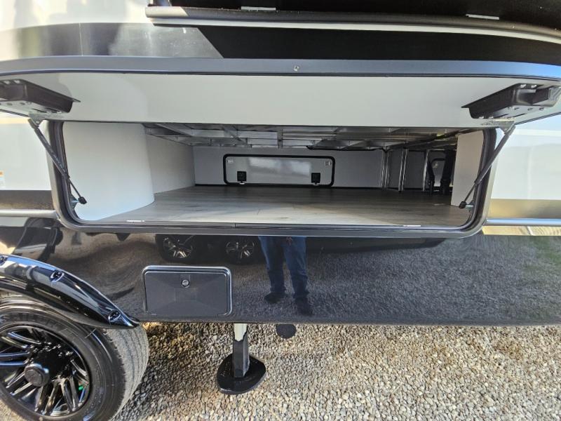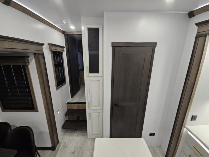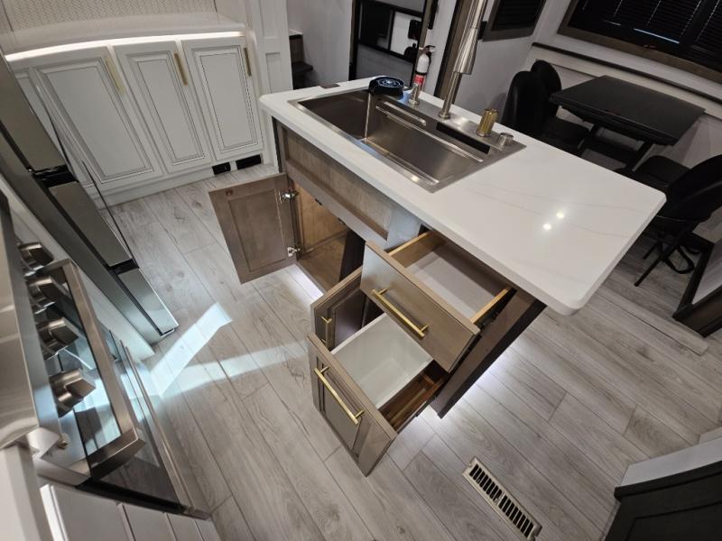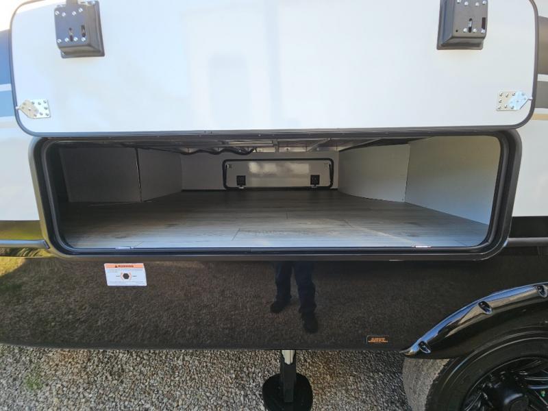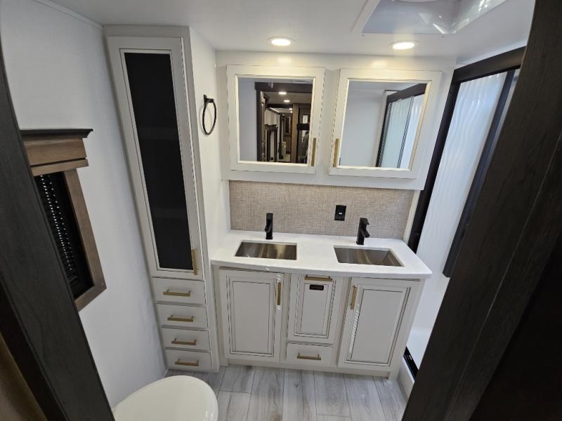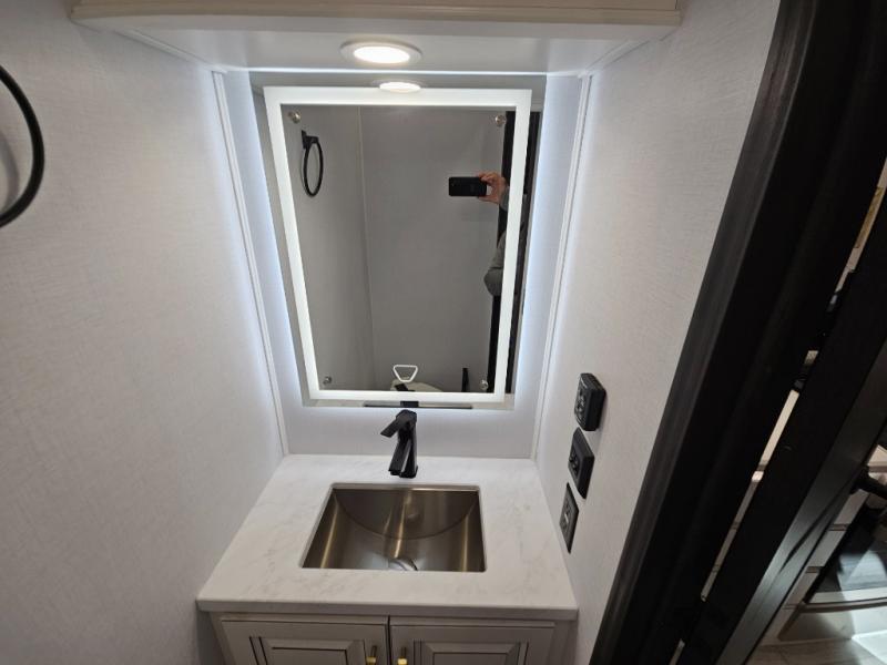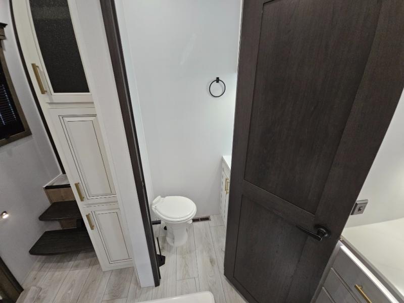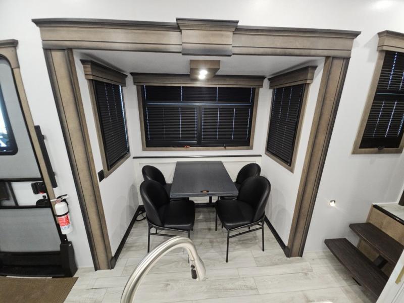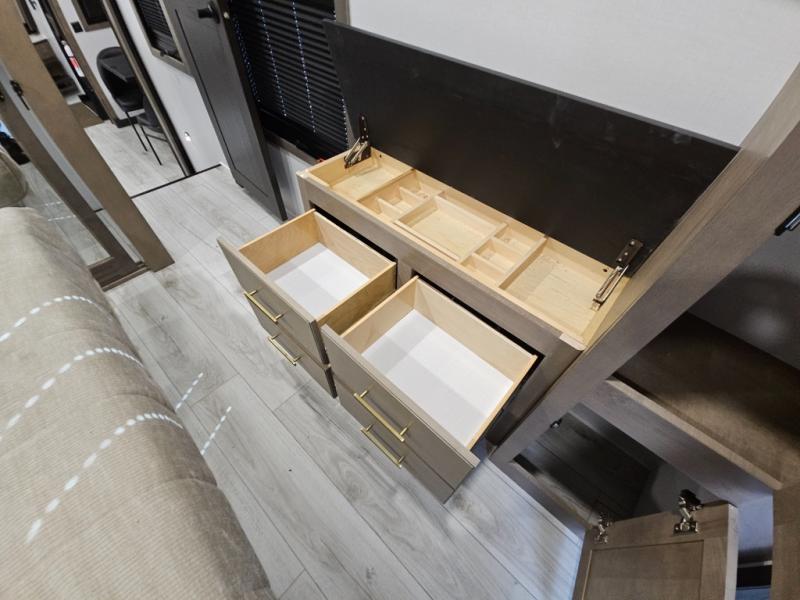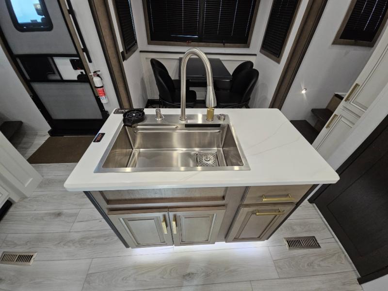 Life will be easier at the campground in this fifth wheel with a bath and a half! The full rear bathroom has a 48" x 30" fiberglass shower with a seat and skylight above, a linen closet to keep your towels close, a dual sink vanity for two to get ready at once, and a barn door to close off the master suite. The bedroom also has a king bed slide with storage underneath across from a dresser with a 32" Smart TV and wardrobe, as well as a large closet with stackable washer and dryer prep. The chef can prepare their best meals with the kitchen island, convection microwave and 24" range, plus there is a pantry/buffet and a pivot dinette to enjoy your meals at. The front living area will have you feeling right at home with the front entertainment center that has a telescoping 50" Smart TV, a 5,000 BTU decorative fireplace heater, and storage on either side. There is also opposing hide-a-bed sofa slides for extra sleeping spaces and power theater seating for even more comfort!