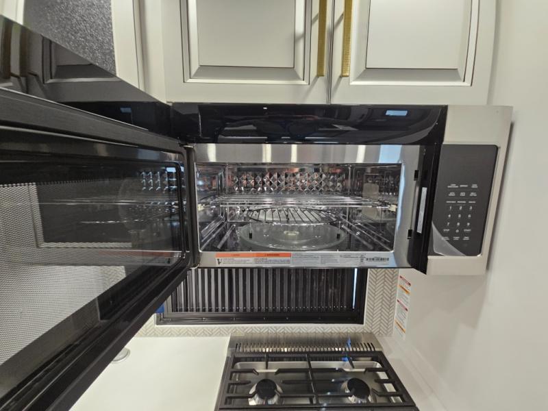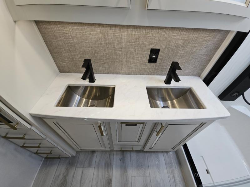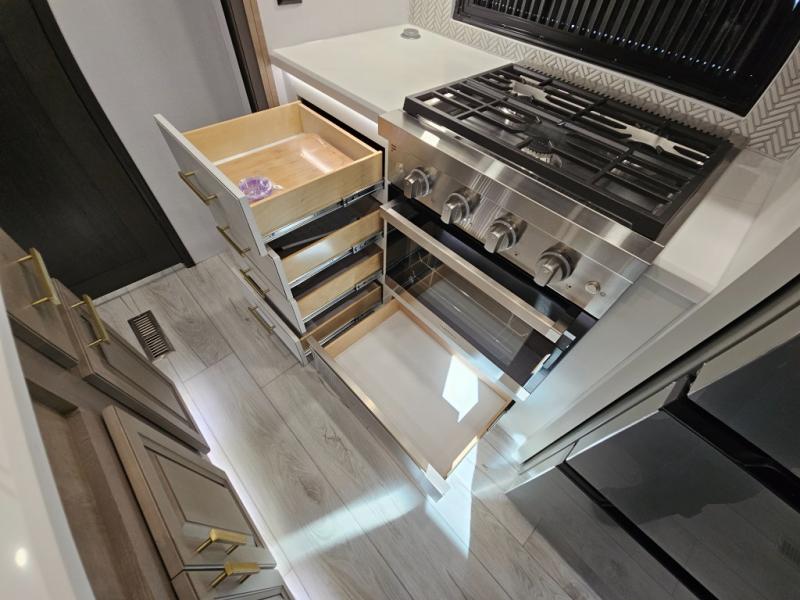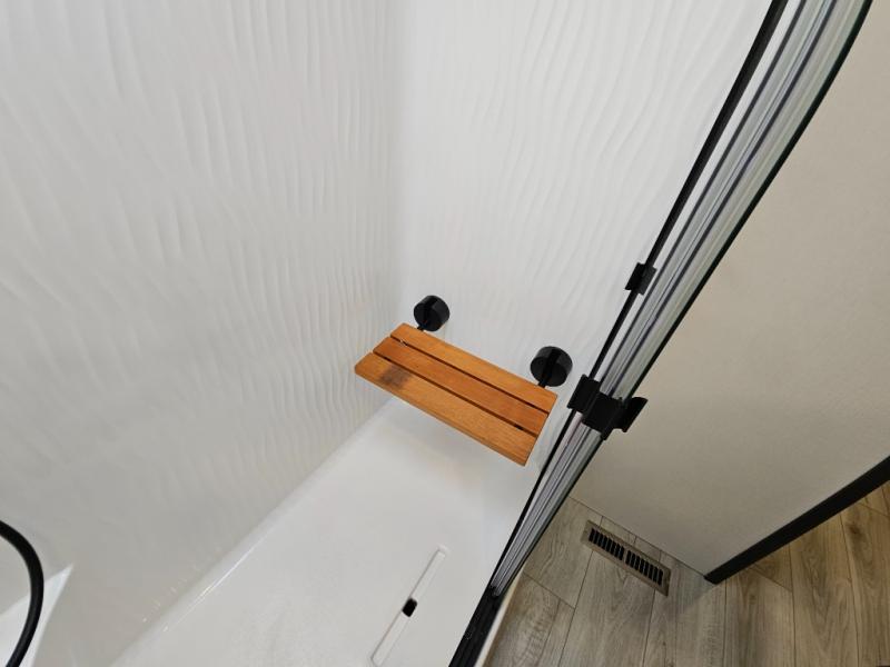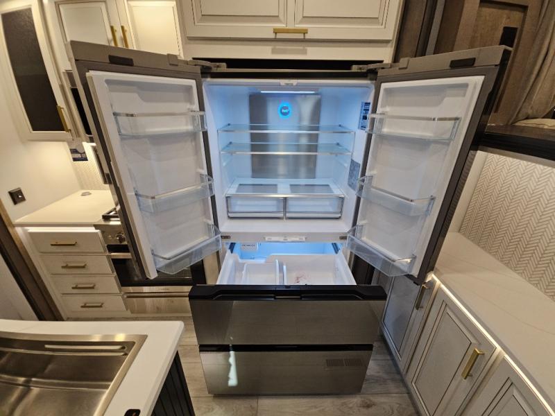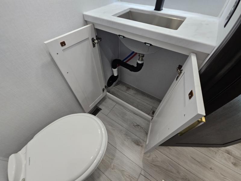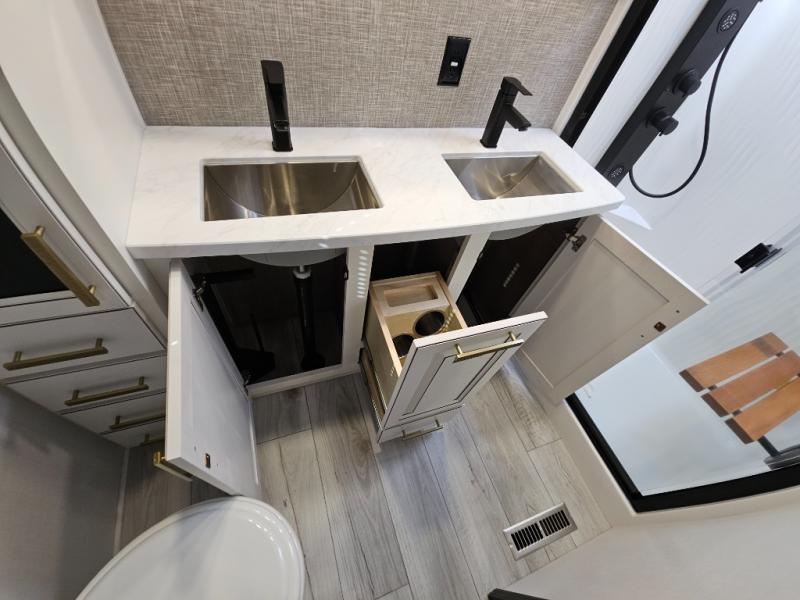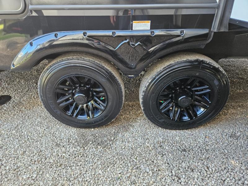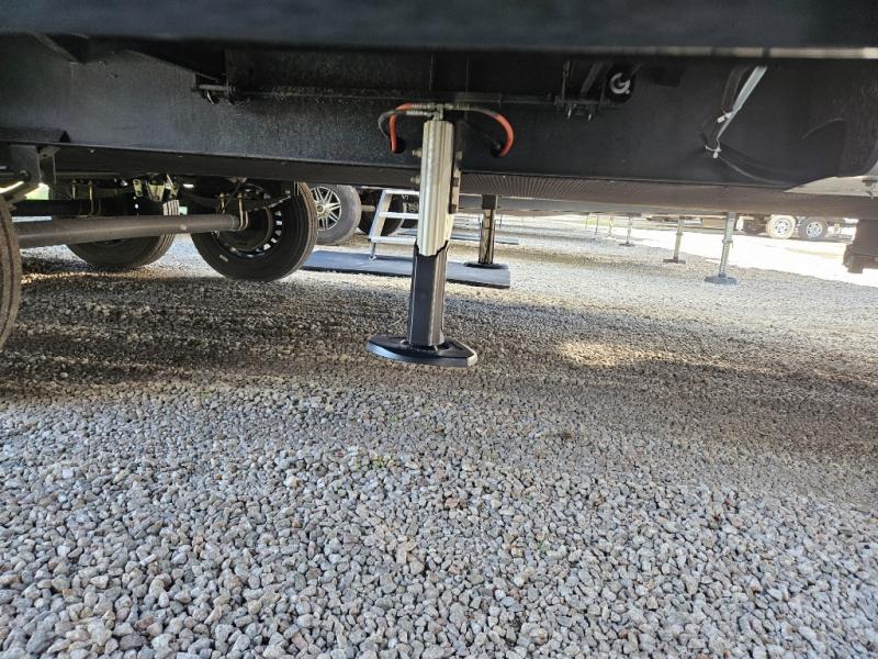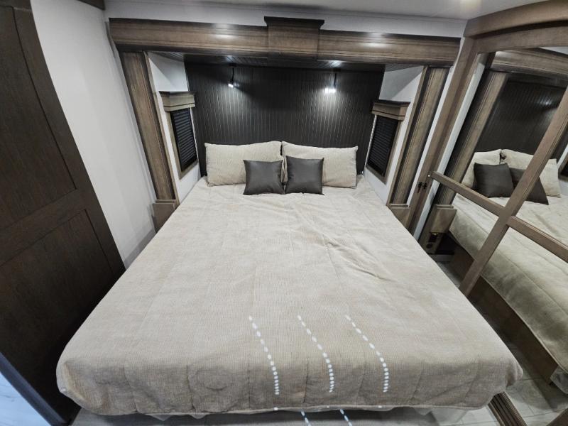 Life will be easier at the campground in this fifth wheel with a bath and a half! The full rear bathroom has a 48" x 30" fiberglass shower with a seat and skylight above, a linen closet to keep your towels close, a dual sink vanity for two to get ready at once, and a barn door to close off the master suite. The bedroom also has a king bed slide with storage underneath across from a dresser with a 32" Smart TV and wardrobe, as well as a large closet with stackable washer and dryer prep. The chef can prepare their best meals with the kitchen island, convection microwave and 24" range, plus there is a pantry/buffet and a pivot dinette to enjoy your meals at. The front living area will have you feeling right at home with the front entertainment center that has a telescoping 50" Smart TV, a 5,000 BTU decorative fireplace heater, and storage on either side. There is also opposing hide-a-bed sofa slides for extra sleeping spaces and power theater seating for even more comfort!