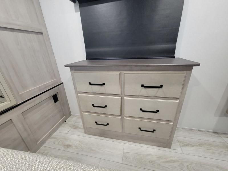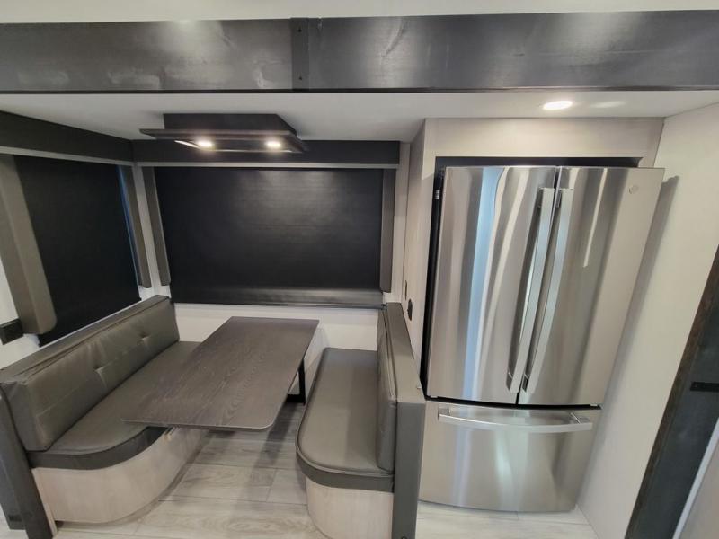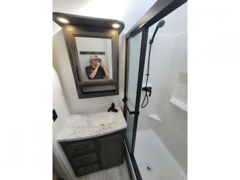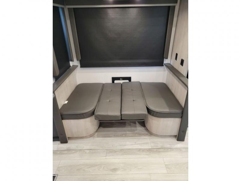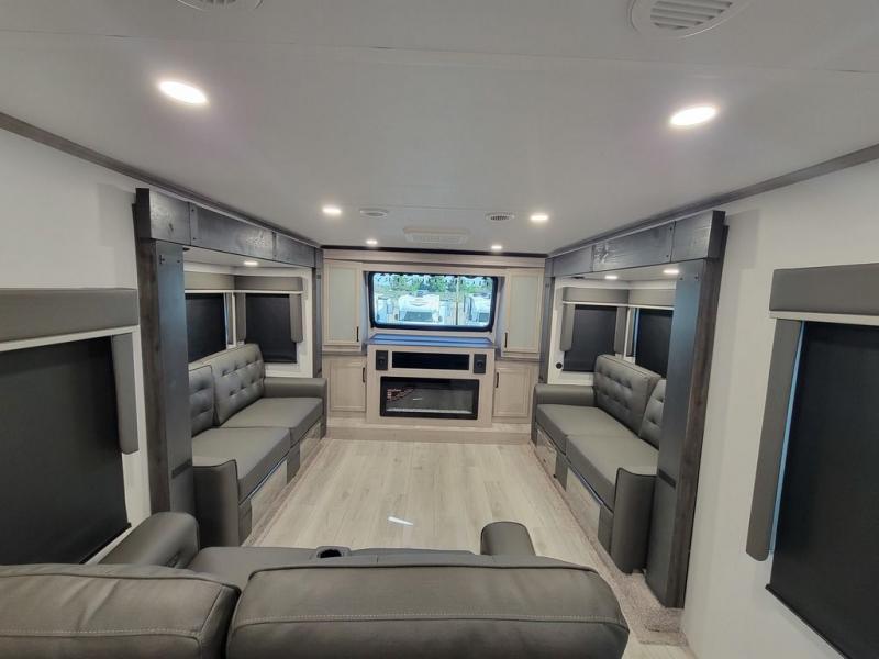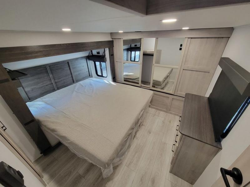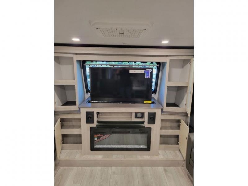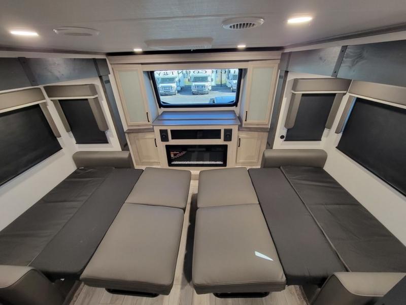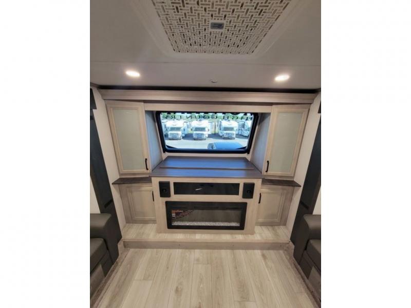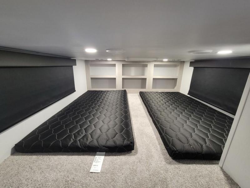 Include all of your favorite people on your next adventure in this Montana High Country fifth wheel! Not only is there a rear private bedroom with a king-size bed for you, but there is also a loft above with stairs that take you to the bunk mats. Now your kids will have their own space too. You can even host a few other travelers up front in the separate living room on the two hide-a-bed sofas. This area will be perfect for cozy sleeping because of the fireplace, and you can even watch a movie as you drift off to sleep because of the 50" LED TV too. The full bathroom has a 48" x 30" shower with seat, and the kitchen has a breakfast bar that you can sit at to eat your cereal each morning