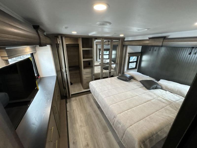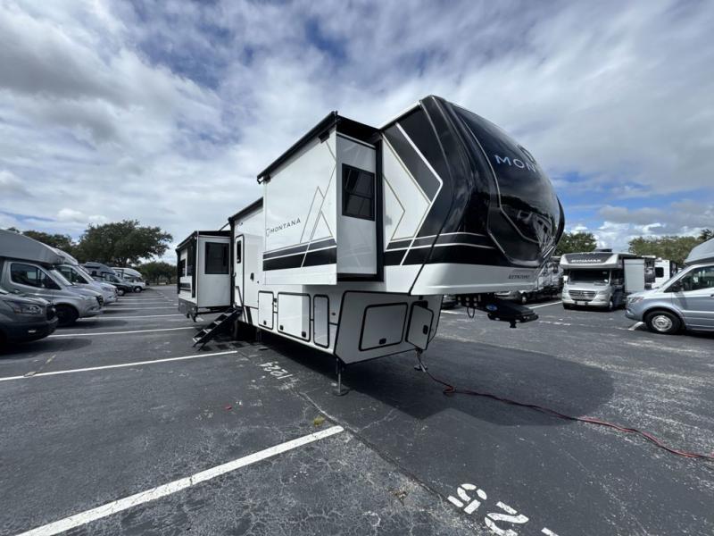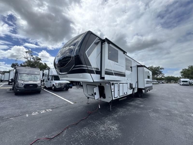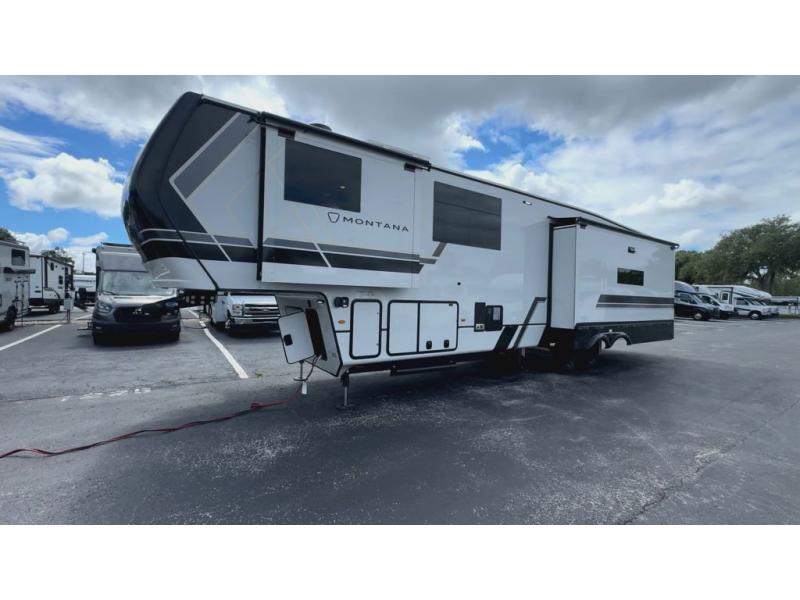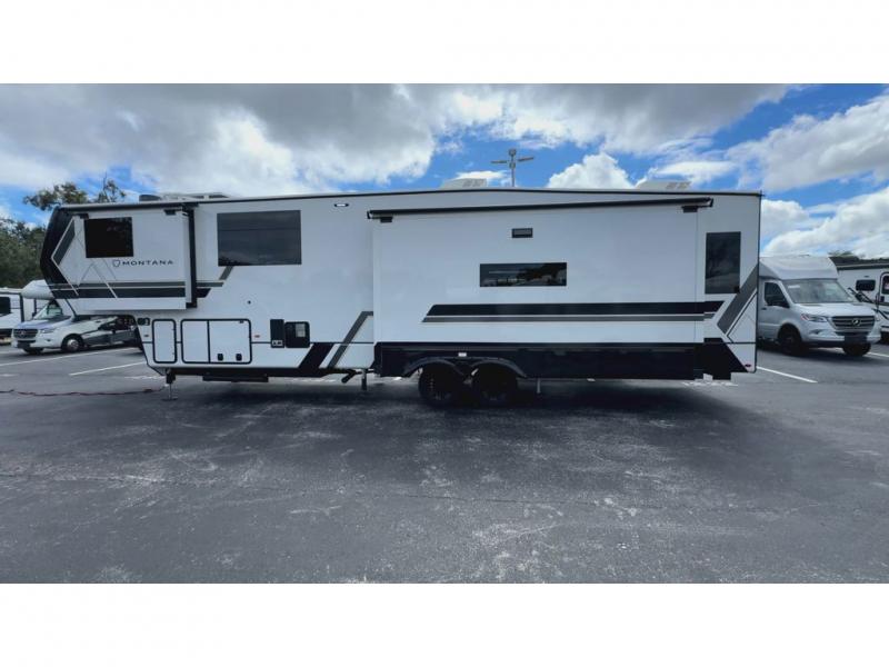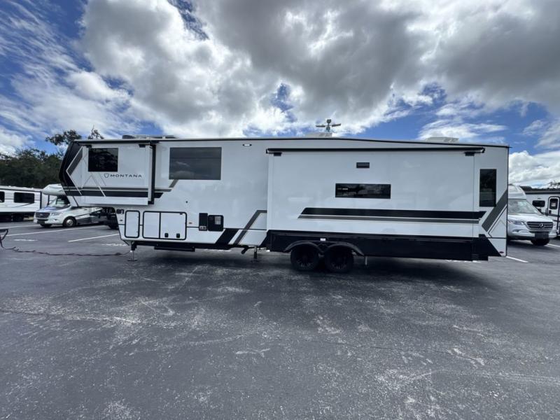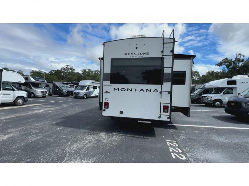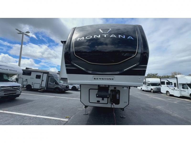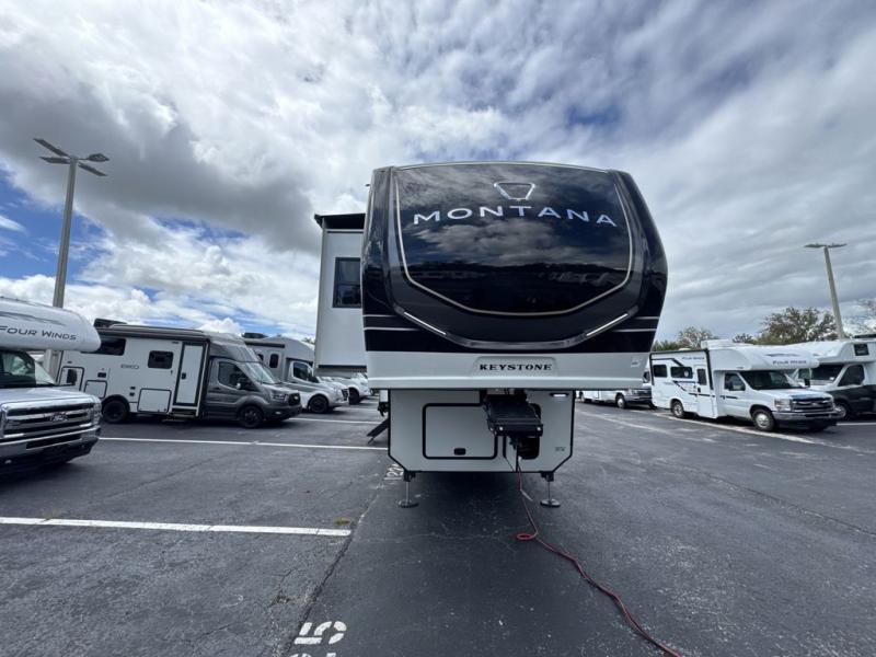 Enjoy luxury, innovation, and the outdoors in any one of Montana's finest fifth wheels. Each set the standard with exceptional features, and exciting factory installed options to provide you a great home on the road. Keystone's 12" I-beam chassis with z-frame technology provides a strong and durable foundation to your fifth wheel, and the four season living package will help extend your camping season. A few other construction features you will appreciate include a MORryde CRE3000 suspension, a fully walkable roof with an alpha seamless TPO membrane system, and 4k square frameless tinted safety glass windows. Each feature stylish interiors with two decor choices paired with beautiful hardwood cabinetry, Beauflor vinyl flooring throughout, central vacuum, plus a La-Z-Boy furniture package for all-around comfort!