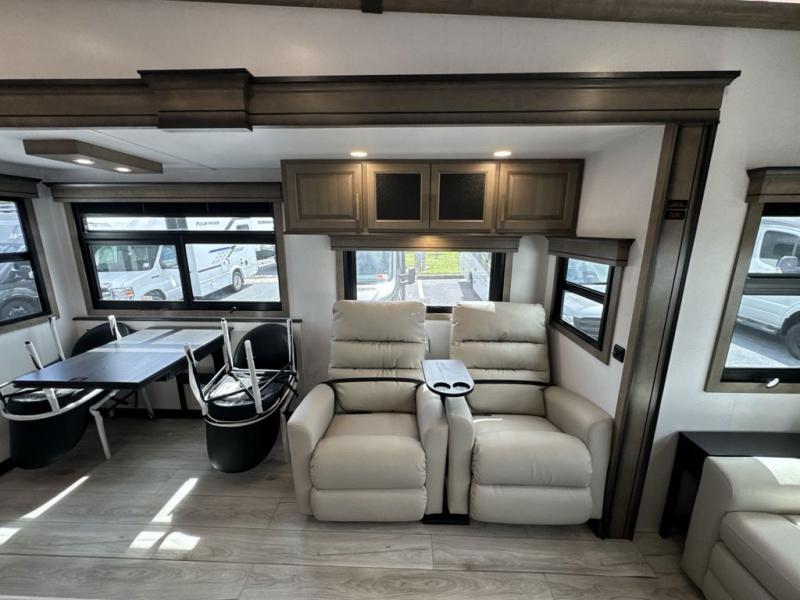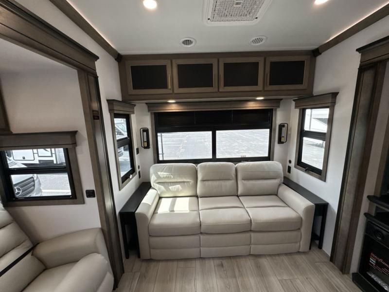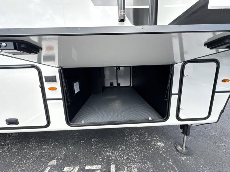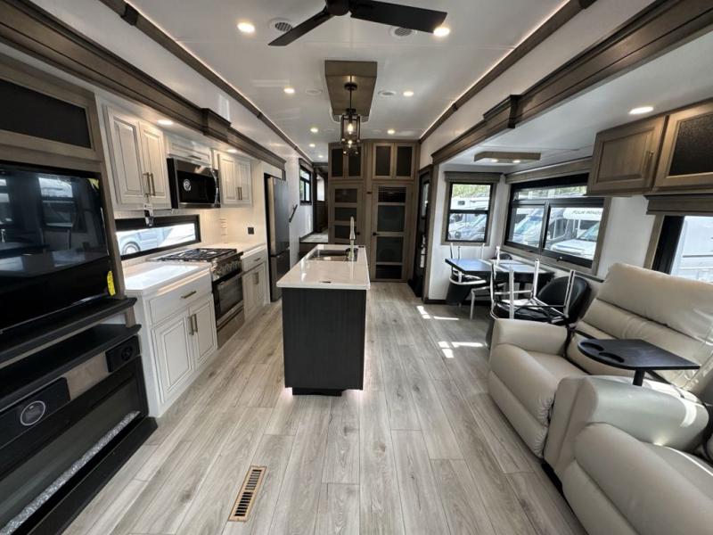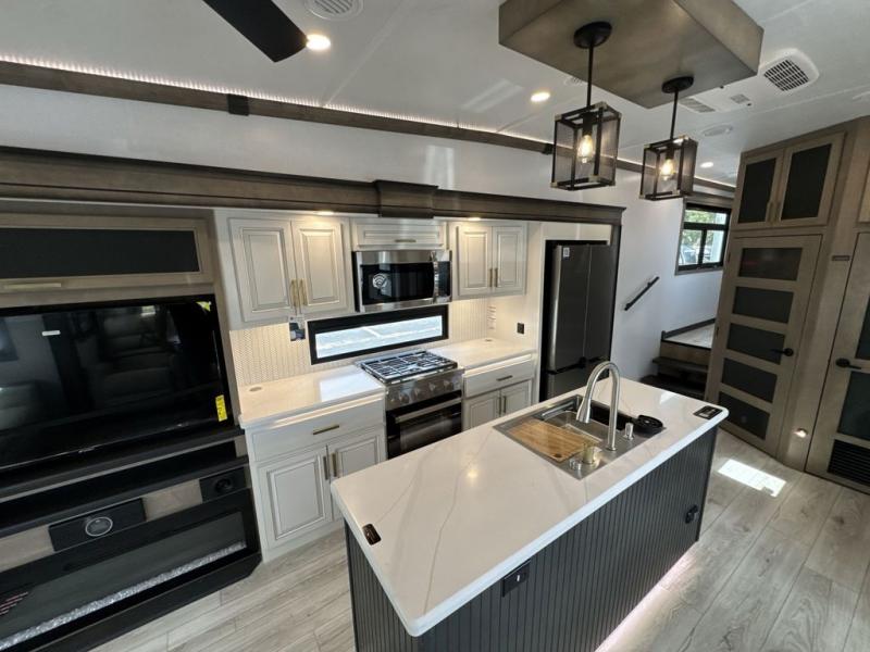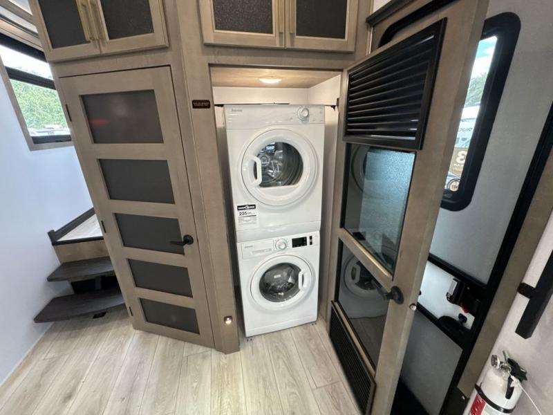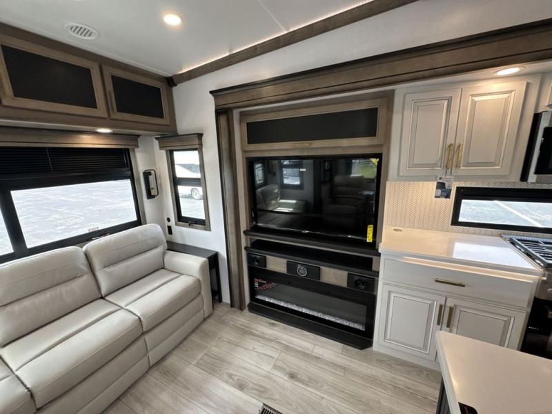 Enjoy a home away from home with this fifth wheel! The front private bedroom has a king bed slide with storage underneath across from a 32" Smart HDTV with drawers below it, a large front closet, and a sliding door to close it all off. Freshen up each morning in the full bathroom with the 48" x 30" fiberglass shower with a seat and skylight above for more natural lighting as you get ready at the dual sink vanity. The kitchen has everything you need to prepare your best meals including extra countertop space on the kitchen island and even a closet with washer/dryer prep so you can quickly grab a clean dish towel. Enjoy your meals at the pivot dinette and then relax on the rear hide-a-bed sofa or the residential power recliners across from the entertainment center with a 5,000 BTU decorative fireplace heater. There is even a 50" Smart HDTV to watch your favorite movies!