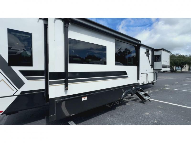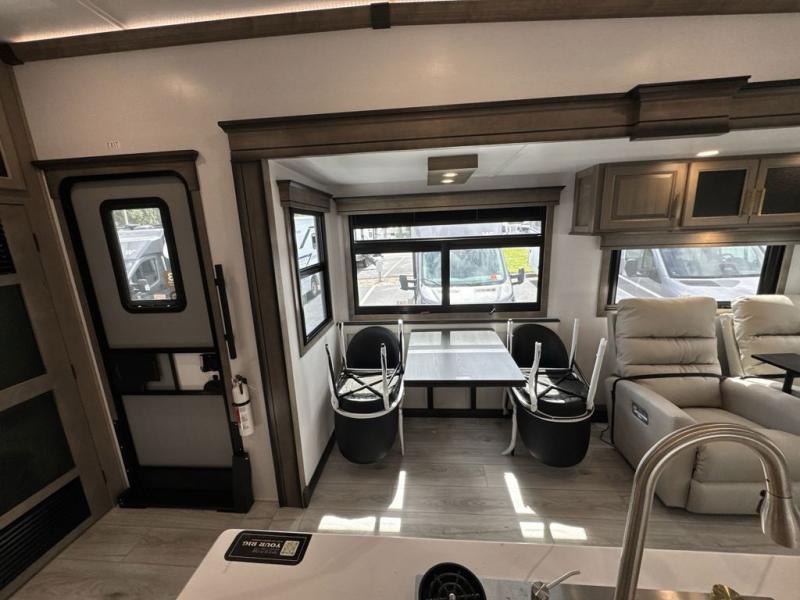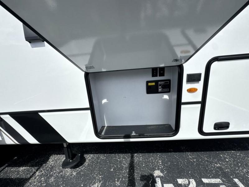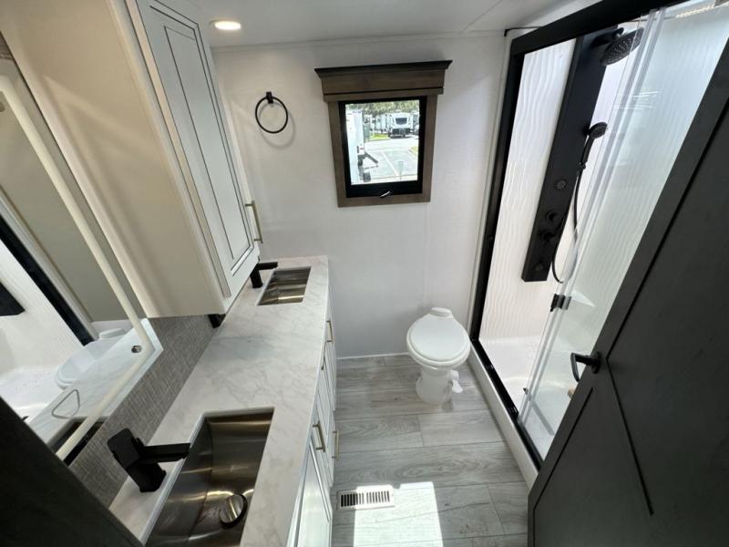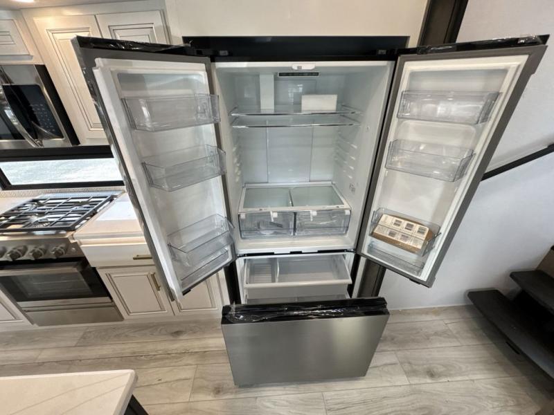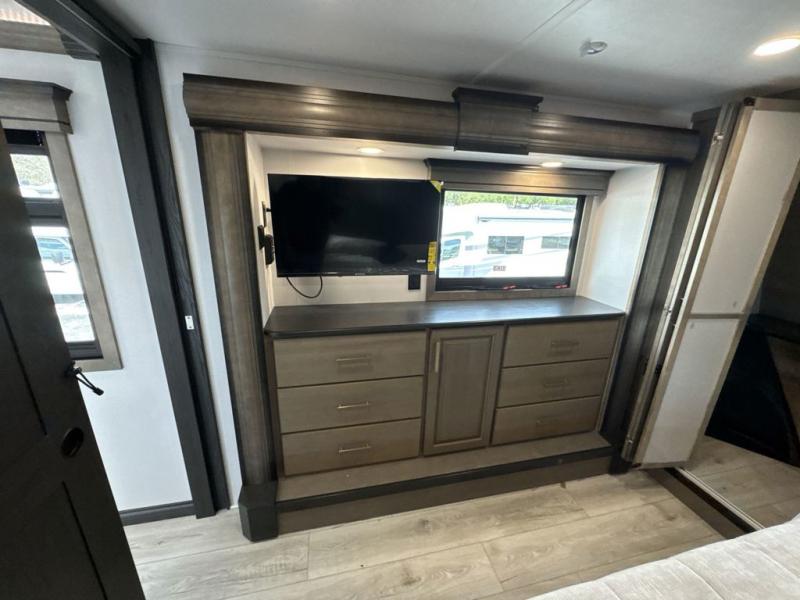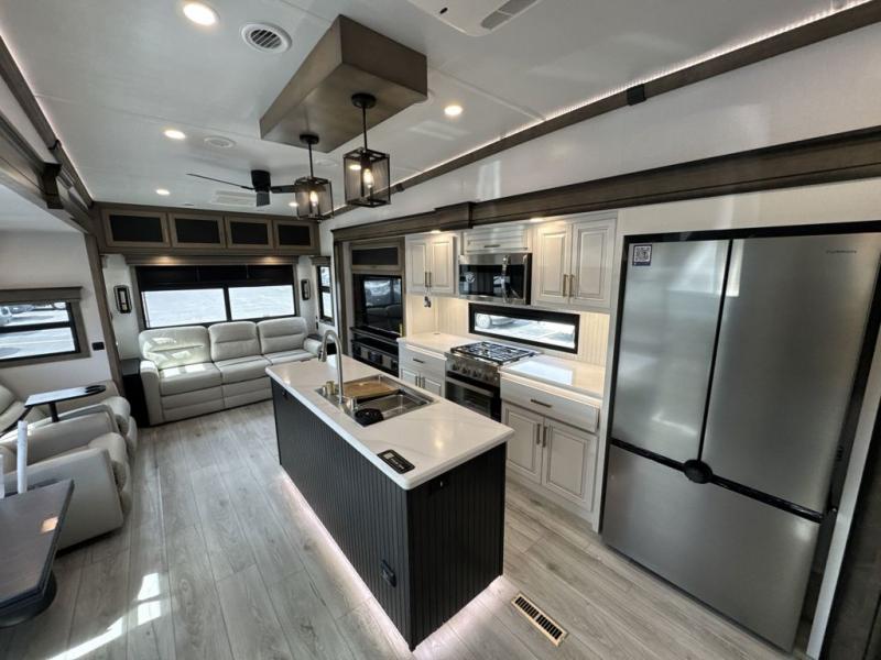 Enjoy a home away from home with this fifth wheel! The front private bedroom has a king bed slide with storage underneath across from a 32" Smart HDTV with drawers below it, a large front closet, and a sliding door to close it all off. Freshen up each morning in the full bathroom with the 48" x 30" fiberglass shower with a seat and skylight above for more natural lighting as you get ready at the dual sink vanity. The kitchen has everything you need to prepare your best meals including extra countertop space on the kitchen island and even a closet with washer/dryer prep so you can quickly grab a clean dish towel. Enjoy your meals at the pivot dinette and then relax on the rear hide-a-bed sofa or the residential power recliners across from the entertainment center with a 5,000 BTU decorative fireplace heater. There is even a 50" Smart HDTV to watch your favorite movies!