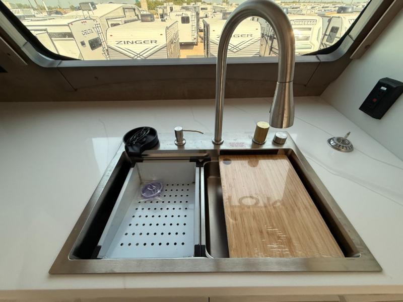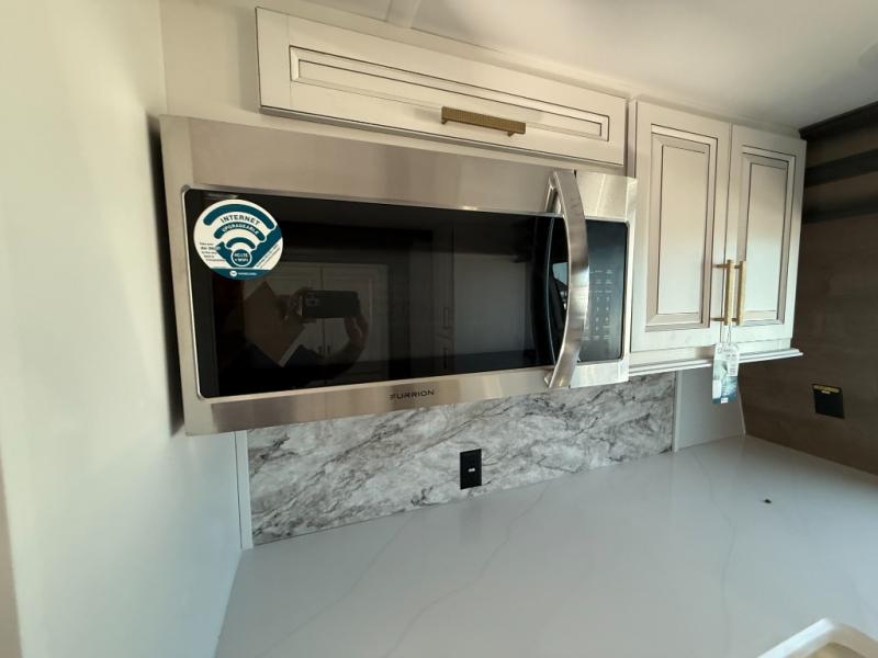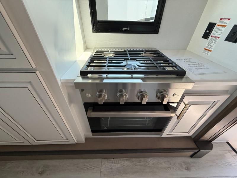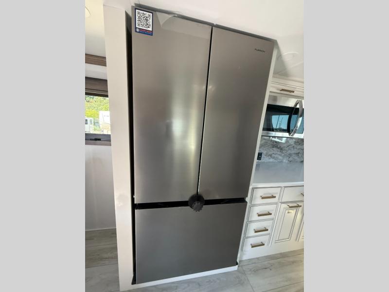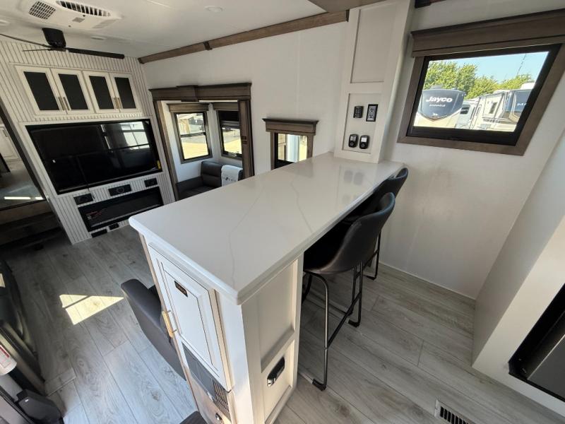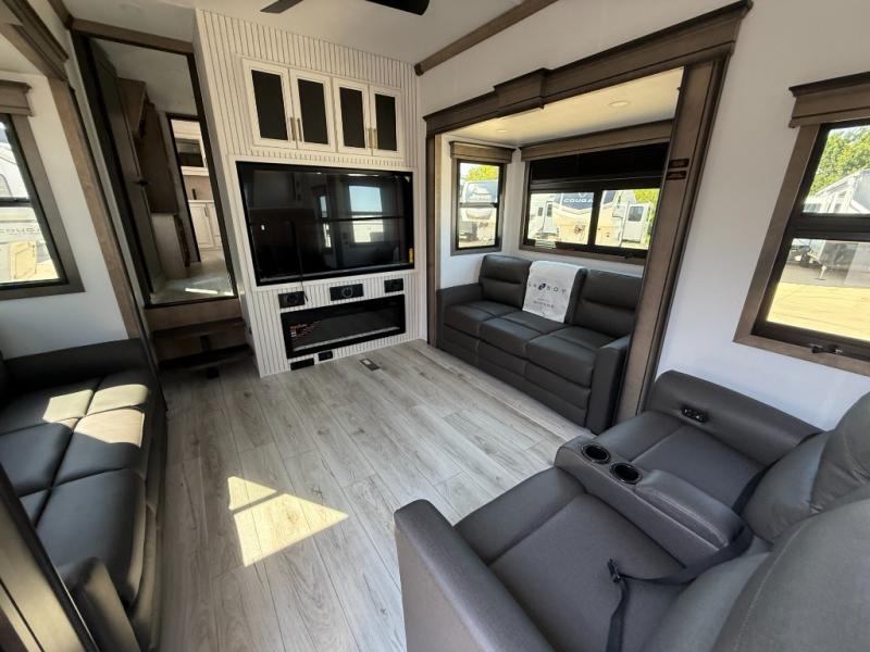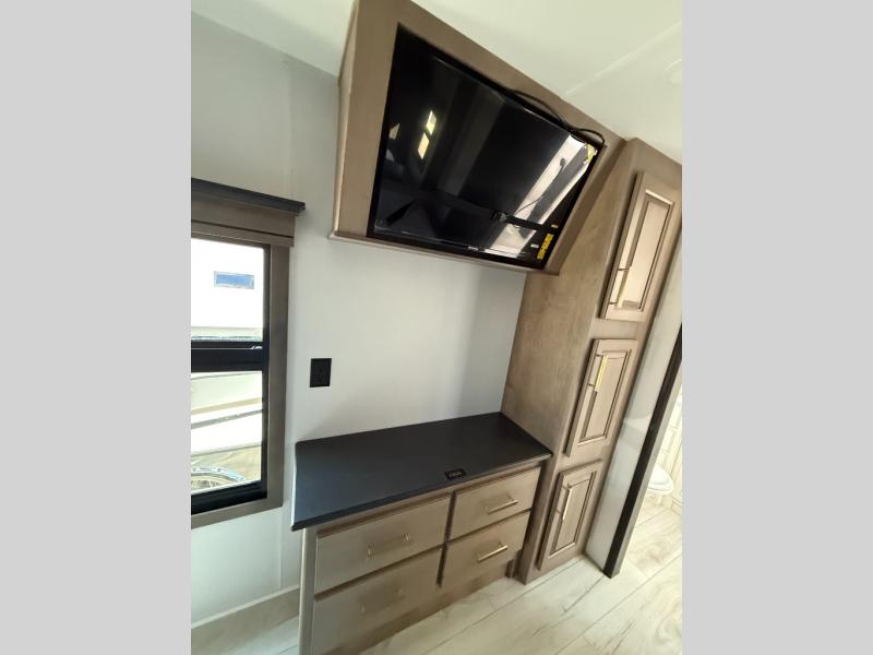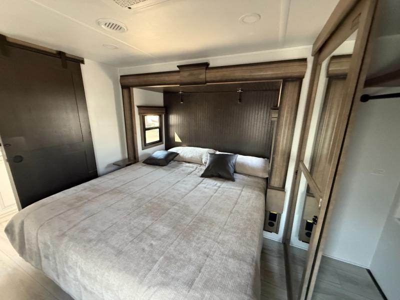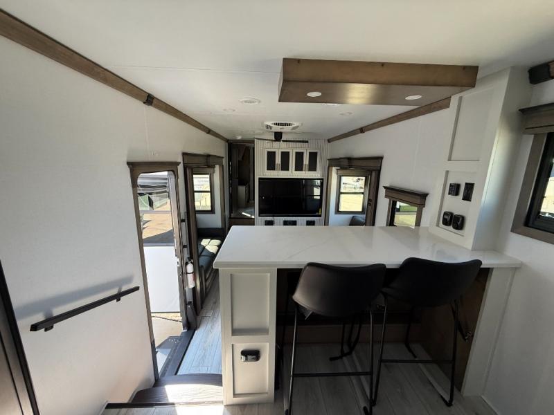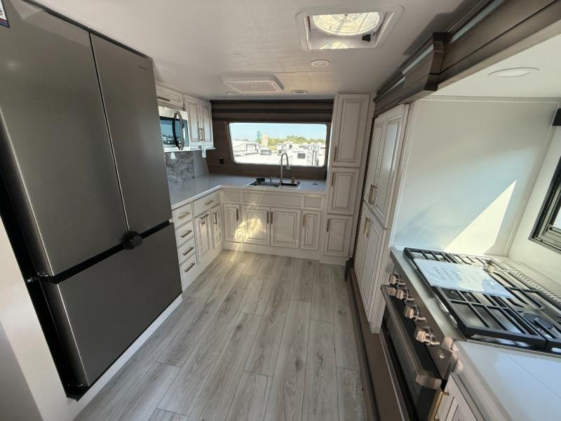 The perfect RV when you like to take "home"' with you when you travel! This Montana fifth wheel gives you the space you want and it feels like home with plenty of features to love and keep you comfortable when you are out enjoying your adventures. Four slides in total give each space plenty of room, the raised front kitchen has everything you need to cook up meals and snacks just like at home. An 18 cu. ft. residential refrigerator with an ice maker, convection microwave oven, and large sink, plus pantry space will make any chef happy. The mid-coach area just inside the door features a living room with dual opposing hide-a-bed slides as well as powered theater seating and a fireplace with Smart TV opposite. Step up to a bedroom with a king bed slide, a dresser, and closet featuring prep for a stackable washer and dryer. A sliding door leads into the rear spacious master bath featuring a 48" x 30" shower, a toilet, linen storage and a vanity with two sinks!