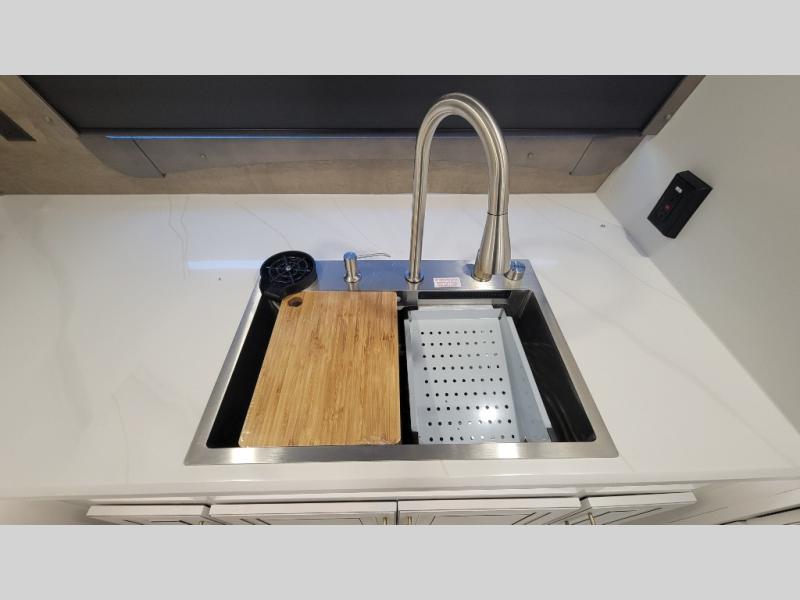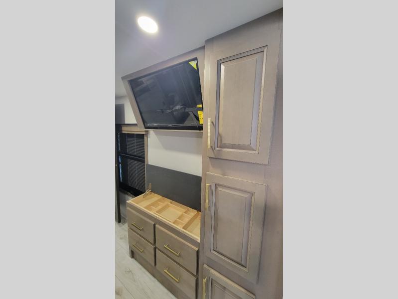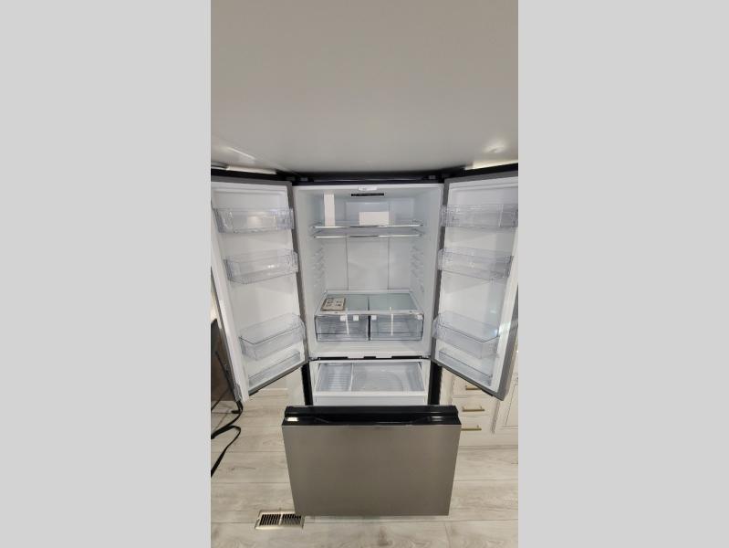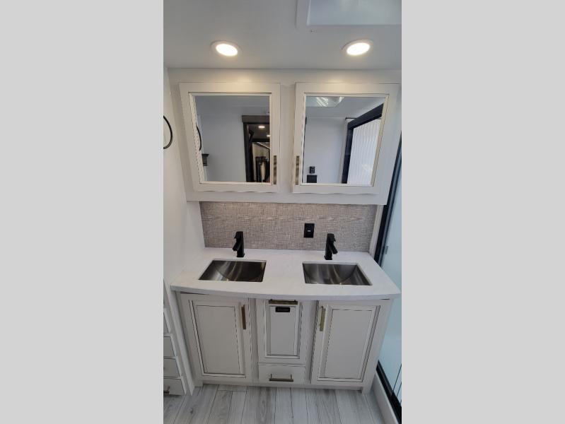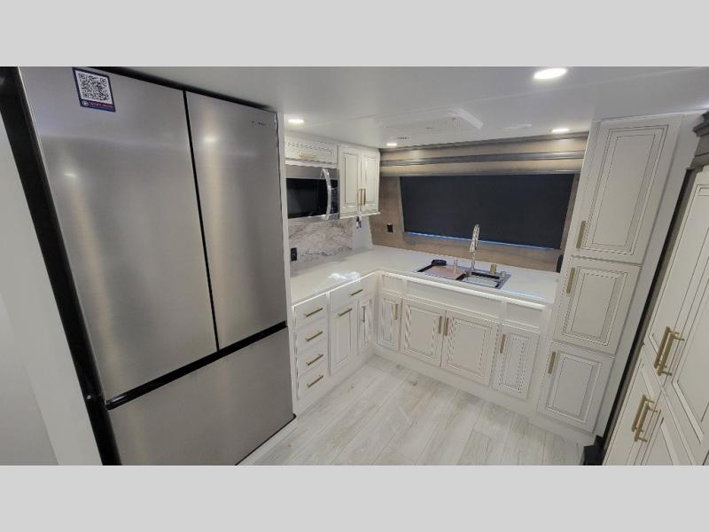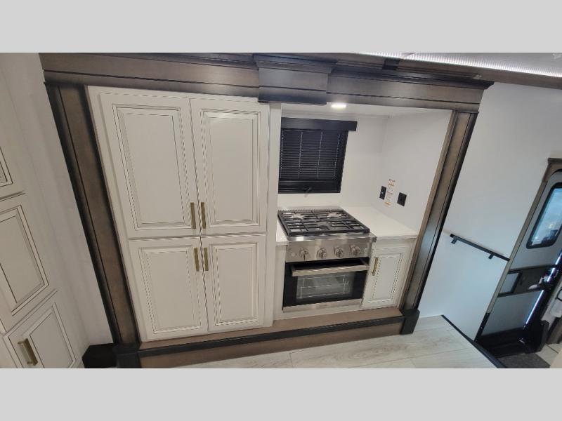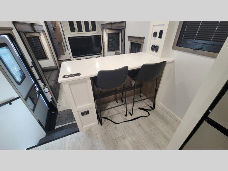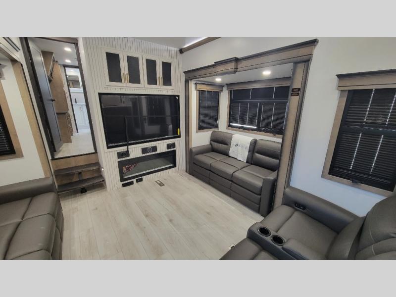 The perfect RV when you like to take "home"' with you when you travel! This Montana fifth wheel gives you the space you want and it feels like home with plenty of features to love and keep you comfortable when you are out enjoying your adventures. Four slides in total give each space plenty of room, the raised front kitchen has everything you need to cook up meals and snacks just like at home. An 18 cu. ft. residential refrigerator with an ice maker, convection microwave oven, and large sink, plus pantry space will make any chef happy. The mid-coach area just inside the door features a living room with dual opposing hide-a-bed slides as well as powered theater seating and a fireplace with Smart TV opposite. Step up to a bedroom with a king bed slide, a dresser, and closet featuring prep for a stackable washer and dryer. A sliding door leads into the rear spacious master bath featuring a 48" x 30" shower, a toilet, linen storage and a vanity with two sinks!