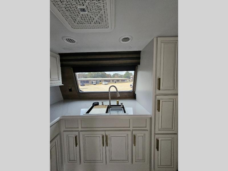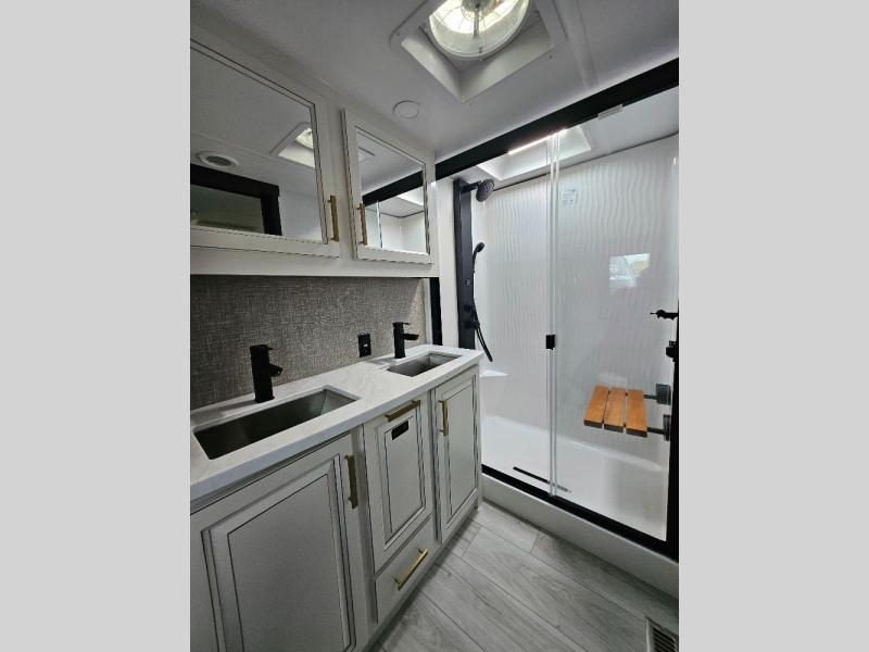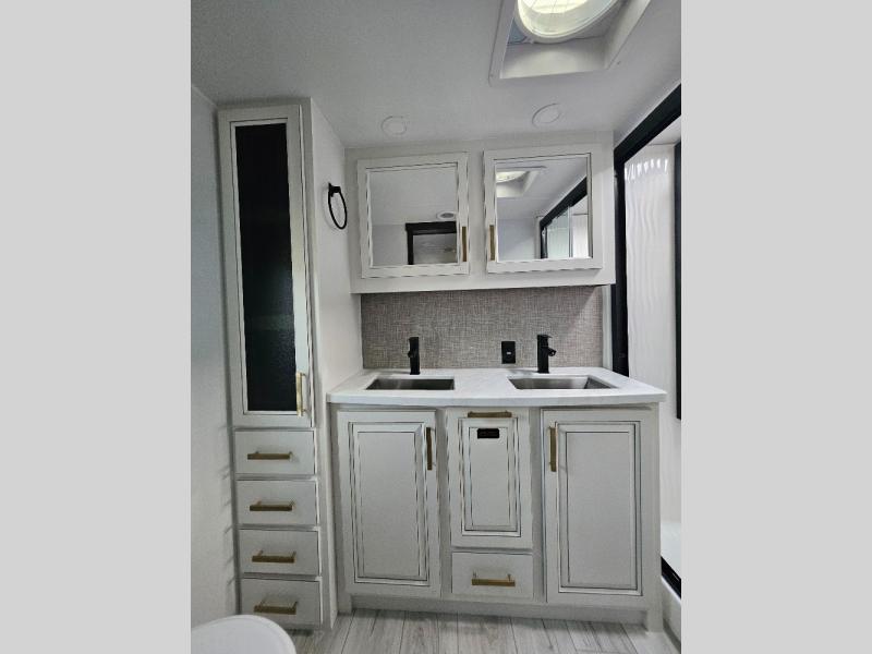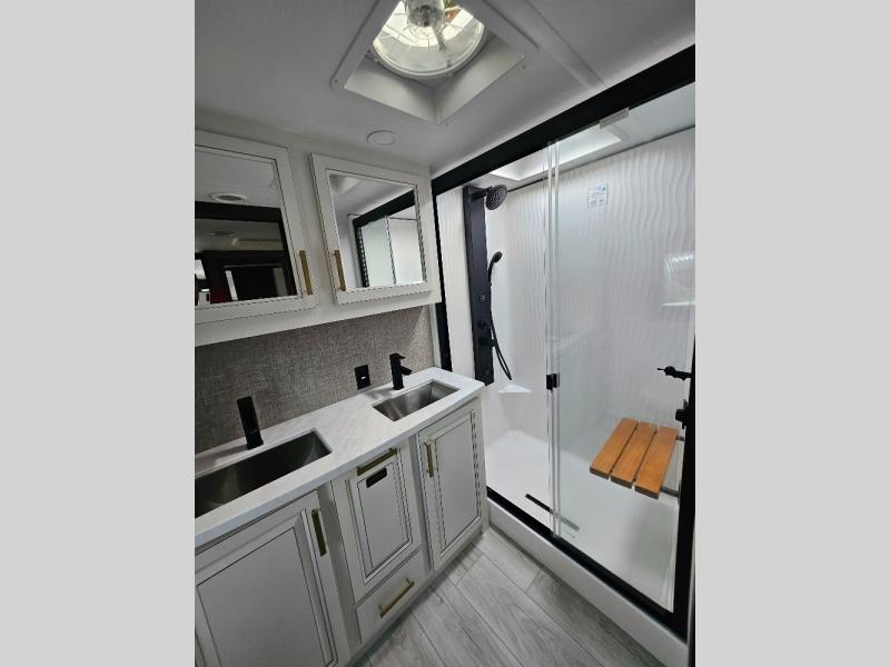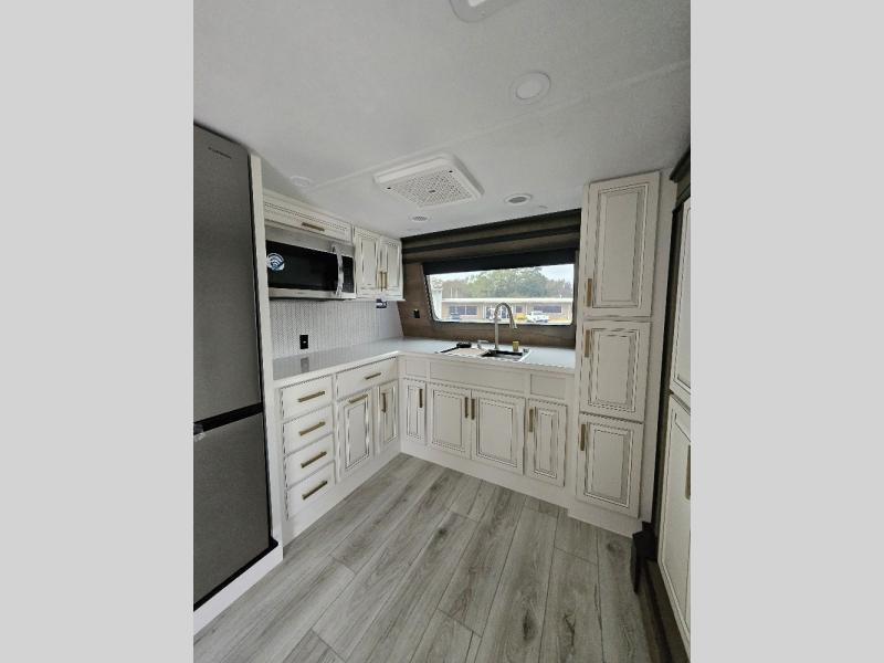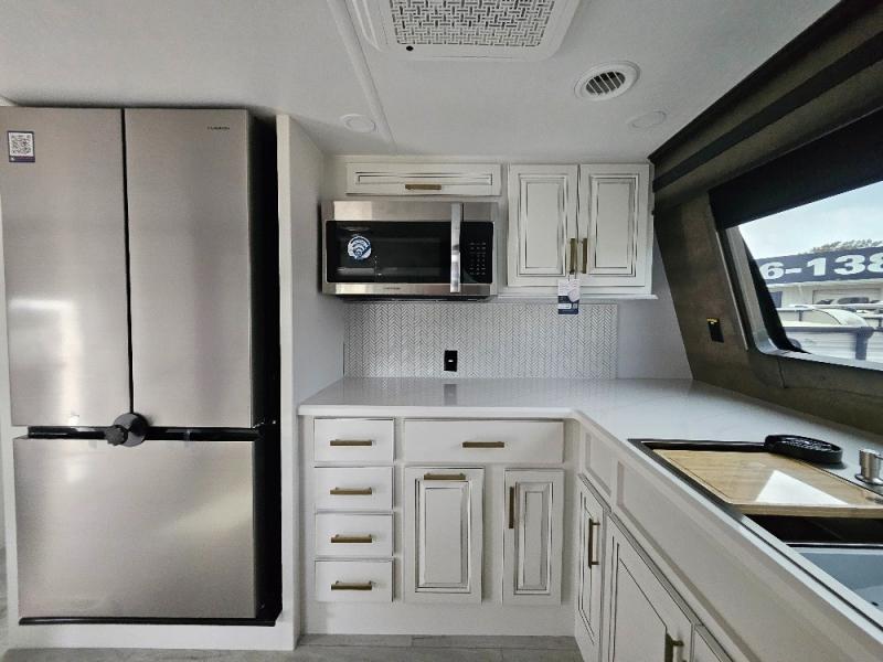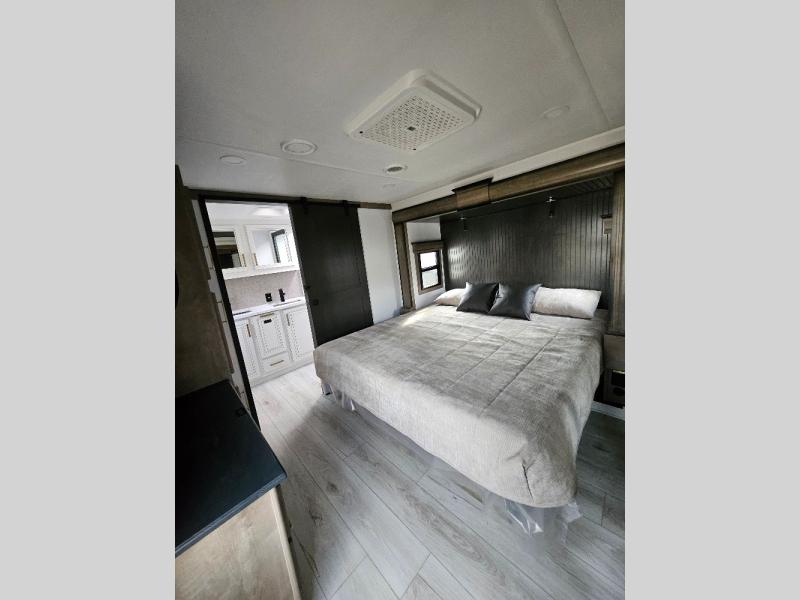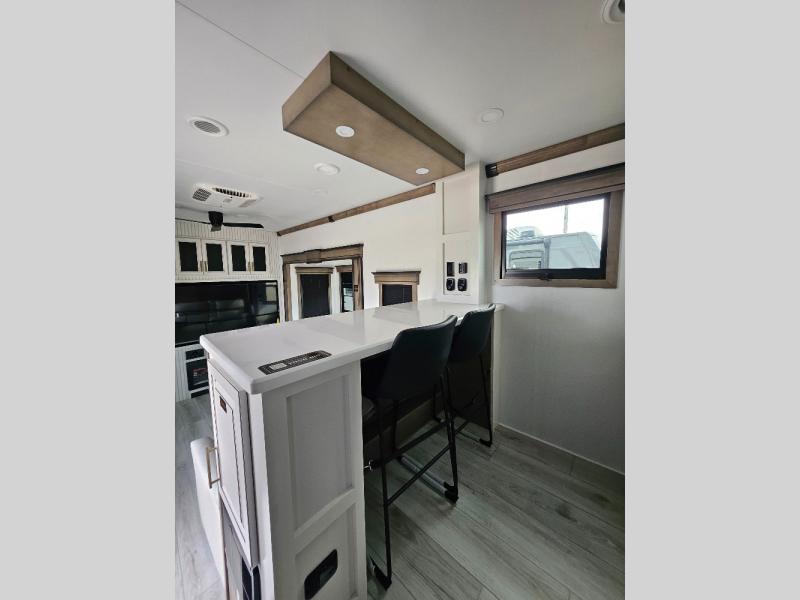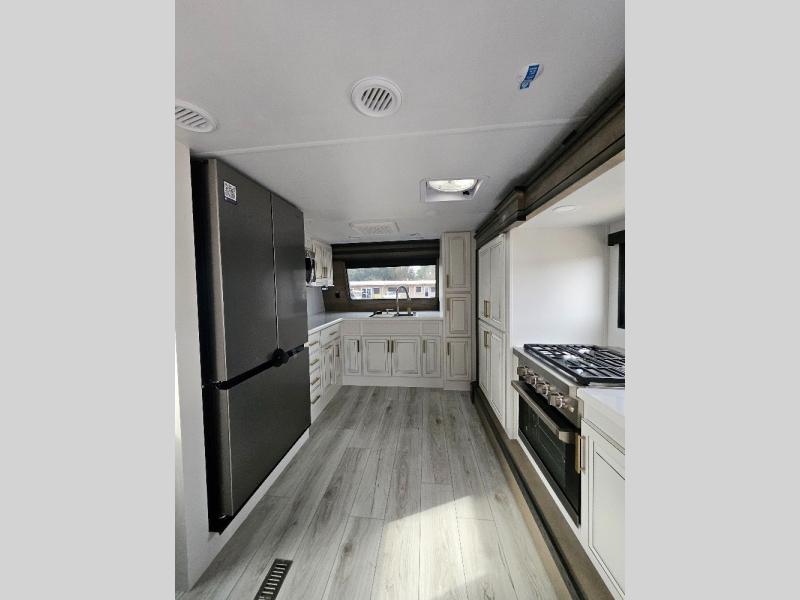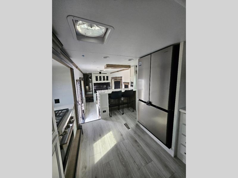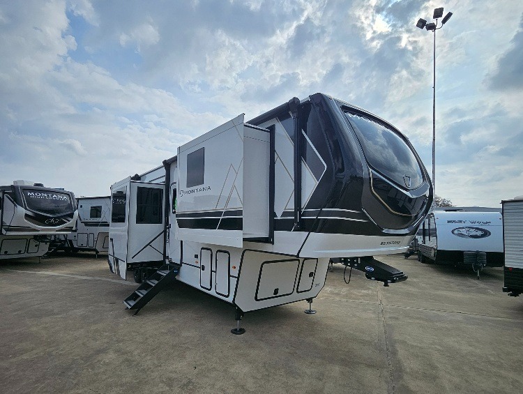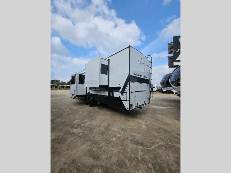 The perfect RV when you like to take "home"' with you when you travel! This Montana fifth wheel gives you the space you want and it feels like home with plenty of features to love and keep you comfortable when you are out enjoying your adventures. Four slides in total give each space plenty of room, the raised front kitchen has everything you need to cook up meals and snacks just like at home. An 18 cu. ft. residential refrigerator with an ice maker, convection microwave oven, and large sink, plus pantry space will make any chef happy. The mid-coach area just inside the door features a living room with dual opposing hide-a-bed slides as well as powered theater seating and a fireplace with Smart TV opposite. Step up to a bedroom with a king bed slide, a dresser, and closet featuring prep for a stackable washer and dryer. A sliding door leads into the rear spacious master bath featuring a 48" x 30" shower, a toilet, linen storage and a vanity with two sinks!