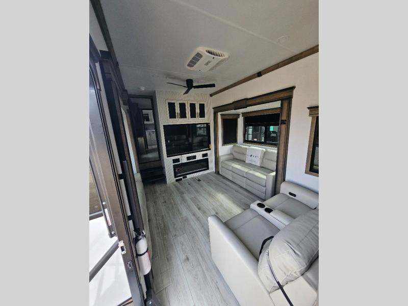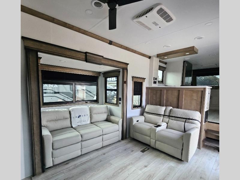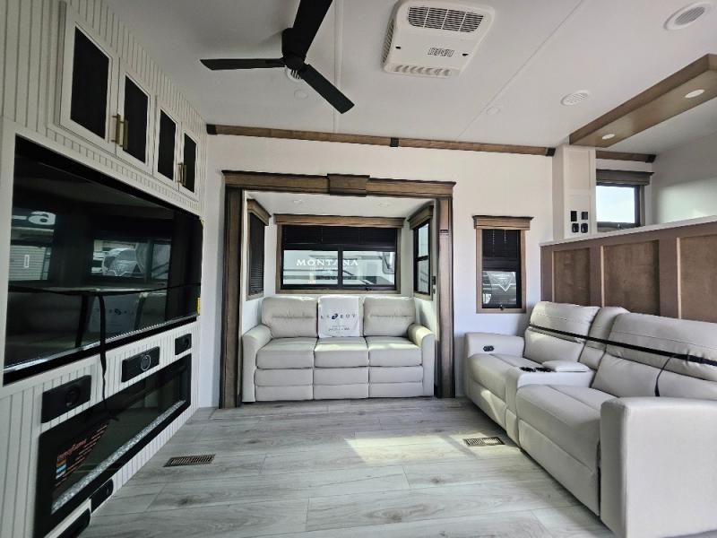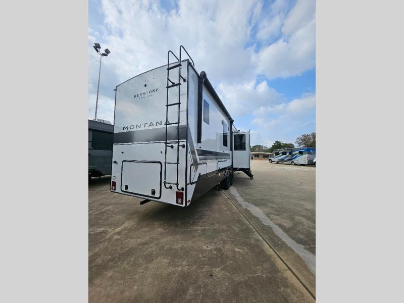 Enjoy luxury, innovation, and the outdoors in any one of Montana's finest fifth wheels. Each set the standard with exceptional features, and exciting factory installed options to provide you a great home on the road. Keystone's 12" I-beam chassis with z-frame technology provides a strong and durable foundation to your fifth wheel, and the four season living package will help extend your camping season. A few other construction features you will appreciate include a MORryde CRE3000 suspension, a fully walkable roof with an alpha seamless TPO membrane system, and 4k square frameless tinted safety glass windows. Each feature stylish interiors with two decor choices paired with beautiful hardwood cabinetry, Beauflor vinyl flooring throughout, central vacuum, plus a La-Z-Boy furniture package for all-around comfort!