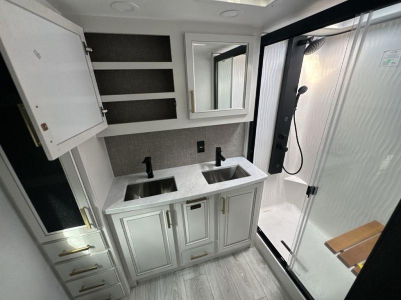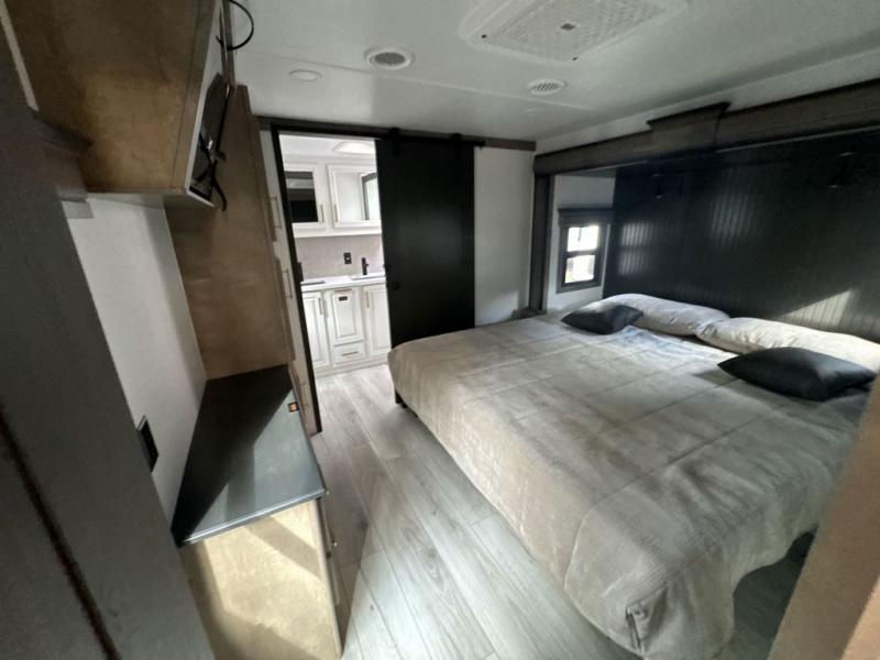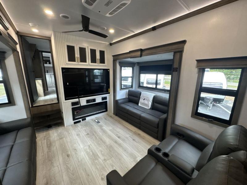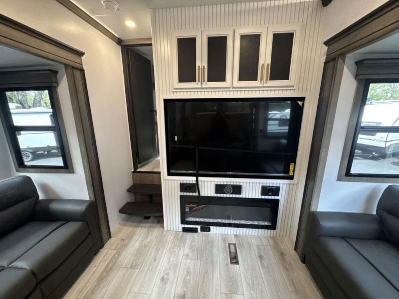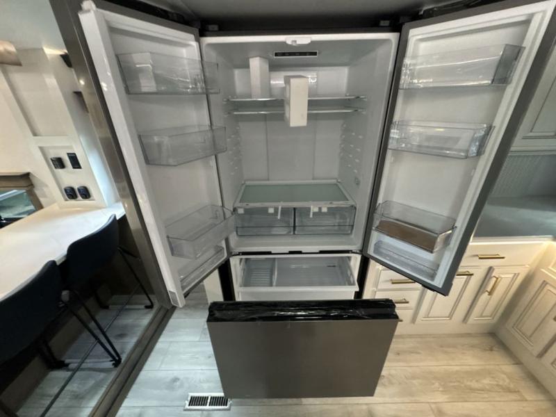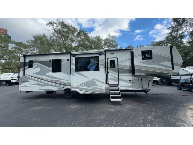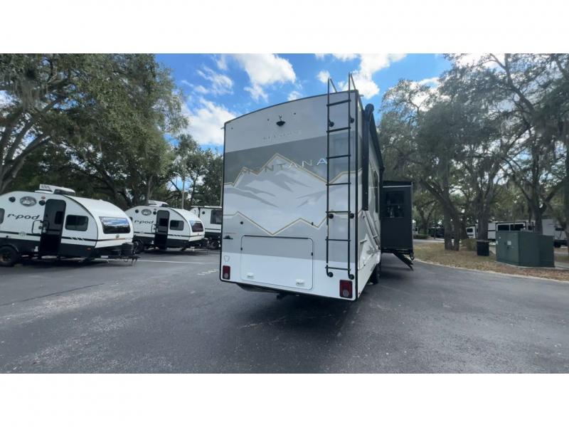 The perfect RV when you like to take "home"' with you when you travel! This Montana fifth wheel gives you the space you want and it feels like home with plenty of features to love and keep you comfortable when you are out enjoying your adventures. Four slides in total give each space plenty of room, the raised front kitchen has everything you need to cook up meals and snacks just like at home. An 18 cu. ft. residential refrigerator with an ice maker, convection microwave oven, and large sink, plus pantry space will make any chef happy. The mid-coach area just inside the door features a living room with dual opposing hide-a-bed slides as well as powered theater seating and a fireplace with Smart TV opposite. Step up to a bedroom with a king bed slide, a dresser, and closet featuring prep for a stackable washer and dryer. A sliding door leads into the rear spacious master bath featuring a 48" x 30" shower, a toilet, linen storage and a vanity with two sinks!