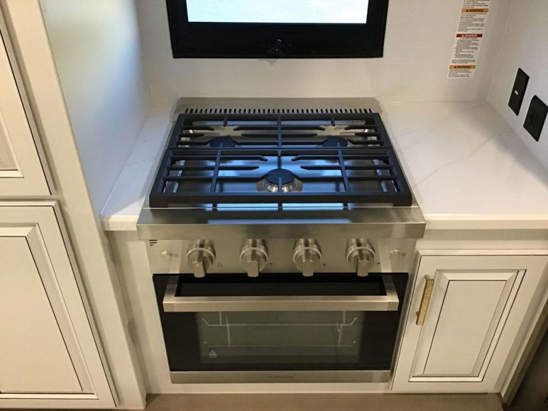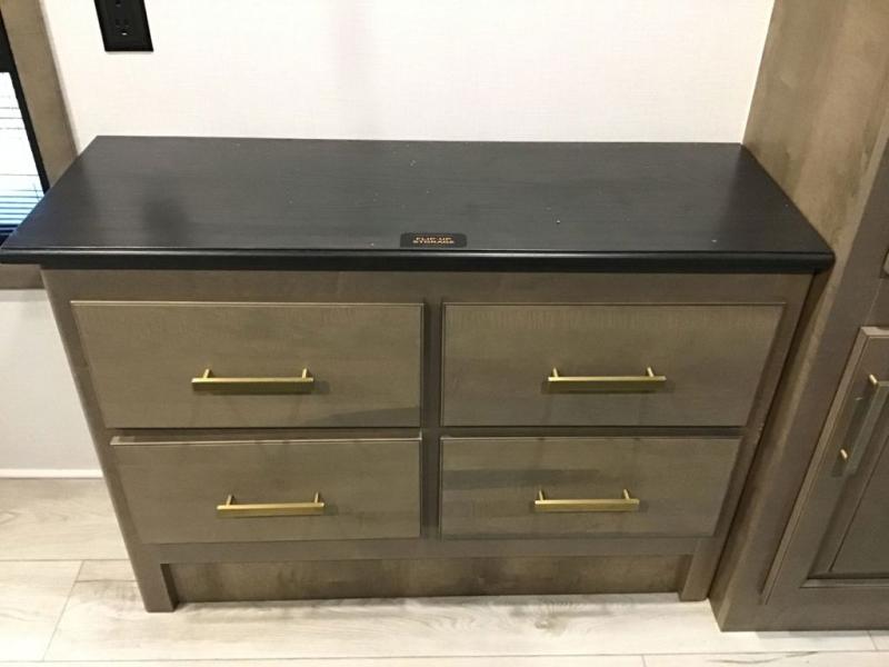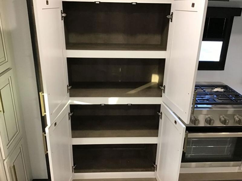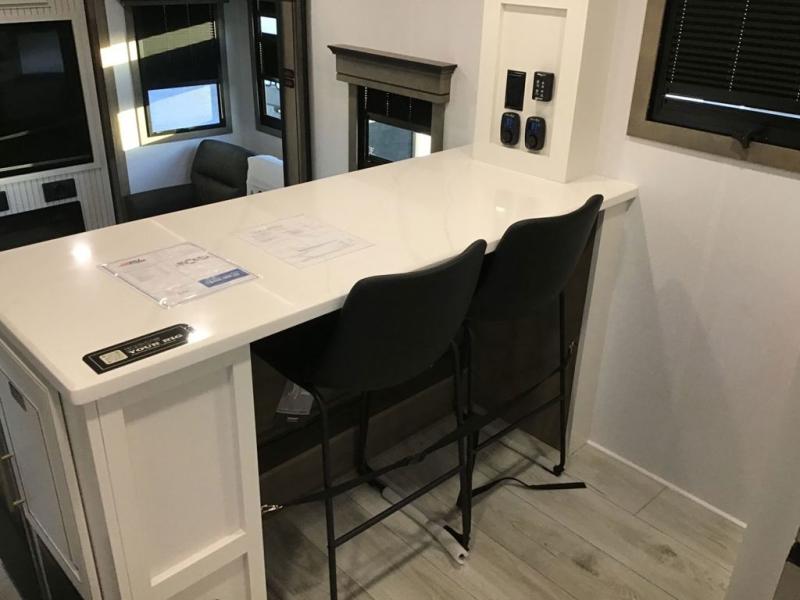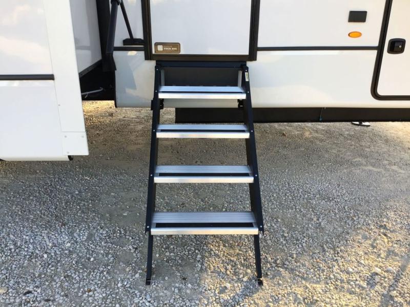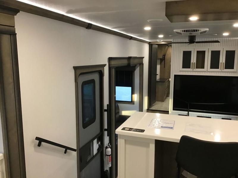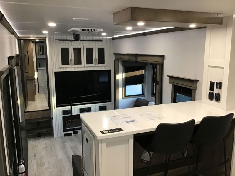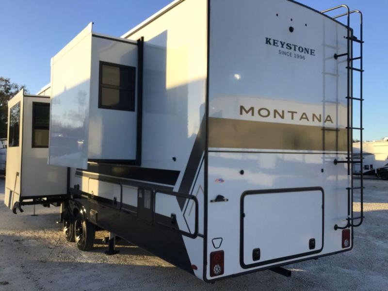 The perfect RV when you like to take "home"' with you when you travel! This Montana fifth wheel gives you the space you want and it feels like home with plenty of features to love and keep you comfortable when you are out enjoying your adventures. Four slides in total give each space plenty of room, the raised front kitchen has everything you need to cook up meals and snacks just like at home. An 18 cu. ft. residential refrigerator with an ice maker, convection microwave oven, and large sink, plus pantry space will make any chef happy. The mid-coach area just inside the door features a living room with dual opposing hide-a-bed slides as well as powered theater seating and a fireplace with Smart TV opposite. Step up to a bedroom with a king bed slide, a dresser, and closet featuring prep for a stackable washer and dryer. A sliding door leads into the rear spacious master bath featuring a 48" x 30" shower, a toilet, linen storage and a vanity with two sinks!