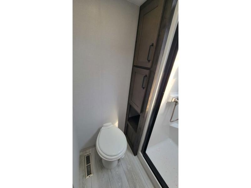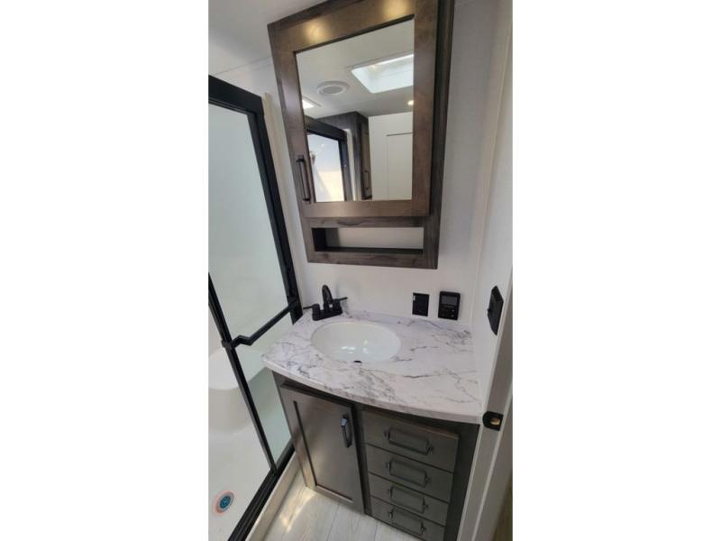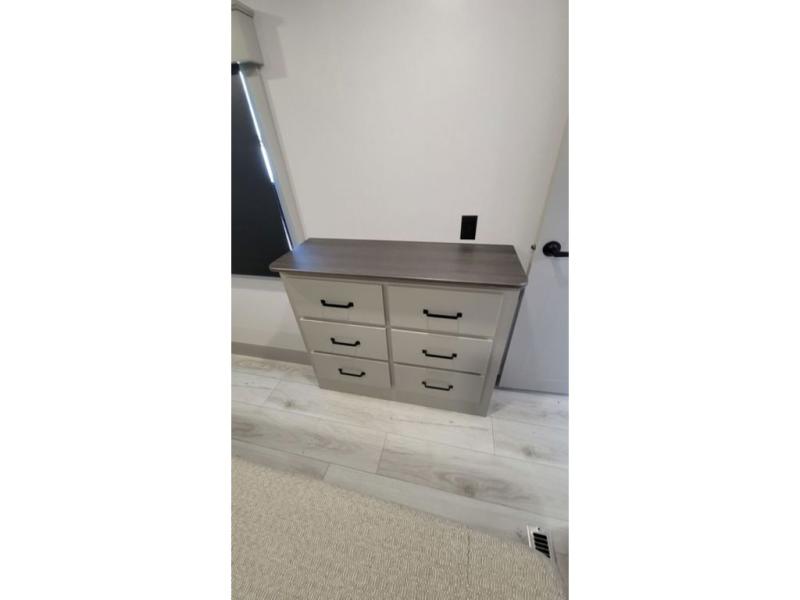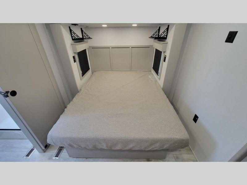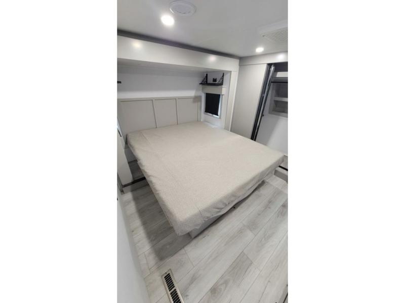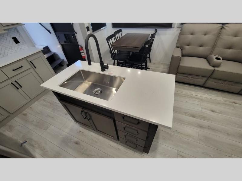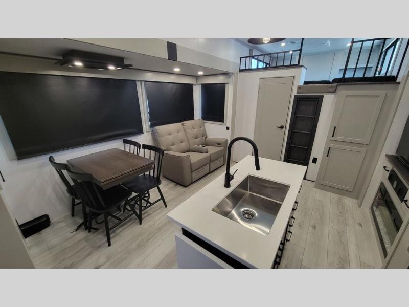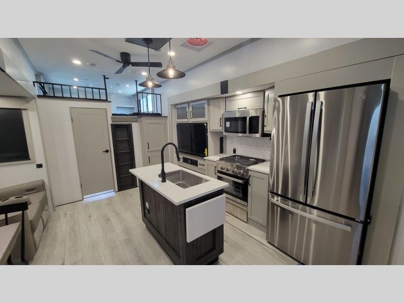 Two full bathrooms and two private bedrooms make this fifth wheel perfect for camping with friends and family. The front bedroom includes a king bed with a queen bed option, a large front wardrobe, plus stackable washer and dryer prep. The rear master bedroom has two closets plus a dresser and underbed storage, plus its own full bath with an exterior entry door for convenience. There is even a loft above the rear bedroom for even more sleeping space! Everyone can meet in the main living area/kitchen to relax on the power theater seat as the chef cooks dinner, and you can watch a show on the Smart HDTV to pass the time. The kitchen island will provide more counter space, along with the hutch that includes overhead cabinets as well. Don't let this luxury fifth wheel slip away!