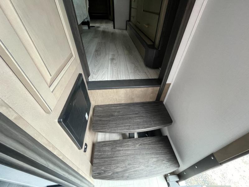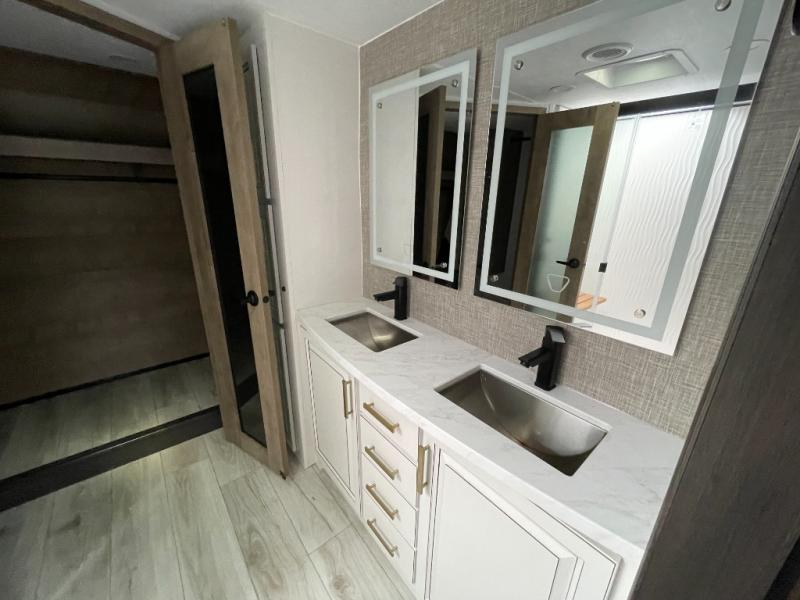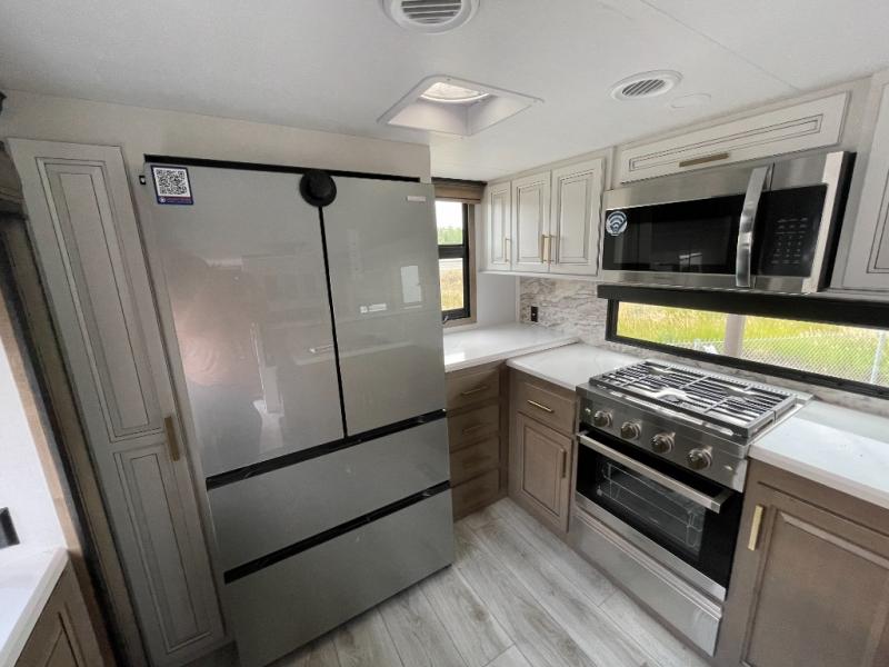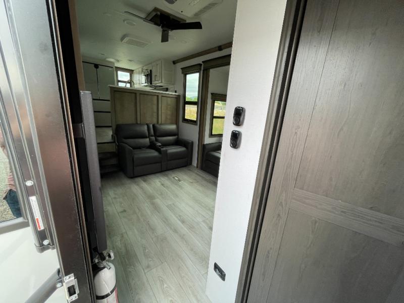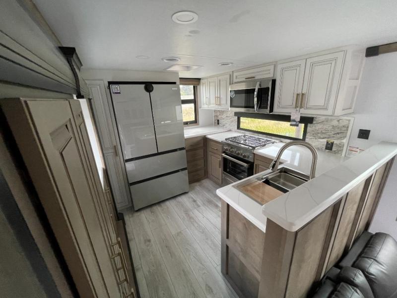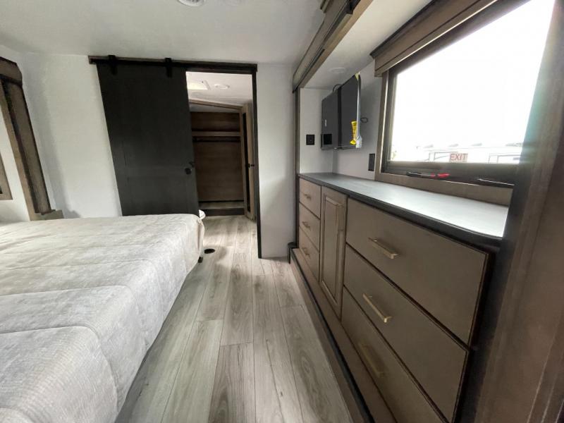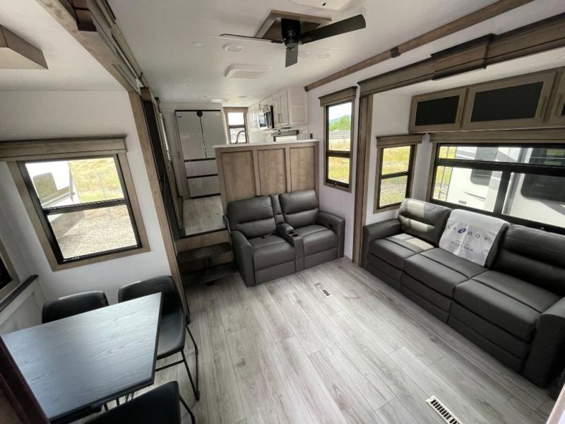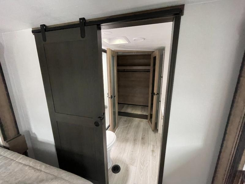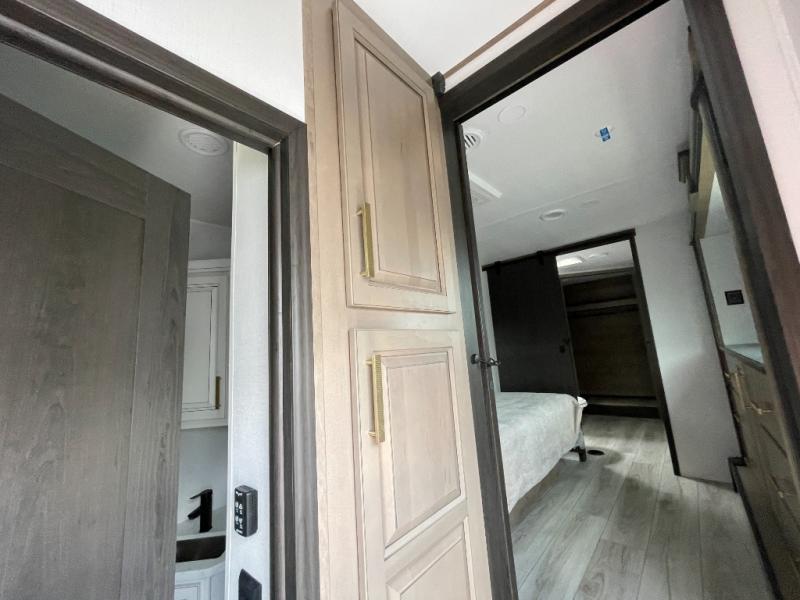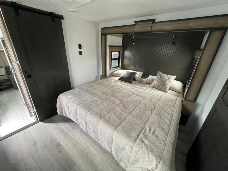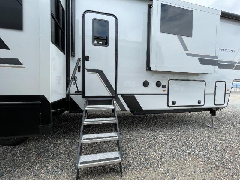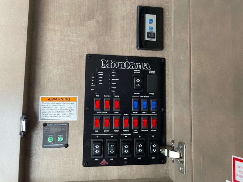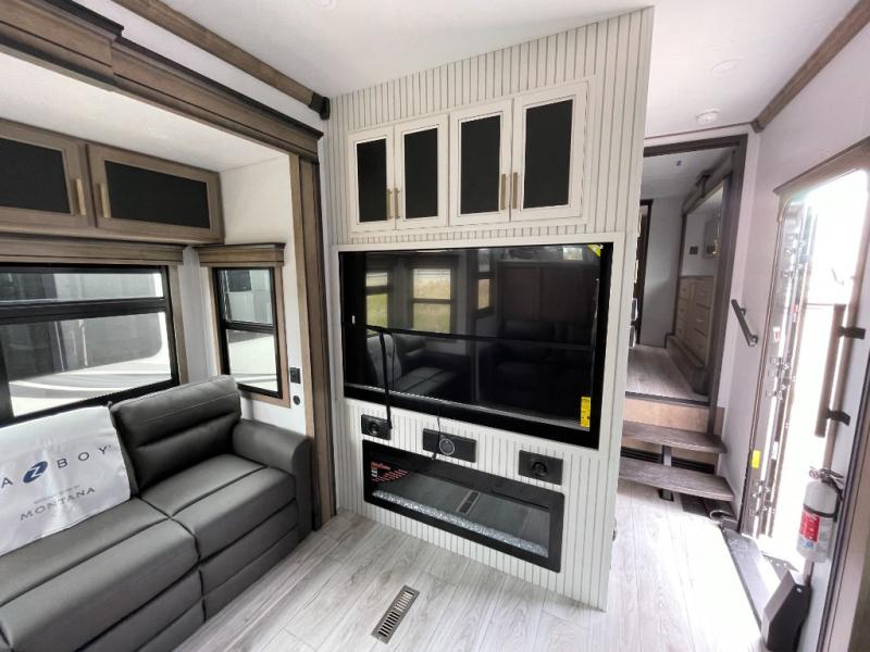 The perfect RV when you like to take "home"' with you when you travel! This Montana fifth wheel gives you the space you want and it feels like home with plenty of features to love and keep you comfortable when you are out enjoying your adventures. Five slides in total give each space plenty of room, the raised rear kitchen has everything you need to cook up meals and snacks just like at home. An 18 cu. ft. residential refrigerator with an ice maker, convection microwave oven and large sink, plus pantry space will make any chef happy. The mid-coach space just inside the door features a living room and half bath for convenience. There is also a dinette with storage within the roadside slide. Step up in front through a sliding barn door to a double slide space with a king bed and dresser. A second sliding barn door leads into the front spacious master bath featuring dual sinks, a 48" x 30" shower, and a large walk-in wardrobe with washer and dryer prep!