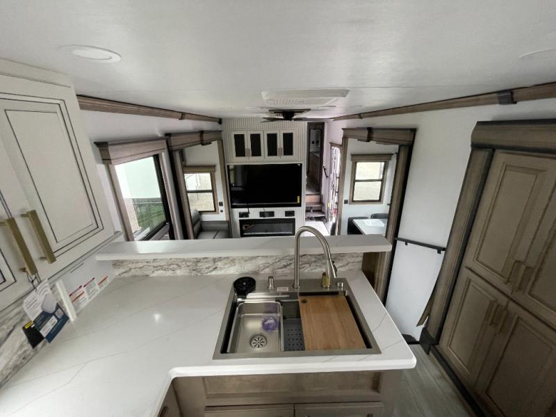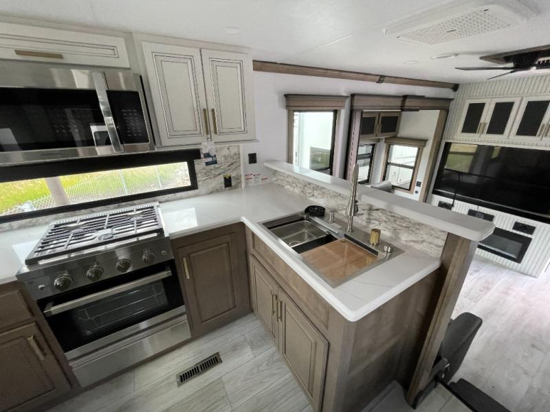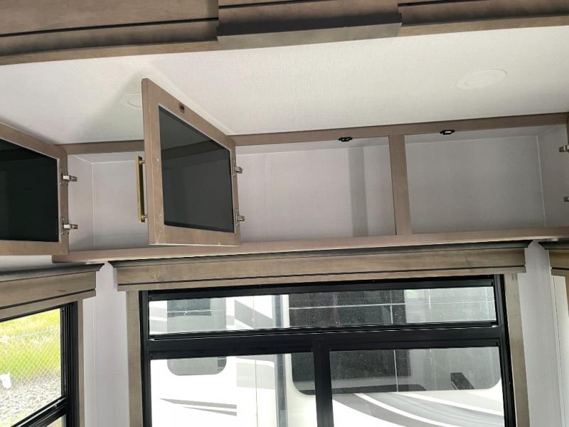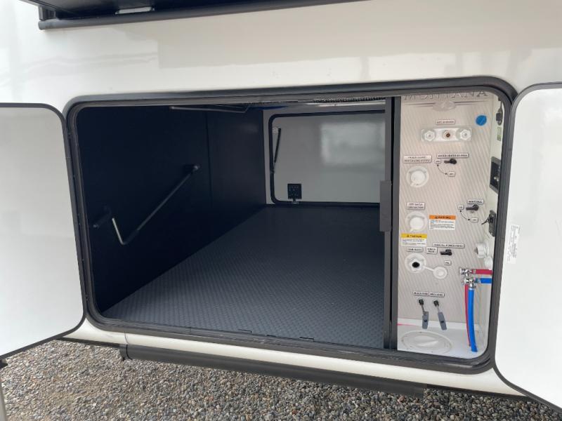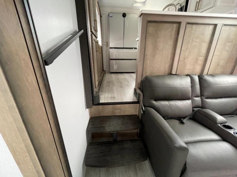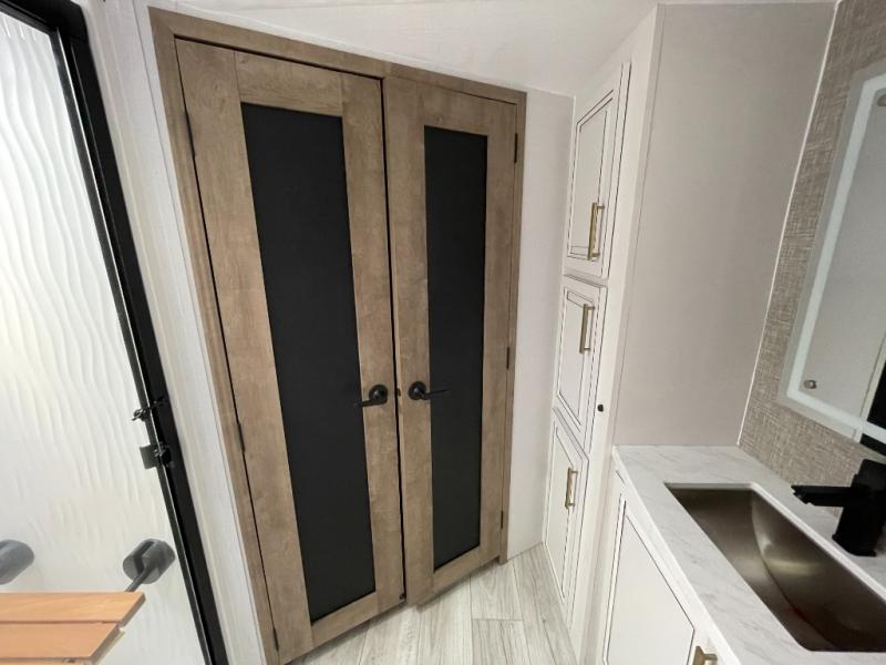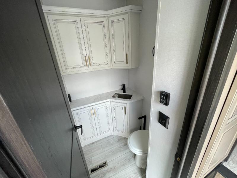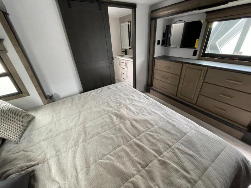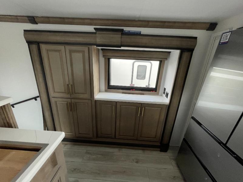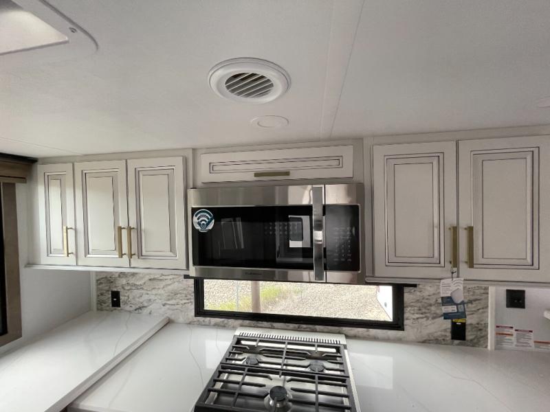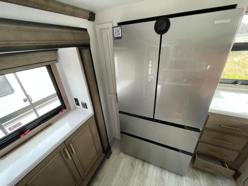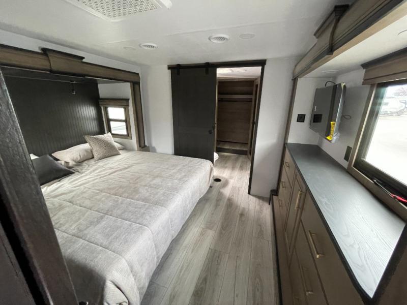 The perfect RV when you like to take "home"' with you when you travel! This Montana fifth wheel gives you the space you want and it feels like home with plenty of features to love and keep you comfortable when you are out enjoying your adventures. Five slides in total give each space plenty of room, the raised rear kitchen has everything you need to cook up meals and snacks just like at home. An 18 cu. ft. residential refrigerator with an ice maker, convection microwave oven and large sink, plus pantry space will make any chef happy. The mid-coach space just inside the door features a living room and half bath for convenience. There is also a dinette with storage within the roadside slide. Step up in front through a sliding barn door to a double slide space with a king bed and dresser. A second sliding barn door leads into the front spacious master bath featuring dual sinks, a 48" x 30" shower, and a large walk-in wardrobe with washer and dryer prep!