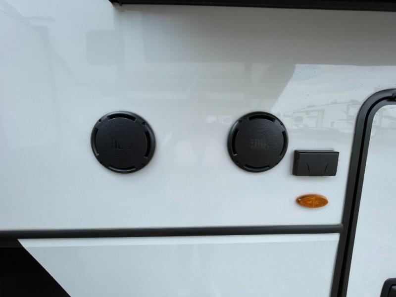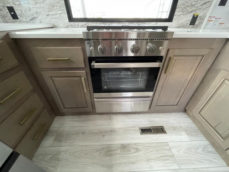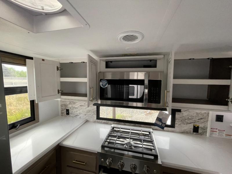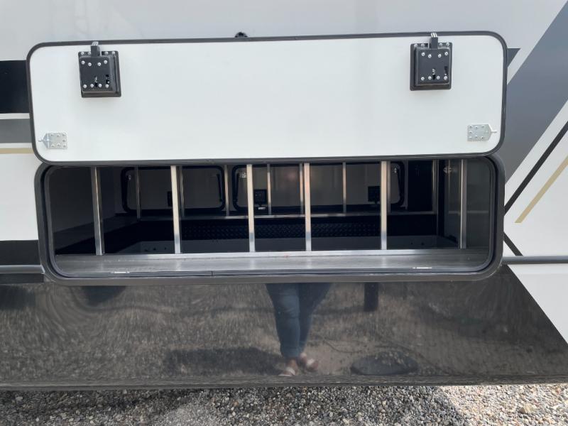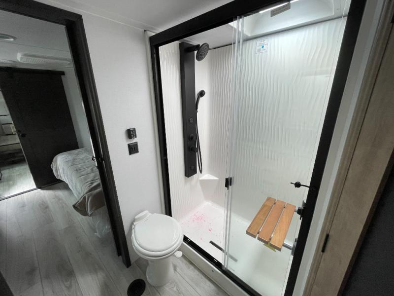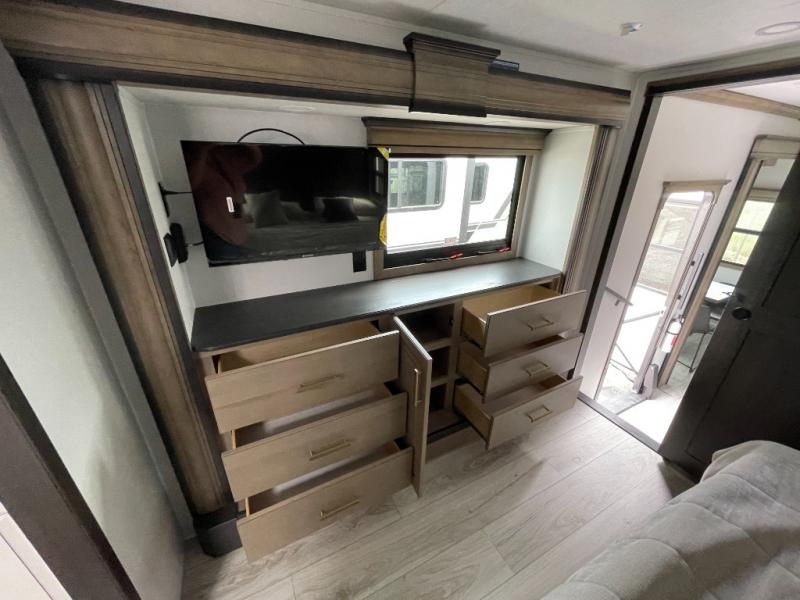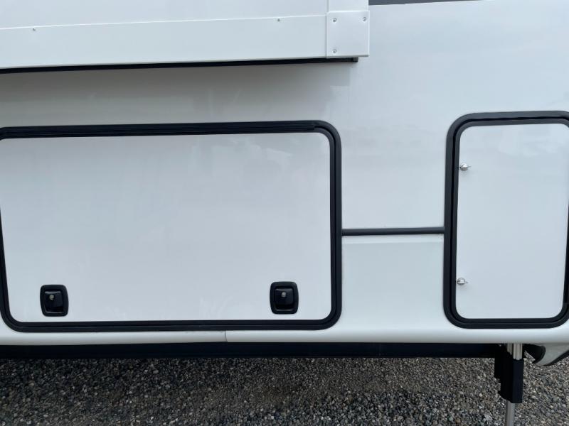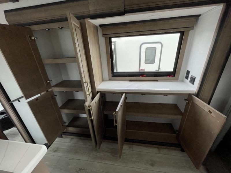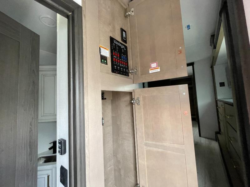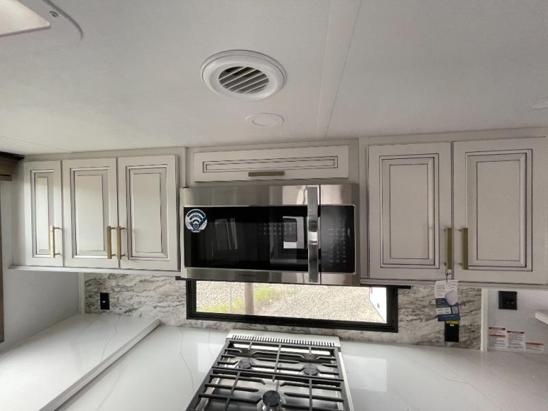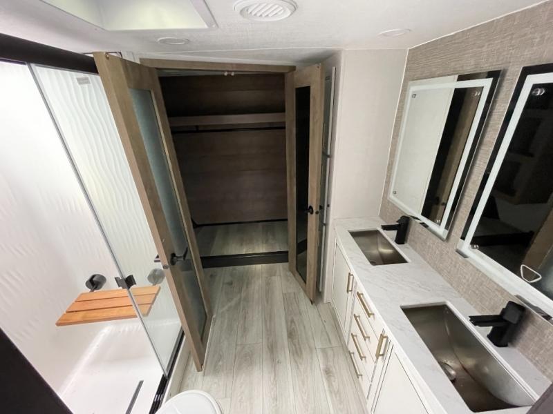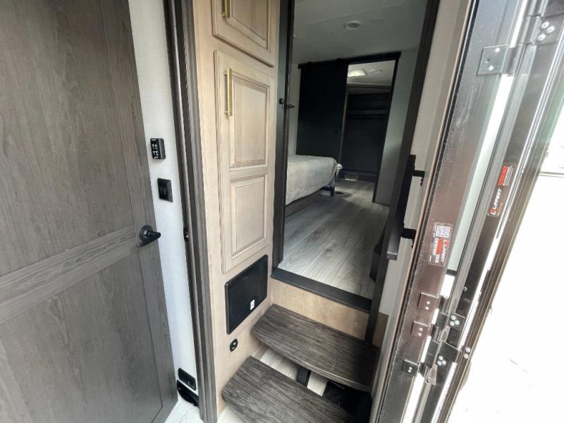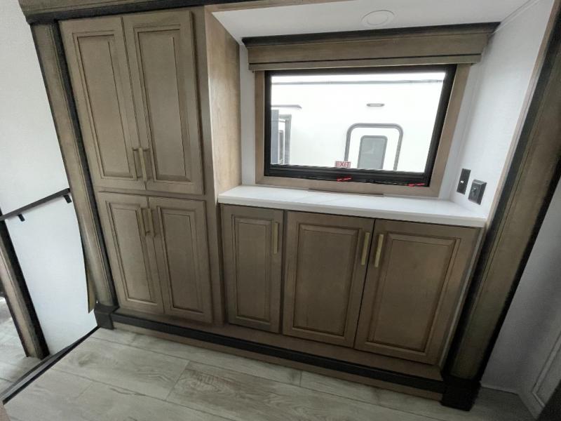 The perfect RV when you like to take "home"' with you when you travel! This Montana fifth wheel gives you the space you want and it feels like home with plenty of features to love and keep you comfortable when you are out enjoying your adventures. Five slides in total give each space plenty of room, the raised rear kitchen has everything you need to cook up meals and snacks just like at home. An 18 cu. ft. residential refrigerator with an ice maker, convection microwave oven and large sink, plus pantry space will make any chef happy. The mid-coach space just inside the door features a living room and half bath for convenience. There is also a dinette with storage within the roadside slide. Step up in front through a sliding barn door to a double slide space with a king bed and dresser. A second sliding barn door leads into the front spacious master bath featuring dual sinks, a 48" x 30" shower, and a large walk-in wardrobe with washer and dryer prep!