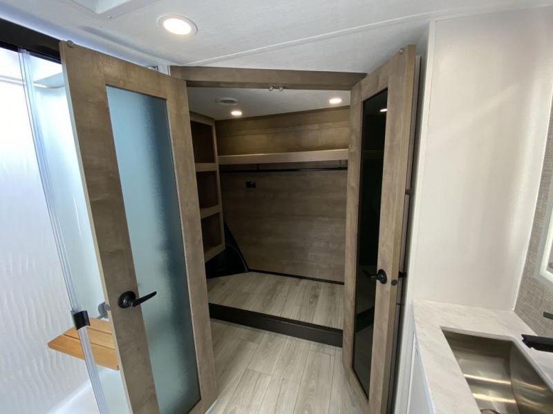 The perfect RV when you like to take "home"' with you when you travel! This Montana fifth wheel gives you the space you want and it feels like home with plenty of features to love and keep you comfortable when you are out enjoying your adventures. Five slides in total give each space plenty of room, the raised rear kitchen has everything you need to cook up meals and snacks just like at home. An 18 cu. ft. residential refrigerator with an ice maker, convection microwave oven and large sink, plus pantry space will make any chef happy. The mid-coach space just inside the door features a living room and half bath for convenience. There is also a pivot dinette within the roadside slide. Step up in front through a sliding barn door to a double slide space with a king bed and dresser. A second sliding door leads into the front spacious master bath featuring dual sinks, a 48" x 30" shower, and a large walk-in wardrobe with washer and dryer prep!
