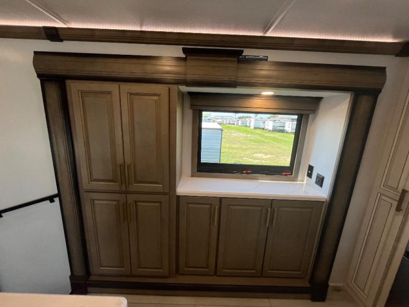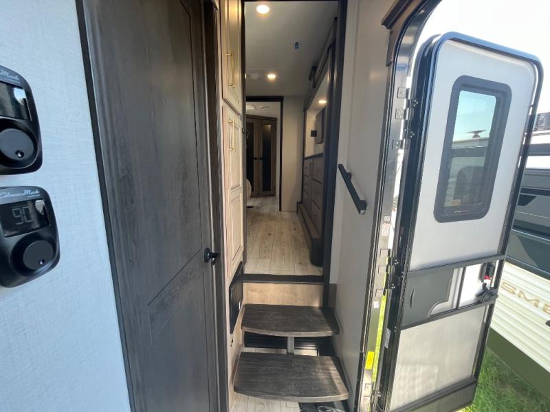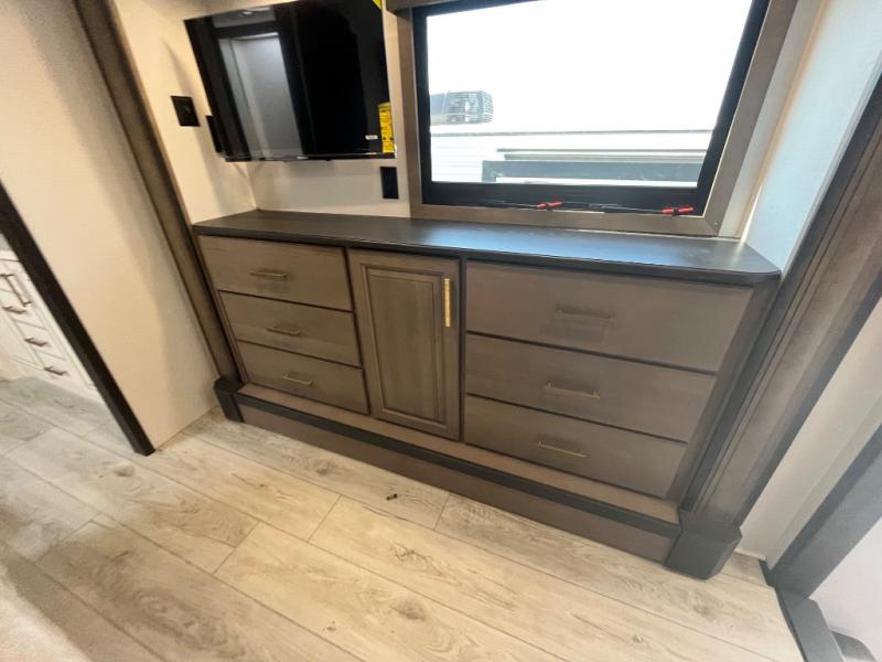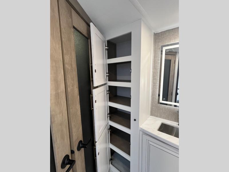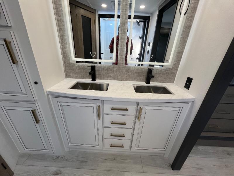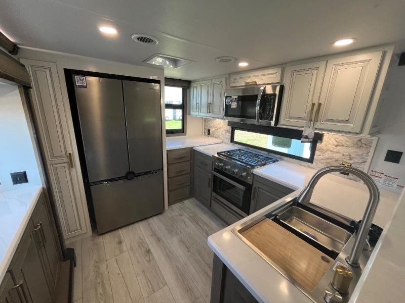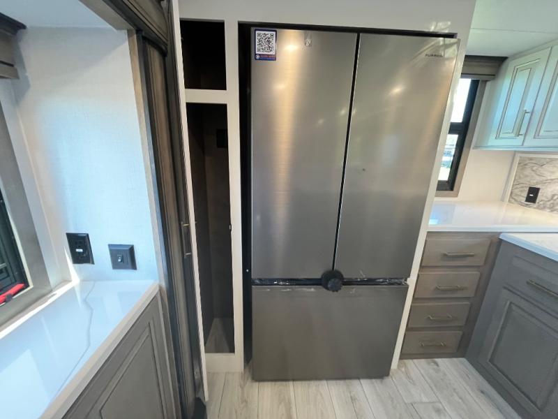 The perfect RV when you like to take "home"' with you when you travel! This Montana fifth wheel gives you the space you want and it feels like home with plenty of features to love and keep you comfortable when you are out enjoying your adventures. Five slides in total give each space plenty of room, the raised rear kitchen has everything you need to cook up meals and snacks just like at home. An 18 cu. ft. residential refrigerator with an ice maker, convection microwave oven and large sink, plus pantry space will make any chef happy. The mid-coach space just inside the door features a living room and half bath for convenience. There is also a pivot dinette within the roadside slide. Step up in front through a sliding barn door to a double slide space with a king bed and dresser. A second sliding door leads into the front spacious master bath featuring dual sinks, a 48" x 30" shower, and a large walk-in wardrobe with washer and dryer prep!