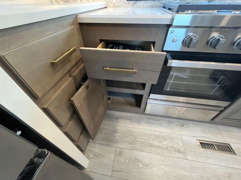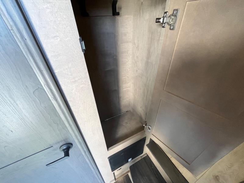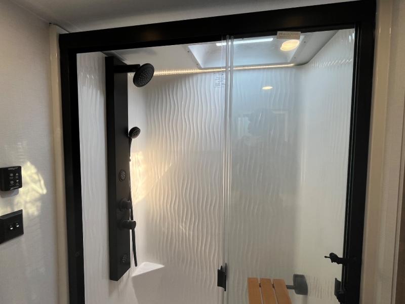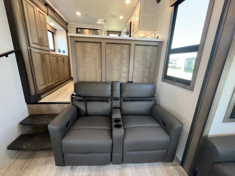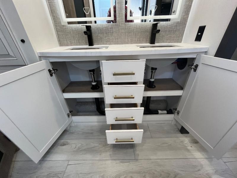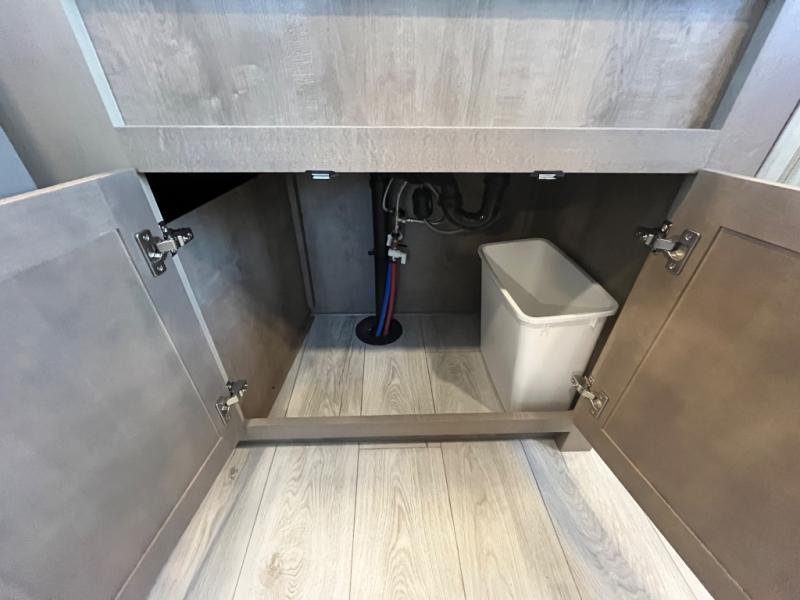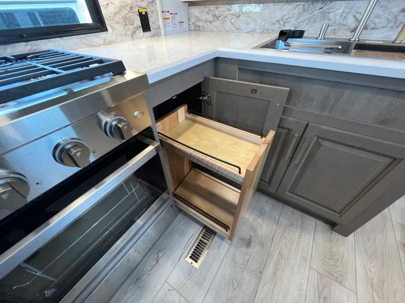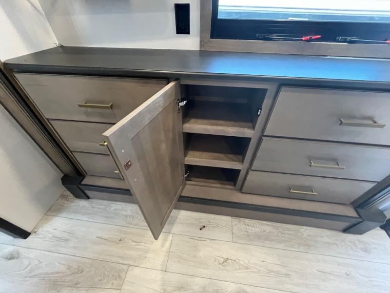 The perfect RV when you like to take "home"' with you when you travel! This Montana fifth wheel gives you the space you want and it feels like home with plenty of features to love and keep you comfortable when you are out enjoying your adventures. Five slides in total give each space plenty of room, the raised rear kitchen has everything you need to cook up meals and snacks just like at home. An 18 cu. ft. residential refrigerator with an ice maker, convection microwave oven and large sink, plus pantry space will make any chef happy. The mid-coach space just inside the door features a living room and half bath for convenience. There is also a pivot dinette within the roadside slide. Step up in front through a sliding barn door to a double slide space with a king bed and dresser. A second sliding door leads into the front spacious master bath featuring dual sinks, a 48" x 30" shower, and a large walk-in wardrobe with washer and dryer prep!