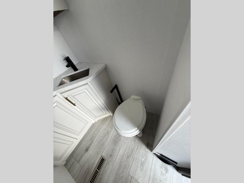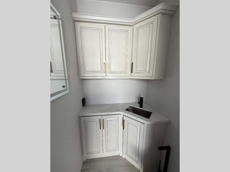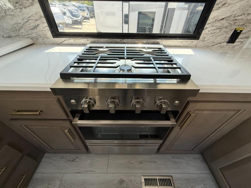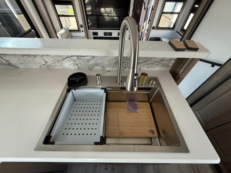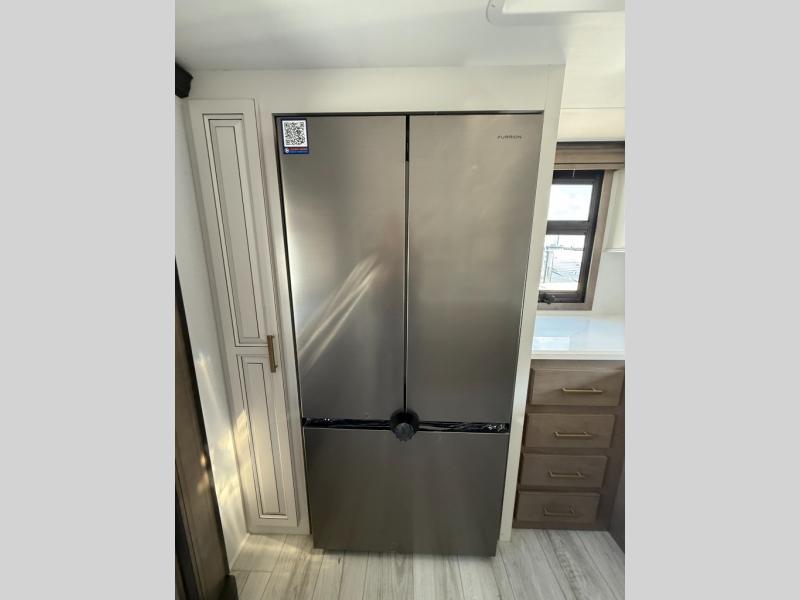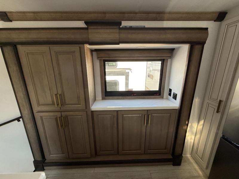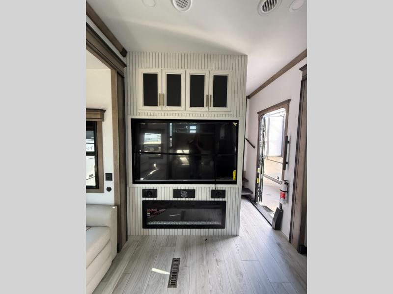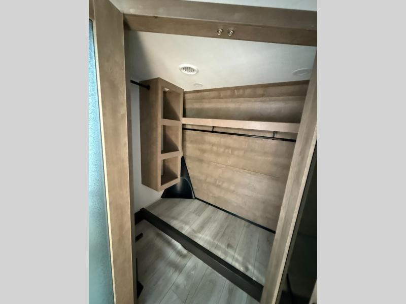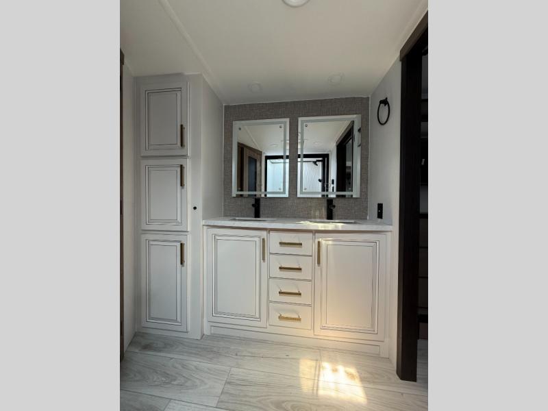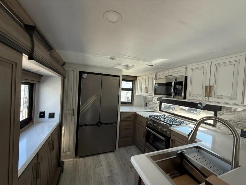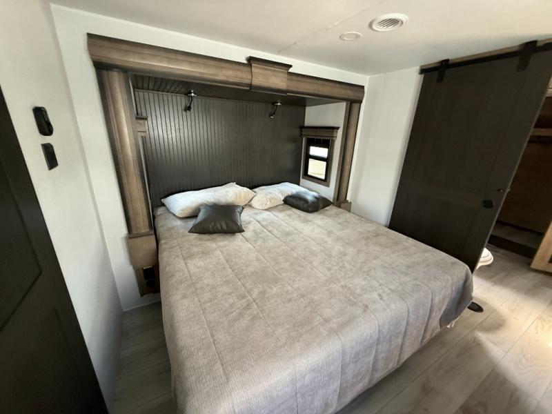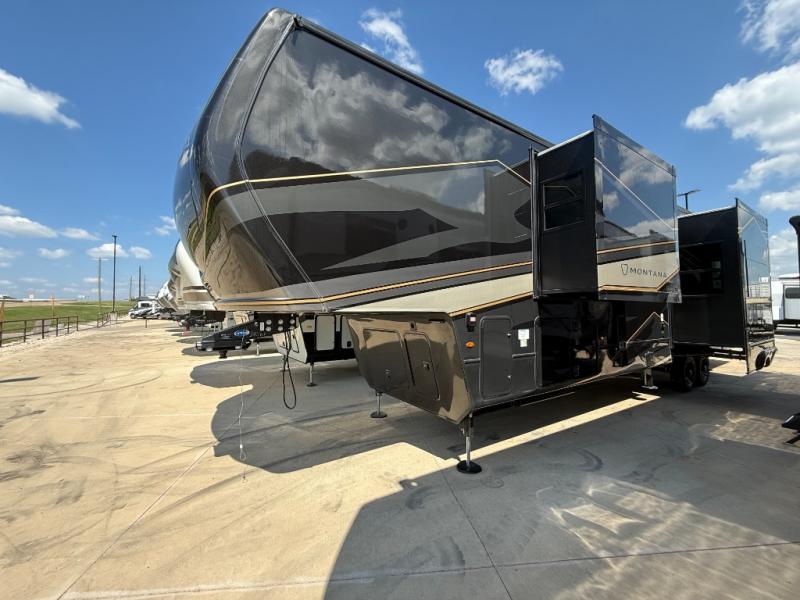 The perfect RV when you like to take "home"' with you when you travel! This Montana fifth wheel gives you the space you want and it feels like home with plenty of features to love and keep you comfortable when you are out enjoying your adventures. Five slides in total give each space plenty of room, the raised rear kitchen has everything you need to cook up meals and snacks just like at home. An 18 cu. ft. residential refrigerator with an ice maker, convection microwave oven and large sink, plus pantry space will make any chef happy. The mid-coach space just inside the door features a living room and half bath for convenience. There is also a pivot dinette within the roadside slide. Step up in front through a sliding barn door to a double slide space with a king bed and dresser. A second sliding door leads into the front spacious master bath featuring dual sinks, a 48" x 30" shower, and a large walk-in wardrobe with washer and dryer prep!