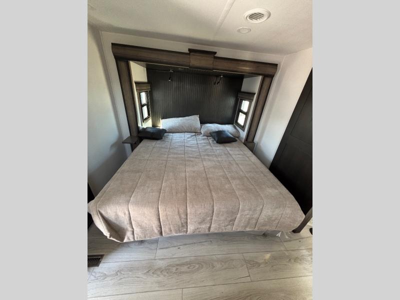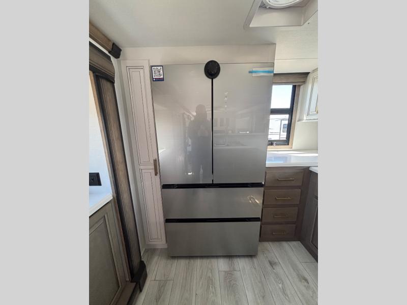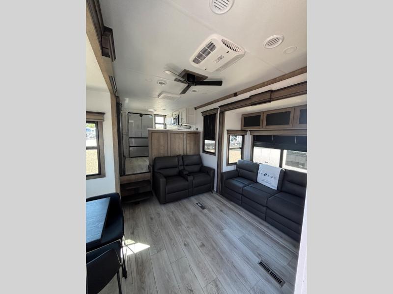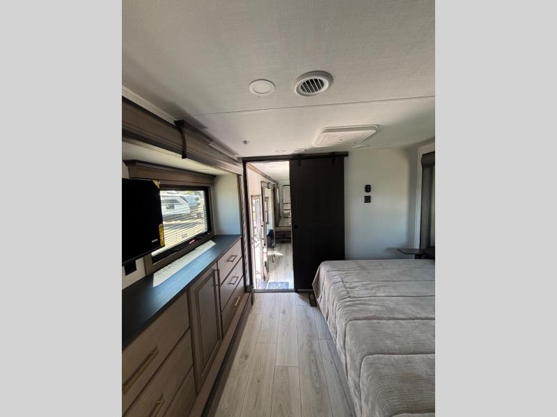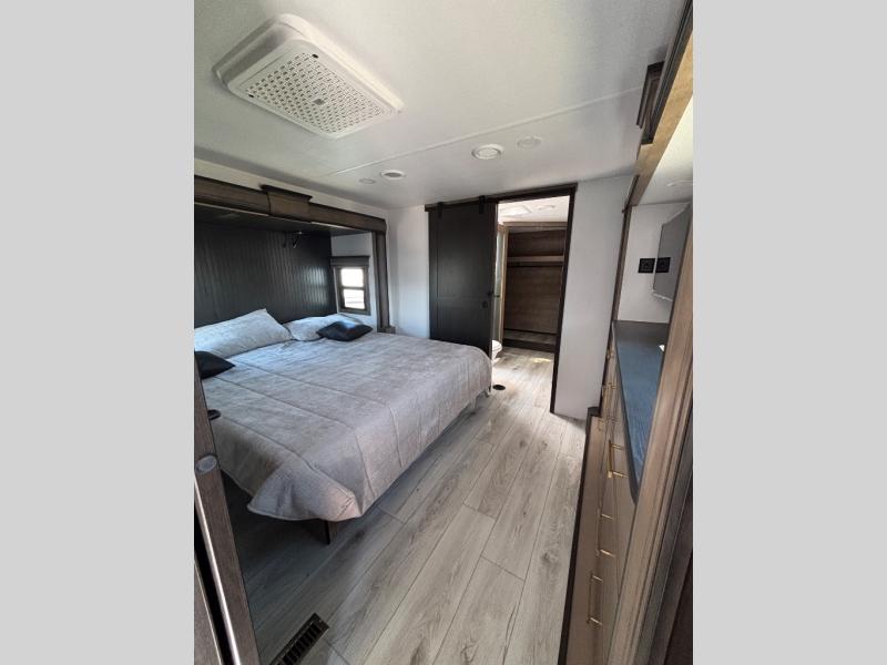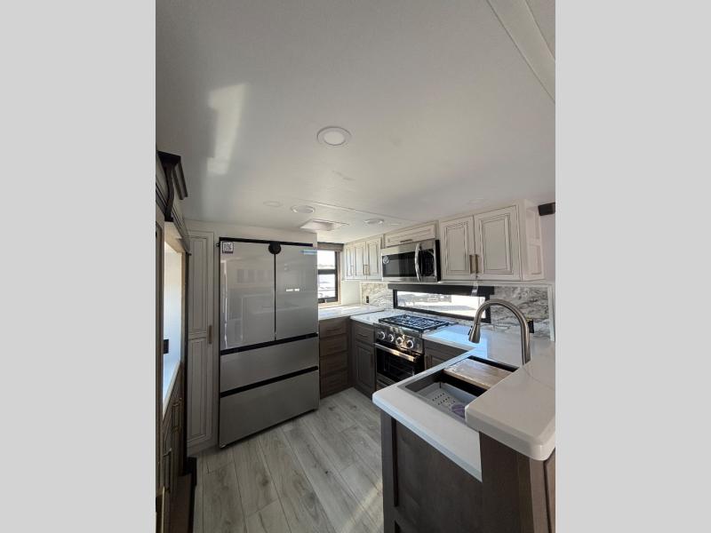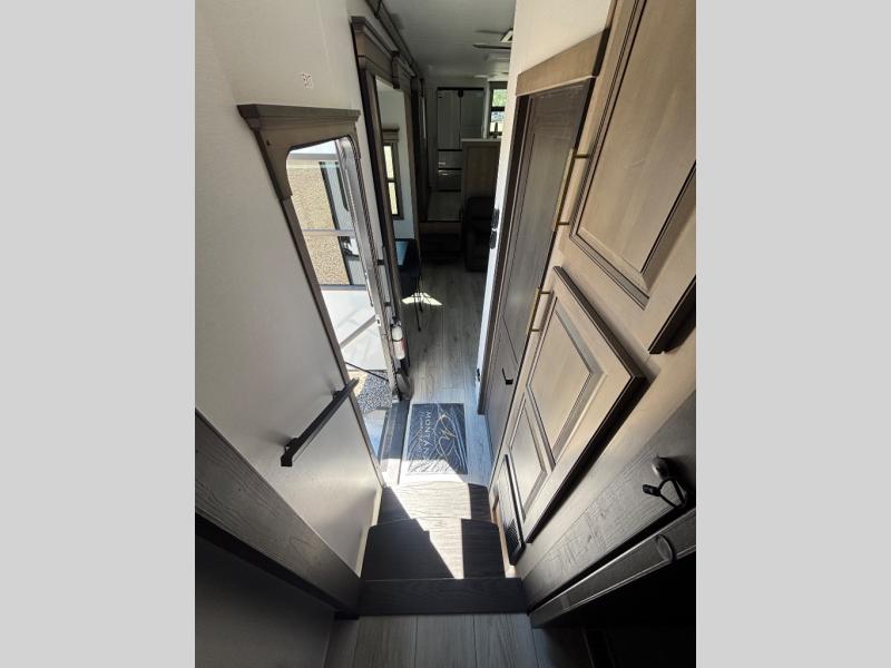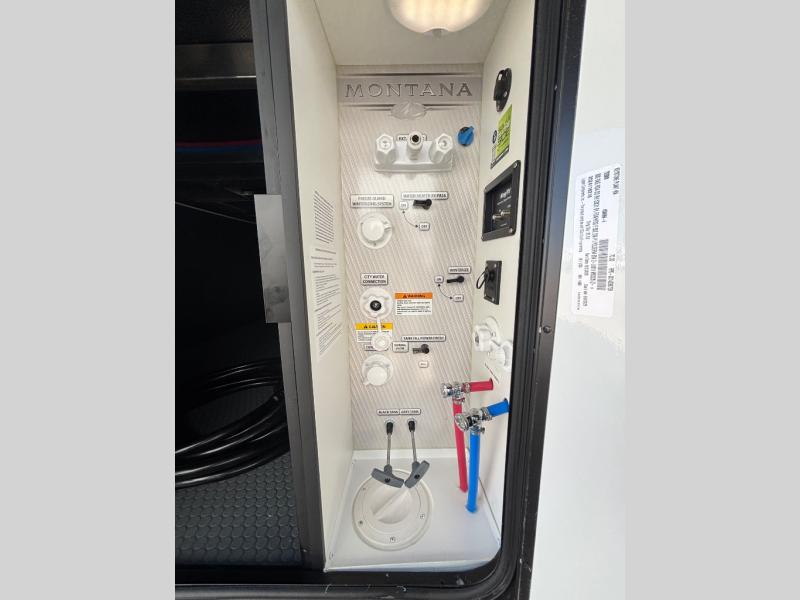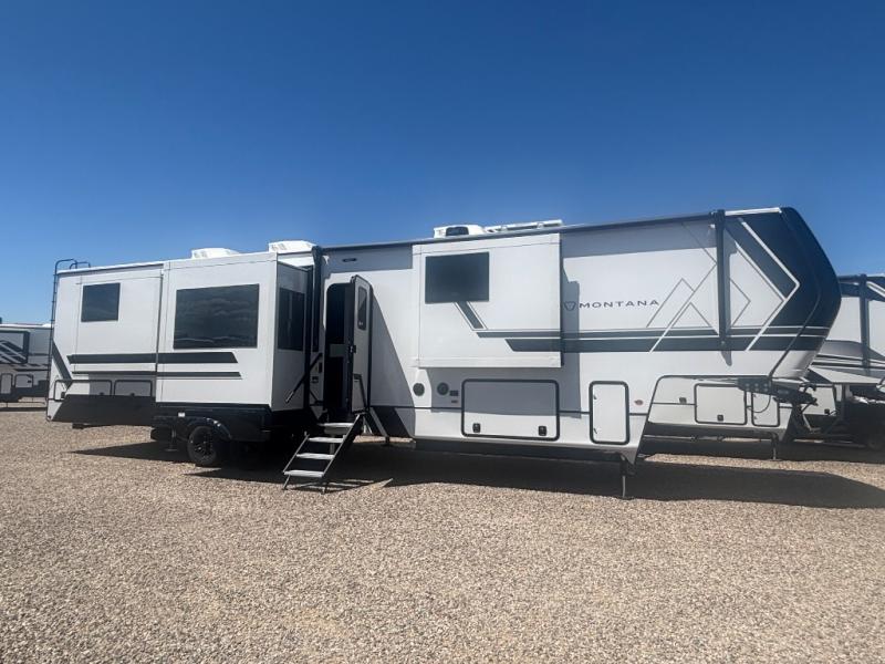 The perfect RV when you like to take "home"' with you when you travel! This Montana fifth wheel gives you the space you want and it feels like home with plenty of features to love and keep you comfortable when you are out enjoying your adventures. Five slides in total give each space plenty of room, the raised rear kitchen has everything you need to cook up meals and snacks just like at home. An 18 cu. ft. residential refrigerator with an ice maker, convection microwave oven and large sink, plus pantry space will make any chef happy. The mid-coach space just inside the door features a living room and half bath for convenience. There is also a pivot dinette within the roadside slide. Step up in front through a sliding barn door to a double slide space with a king bed and dresser. A second sliding door leads into the front spacious master bath featuring dual sinks, a 48" x 30" shower, and a large walk-in wardrobe with washer and dryer prep!