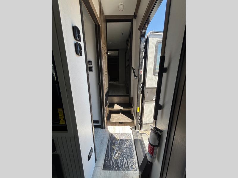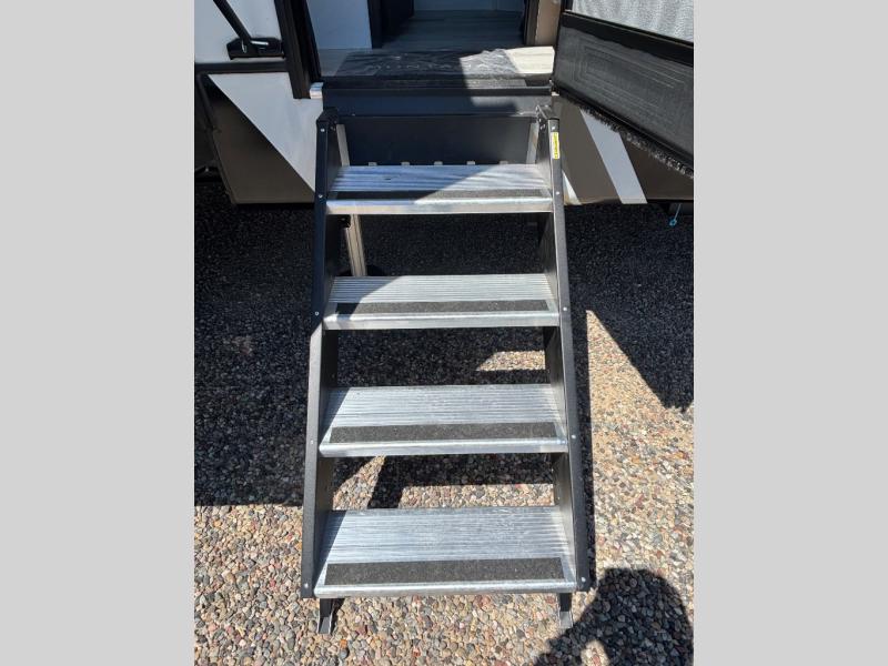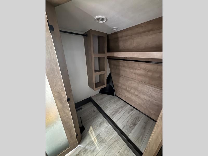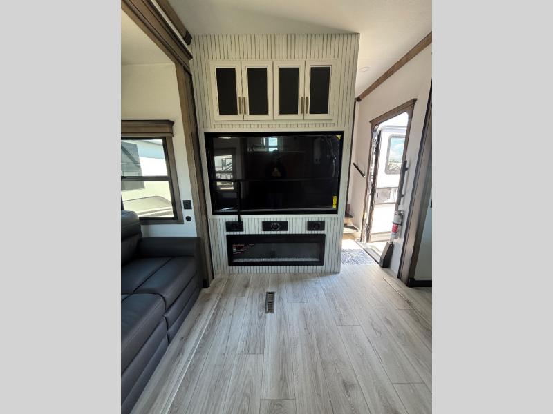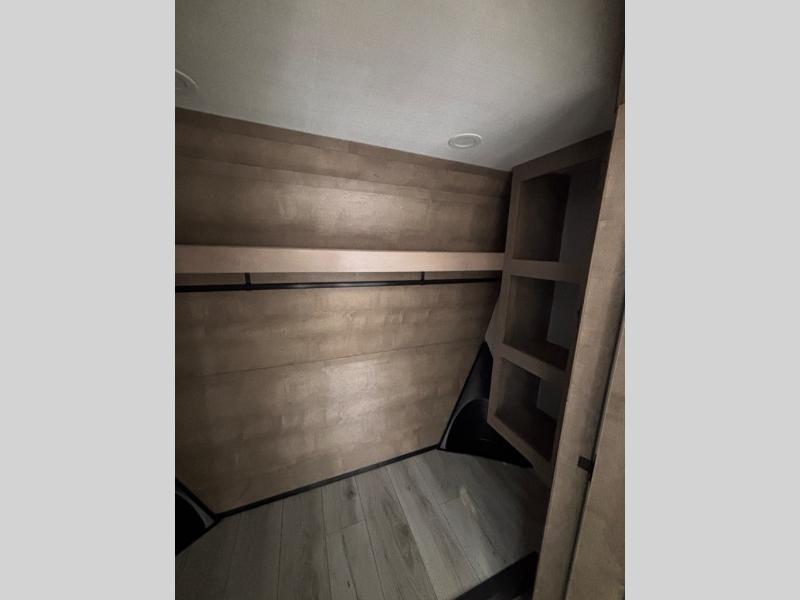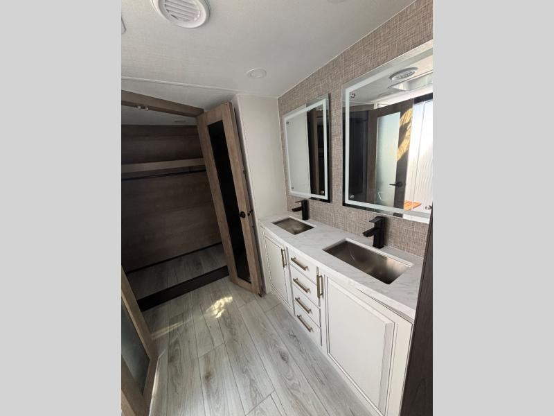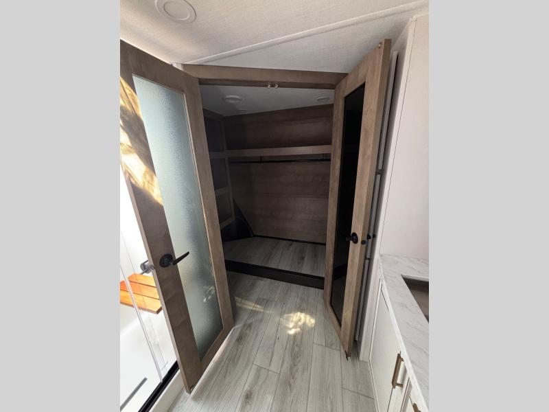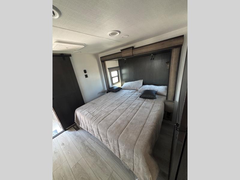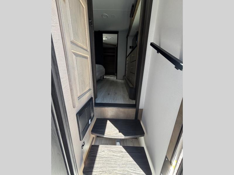 The perfect RV when you like to take "home"' with you when you travel! This Montana fifth wheel gives you the space you want and it feels like home with plenty of features to love and keep you comfortable when you are out enjoying your adventures. Five slides in total give each space plenty of room, the raised rear kitchen has everything you need to cook up meals and snacks just like at home. An 18 cu. ft. residential refrigerator with an ice maker, convection microwave oven and large sink, plus pantry space will make any chef happy. The mid-coach space just inside the door features a living room and half bath for convenience. There is also a pivot dinette within the roadside slide. Step up in front through a sliding barn door to a double slide space with a king bed and dresser. A second sliding door leads into the front spacious master bath featuring dual sinks, a 48" x 30" shower, and a large walk-in wardrobe with washer and dryer prep!