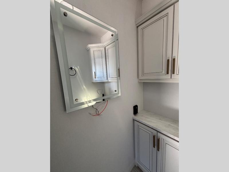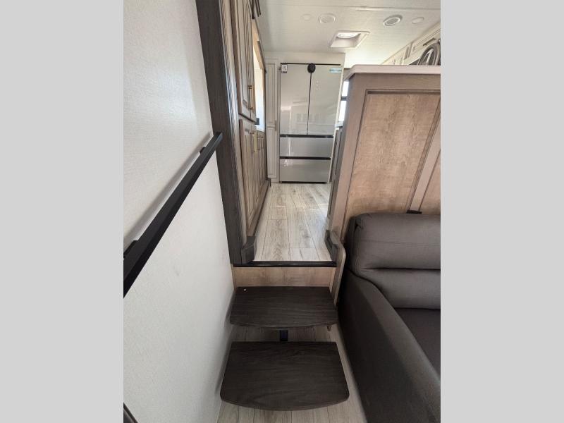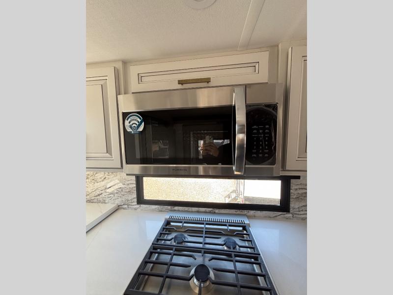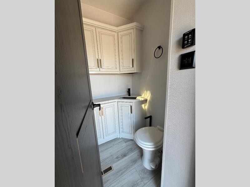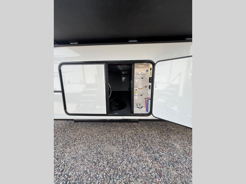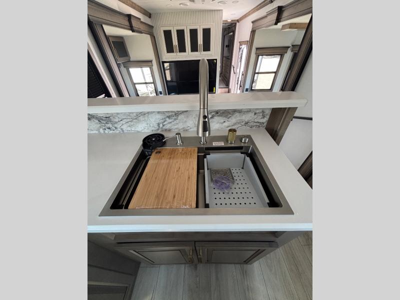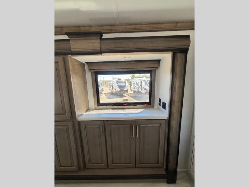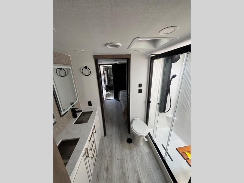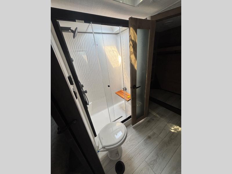 The perfect RV when you like to take "home"' with you when you travel! This Montana fifth wheel gives you the space you want and it feels like home with plenty of features to love and keep you comfortable when you are out enjoying your adventures. Five slides in total give each space plenty of room, the raised rear kitchen has everything you need to cook up meals and snacks just like at home. An 18 cu. ft. residential refrigerator with an ice maker, convection microwave oven and large sink, plus pantry space will make any chef happy. The mid-coach space just inside the door features a living room and half bath for convenience. There is also a pivot dinette within the roadside slide. Step up in front through a sliding barn door to a double slide space with a king bed and dresser. A second sliding door leads into the front spacious master bath featuring dual sinks, a 48" x 30" shower, and a large walk-in wardrobe with washer and dryer prep!